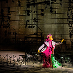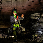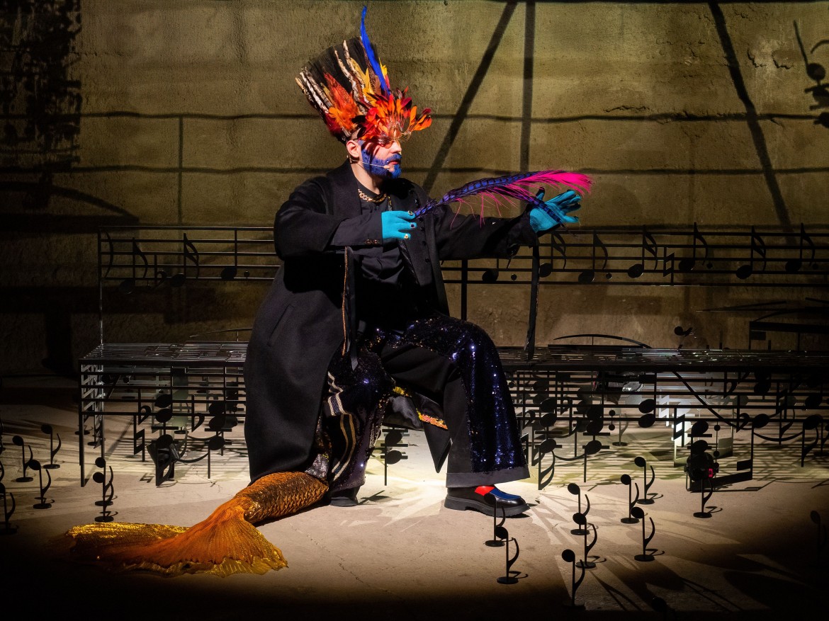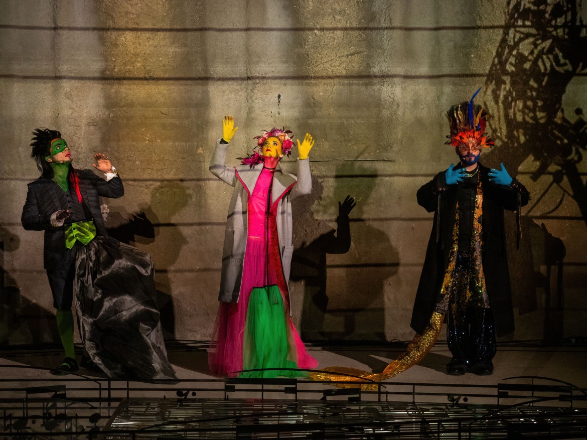 Режиссер поумерил свою страсть к сложносочиненным формам и замысловатым идеям. Он разделил коллектор на три зоны, попеременно выхватываемые лучом света из кромешной тьмы, и усадил в каждой по герою – одного на скамейке, вторую в лодке, третьего в могильной оградке. Сценограф Степан Лукьянов не устроил привычного буйства цвета, а перешел на графику, придумав сделать весь антураж спектакля из черного металла в виде нотного стана и нотных знаков. Даже большая фантазерка по части костюмов Анастасия Нефедова задекларировала: и я буду работать на основе черного цвета. Но – поди ж ты! – все равно вышли из ее рук слепящие всеми цветами радуги то ли марионетки, то ли фантомы с раскрашенными лицами, в фантазийных париках и костюмах не без сюрреалистических затей (у «Шёнберга» рыбий хвост, у «Герстля» черный куль на боку, с определенного ракурса превращающий его в кентавра).