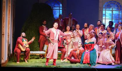 Уточним: в оригинальном либретто молодых прощает князь Святослав, имевший к ним две претензии – героиня, которую он прибрал было в свой сераль, сбежала, а герой, защищая ее, убил княжеского слугу. Зачем режиссер Мария Фомичева решила погубить невинные души, не ясно. Все два часа она безмятежно двигалась по совсем не трагическому пути, поминутно напоминая публике одну интересную подробность: Алексей Николаевич Верстовский был мастером водевиля и, даже замахнувшись, подобно Глинке, на создание русской национальной оперы, впустил в свою «Аскольдову могилу» много разговорных сцен и легкой по меркам XIX века музыки. И пусть его опус поименован романтической оперой – нельзя же всерьез относиться ко всем этим Всеславам, Простенам, Фенкалам, Вышатам, Торопам и Стремидам, обретавшимся в Х веке! Так, по всему, решили в постановочной команде и нашли следующий выход: а заглянем-ка в XIX век, припомним любимый жанр Верстовского да чуть прибавим гротеска от себя. И вот уже развернул аккордеон один «гусар», взялся за гитару другой, вывалили на сцену их сотоварищи в