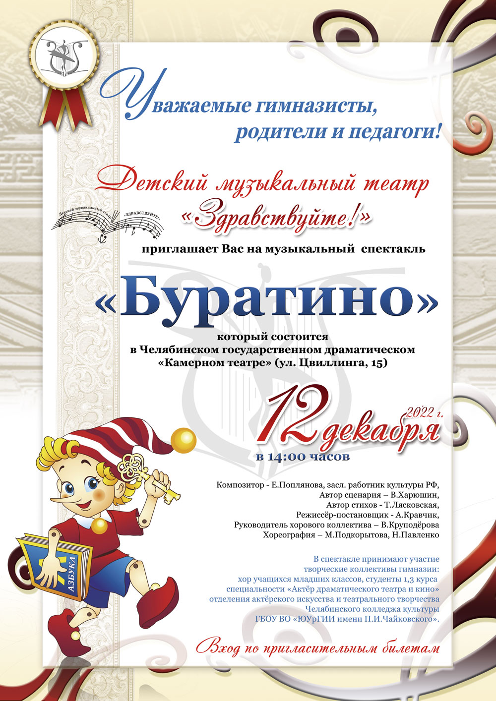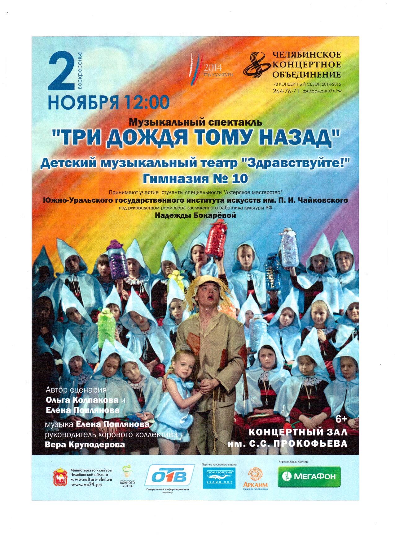 «Летом 2022 года мы получили официальный сертификат на регистрацию театра в общем реестре школьных театров. Но мечта о создании детского музыкального театра свершилась давно: 18 мая в 2014 году на сцене Челябинского камерного театра состоялась премьера музыкального спектакля «Три дождя тому назад…» (режиссер Надежда Бокарева). Мы считаем этот день Днём рождения нашего школьного театра, – рассказывает руководитель театрального проекта, директор Гимназии № 10 Инна Владимировна Осипова. «С тех пор в репертуаре театра появилось еще 3 музыкальных спектакля, которые успешно прошли на различных сценических площадках: спектакль «Я рисую…» (режиссеры Надежда Бокарева, Татьяна Анашкина); спектакль «Как стать волшебником или как Незнайка талант искал…» (режиссер Вячеслав Харюшин), где впервые совместно с музыкальным материалом на сцене мы увидели актерскую игру детей, носовских персонажей; спектакль «Буратино» (режиссер Вячеслав Харюшин), премьеру которого зрители увидели в 2022 году в День театра. В этом учебном году активно идет работа над постановкой нового музыкального спектакля «Чиполлино», в мае 2023 года мы ждём премьеру. Музыку для спектаклей пишет композитор Елена Поплянова, член Союза композиторов России, которая работает в нашей гимназии: ее мастерство и профессионализм помогают максимально точно выражать на сцене замысел режиссера, а также учитывать индивидуальность и особенность музыкального номера для конкретного ребёнка. В работе над постановочной частью спектакля занято от 5 до 8 педагогических работников – это хормейстер, педагоги дополнительного образования по хореографии, актерскому мастерству, концертмейстеры. При создании спектакля мы привлекаем студентов колледжа культуры, что в свою очередь помогает нам в работе – это, своего рода, наставничество, которое помогает школьникам перенимать опыт и практические умения профессионалов, а студентам дополнительно получить основы сценической и педагогической практики. В работе над спектаклем весомую помощь оказываю родители учащихся. Они становятся незаменимыми участниками творческого процесса. Порой не замечая этого, они оказывают огромное влияние на создание сценического образа персонажа или организацию гастролей. Они гримируют артистов, помогают быстро переодеваться хореографам, «гастрономически» поддерживают! Родители являются полноправными участниками спектакля, проживая его от момента зарождения до сценического воплощения. Мы всегда их благодарим со сцены».