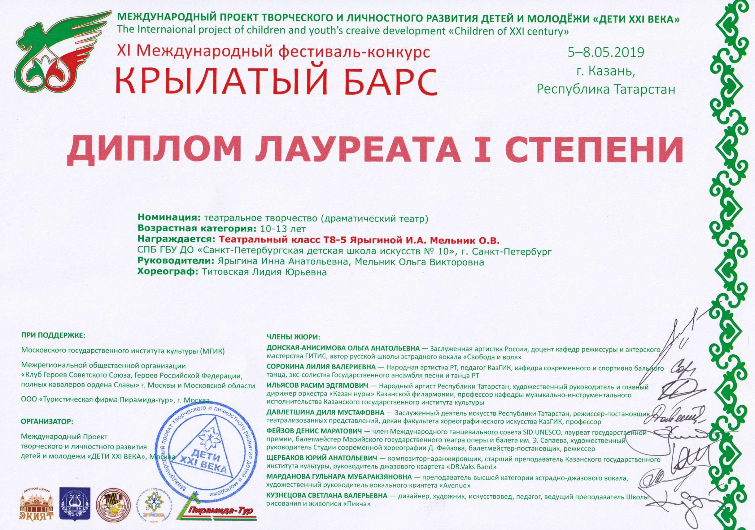 - Мы регулярно участвуем в творческих состязаниях. Чтобы попасть на некоторые из этих фестивалей, нужно быть хорошо подготовленными и пройти конкурсный отбор. «Брянцевский фестиваль», детский театральный фестиваль «Б’АRТ’О» в ТЮЗе, конкурс чтецов «Живая классика», фестиваль «Если бы» в Набережных Челнах, конкурс чтецов «Моё любимое стихотворение» им. Н.Г. Красовской, несколько лет назад ездили на фестиваль «Снежный барс» в Казань… Мне довелось поработать над сценической речью во время создания спектакля «Маленькие женщины» по мотивам книги Луизы Мэй Олкотт, режиссёр Инна Анатольевна Ярыгина – это спектакль, в котором участвуют только девочки. Спектакль получился очень красивый, стильный, глубокий, затрагивающий очень важные человеческие проблемы – воспитания, отношений родных людей в семье, о том, как важно мечтать и стремиться к своей мечте... Еще одна постановка Инны Анатольевны – японская сказка, спектакль решен в жанре японского театра, с японской стилистикой и сшуточным, характерным для этого жанра растягиванием слов – спектакль был представлен на фестивалях в ТЮЗе и в Казани. С хореографическим классом, в котором тоже есть предмет «Актерское мастерство», Инной Анатольевной был поставлен спектакль «Кто он?» по мотивам рассказа А.П. Чехова «Из дневника одной девицы».