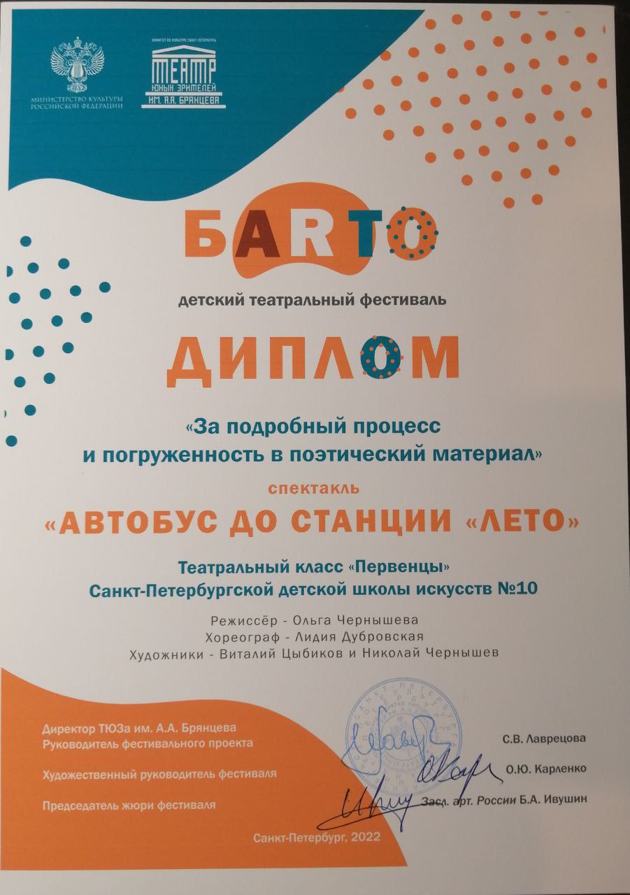 Три года назад мне посчастливилось набрать свой собственный театральный класс, которому я дала название «Первенцы», с ними мы создали уже три работы: «Дашенька, или история щенячьей жизни» по мотивам произведения Карела Чапека, «Мировые БА, ДЕ, НЯ» – это истории про бабушек, дедушек, нянь и детей из разных произведений мировой литературы, и третий, очень важный для нас спектакль «Автобус до станции Лето». – поэтический, по мотивам стихотворений о лете разных авторов. Так сложилось, что нам подарили яркую декорацию – автобус на колесиках, большой, красивый, с окошками. Я стала думать, как его использовать, как обыграть материал, чтобы это было интересно, прежде всего, детям. Нашла стихи, жизненные ситуации, связанные с летом, и мы отправились в это путешествие. К созданию и поиску кукол, реквизита, костюмов подключили родителей, получилось живо, легко, азартно. Есть истории и про невыносимую жару, и страшилки у костра, и даже история первой детской влюблённости и вынужденном расставании, связанном с окончанием лета. С этим спектаклем мы участвовали в фестивале «Б’АRТ’О» в театре Юного Зрителя, это был для нас очень важный, интересный опыт. Сейчас поступило предложение записать на Радио России аудиоверсию спектакля, надеюсь, у нас это получится.