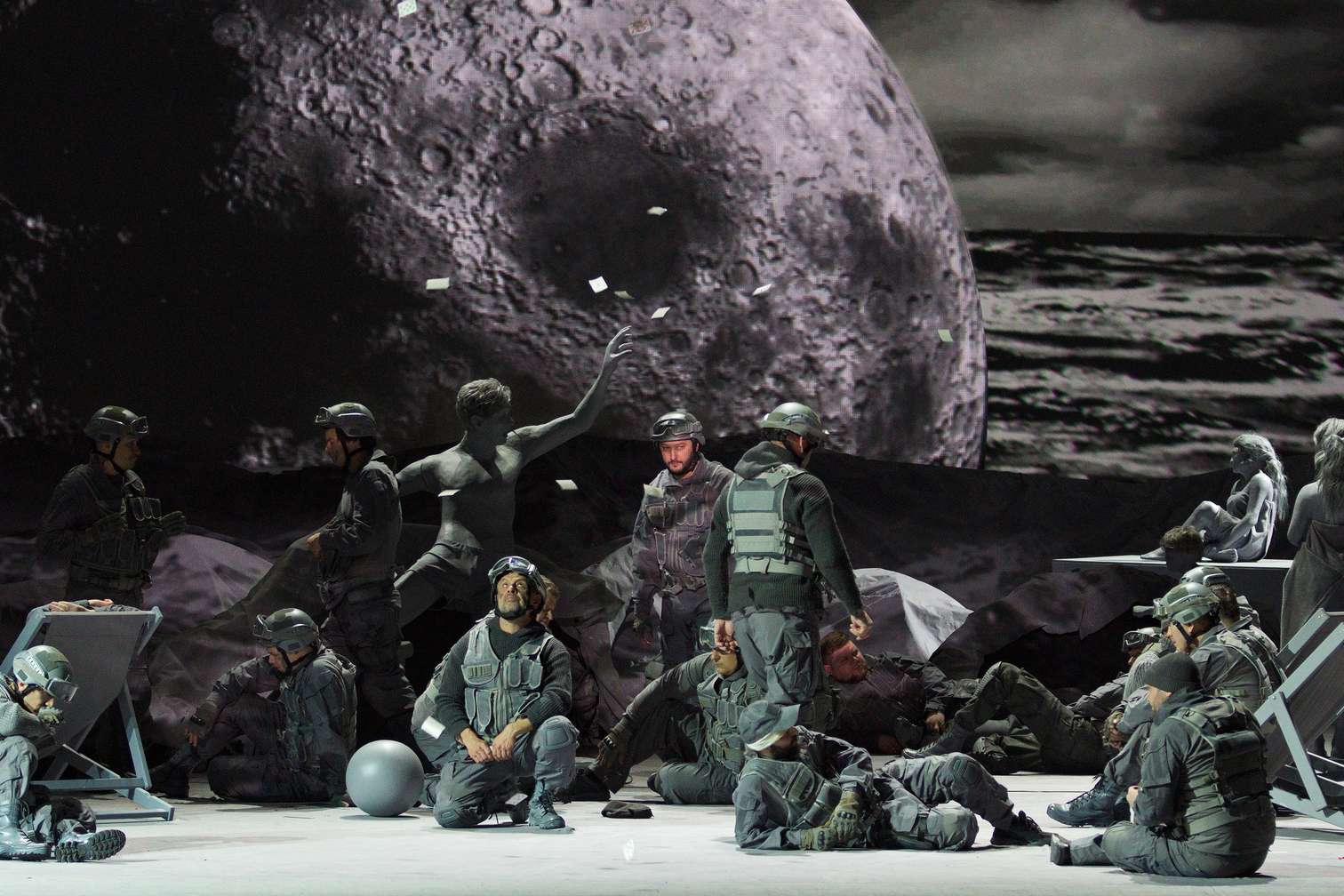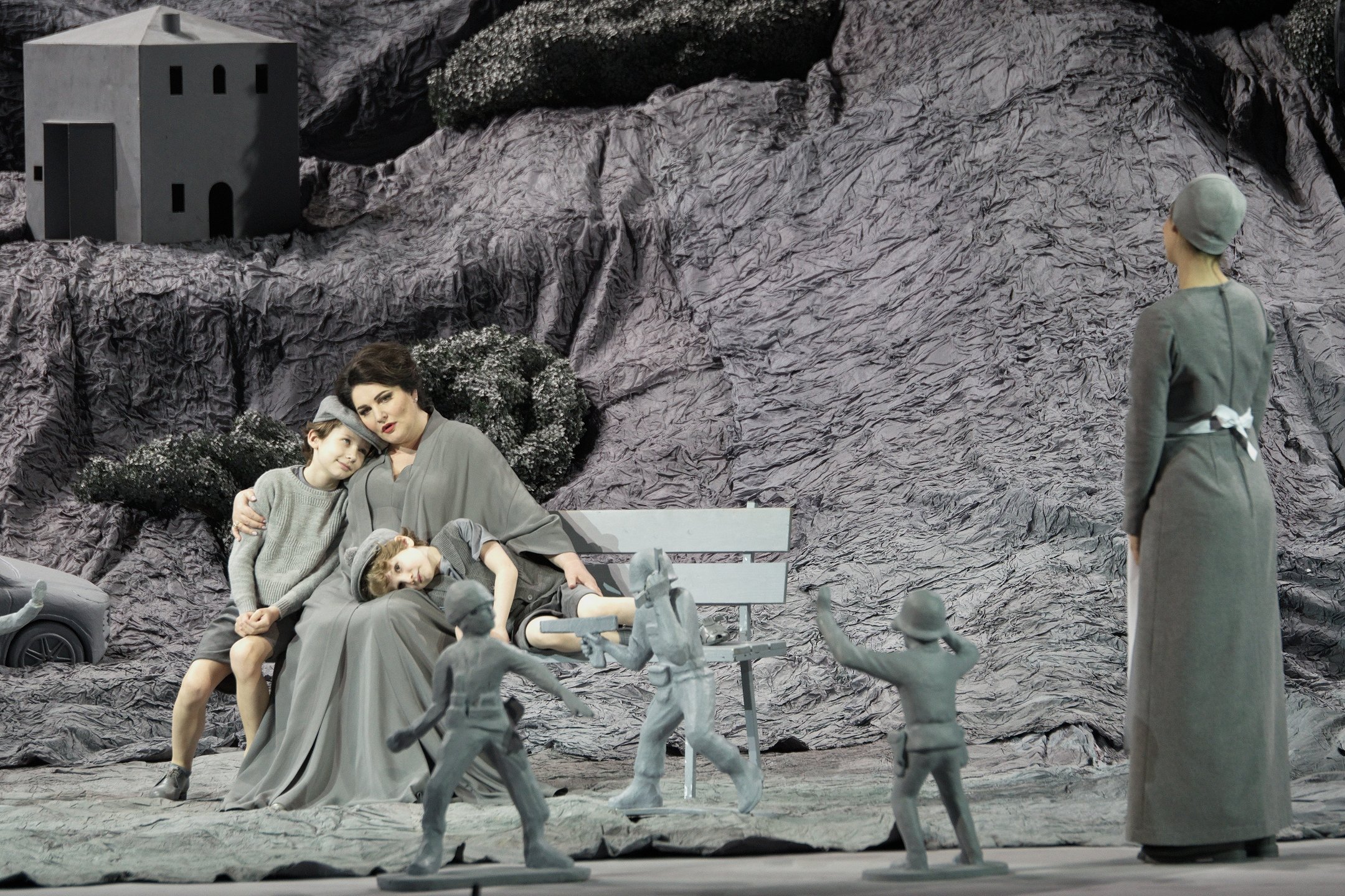Как так? Вот же единая цветовая гамма — серая, как свет Луны, которой поклонялись друиды, с редкими вкраплениями красного, белого, черного. Но слишком разными по эстетике были сами картины (безусловно, одобренные режиссером). Инфернальный, неописуемой красоты графичный лес, где собираются галлы, сменится наивным, как рождественский вертеп, пейзажем за спиной Нормы: миниатюрные горы и пади, деревья, домики, фигурки людей и животных. Но дать нам понять, что живет Норма на отшибе, храня от всех свою тайну — двоих детей, можно было бы и потоньше, без превращения пейзажа в тяжелое нагромождение разнообразных форм. Потом «на пять» нарисуется по-спартански лаконичная комнатка героини — потерянная в огромном сценическом пространстве, как потерян человек пред роком и черной пропастью вселенной, где обретаются равнодушные боги. Далее нас переправят вновь в сложносочиненную теснину — теперь уже на пляж, где чего только нет. Скульптуры волейболистов в семейных трусах, зависший над видеоморем военный вертолет, что-то круглое, похожее на огромную мину и одновременно на упавшую в воду Луну, расслабившиеся солдаты, девушки, открывшие, наконец, плечики, — тут, по всему, про то, что ничто человеческое и тоталитарному обществу не чуждо. Такая вот передышка перед финалом, где должно громыхнуть из всех залповых орудий: откроет народу тайну своей запретной любви Норма и пойдет добровольно на костер, а с ней — и изменщик Поллион, разобравшийся, наконец, кого на самом деле любит. Но залп выйдет холостым. Усядутся любовники на какой-то скамейке, крепко повязанные страховочными поясами, и поедут в языках пламени вверх, в небеса, где откроется первая за весь спектакль яркая, цветная, солнечная картина. Утри, зритель, слезу, во вселенском масштабе всё хэппи энд: в раю они, в раю.