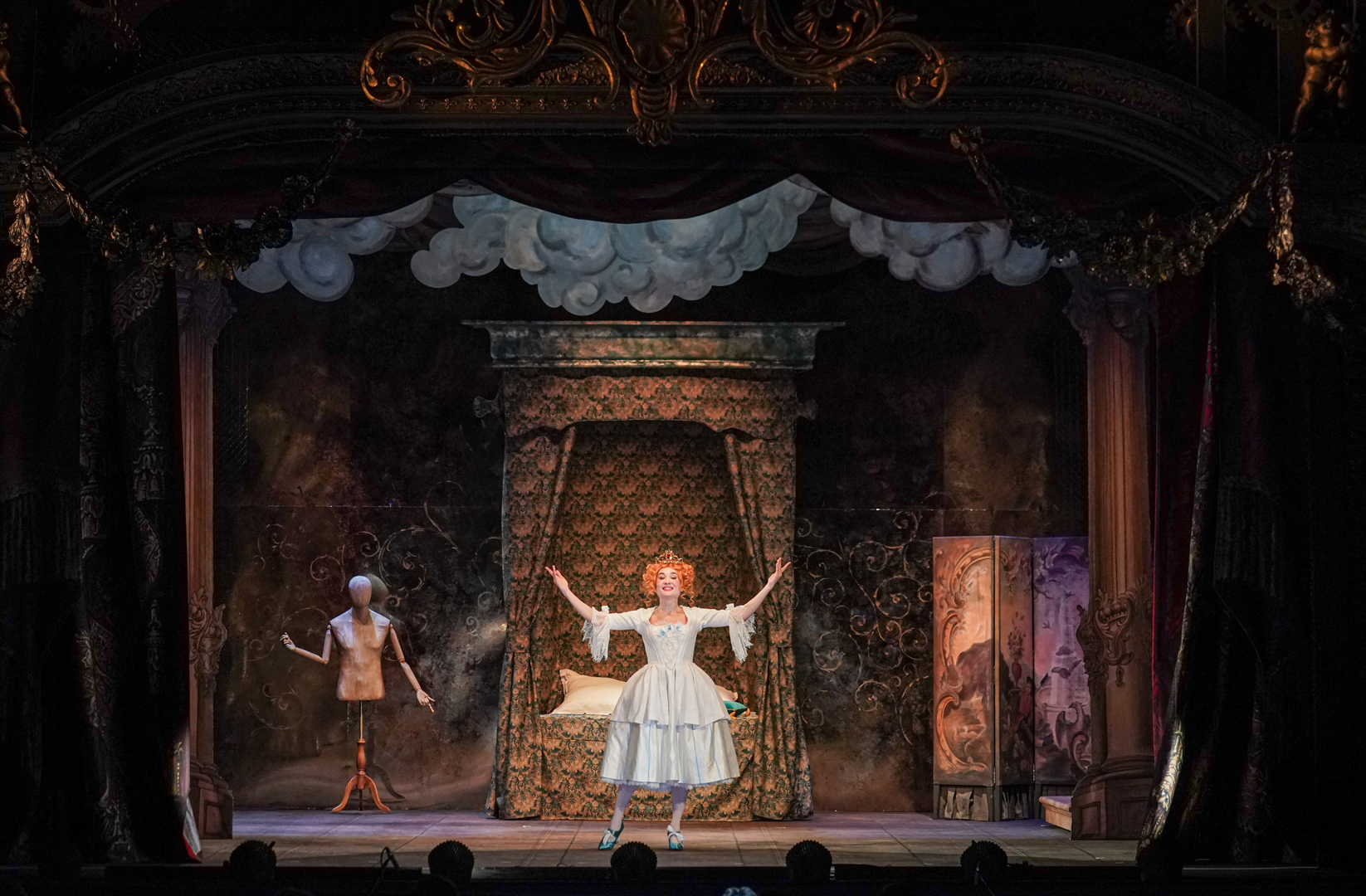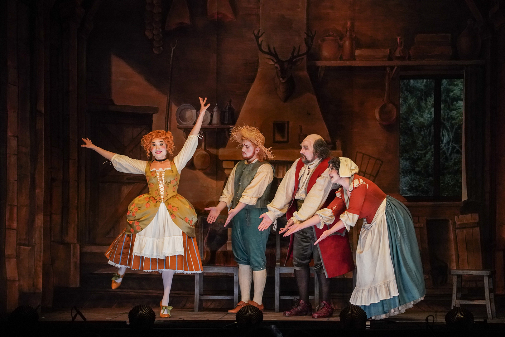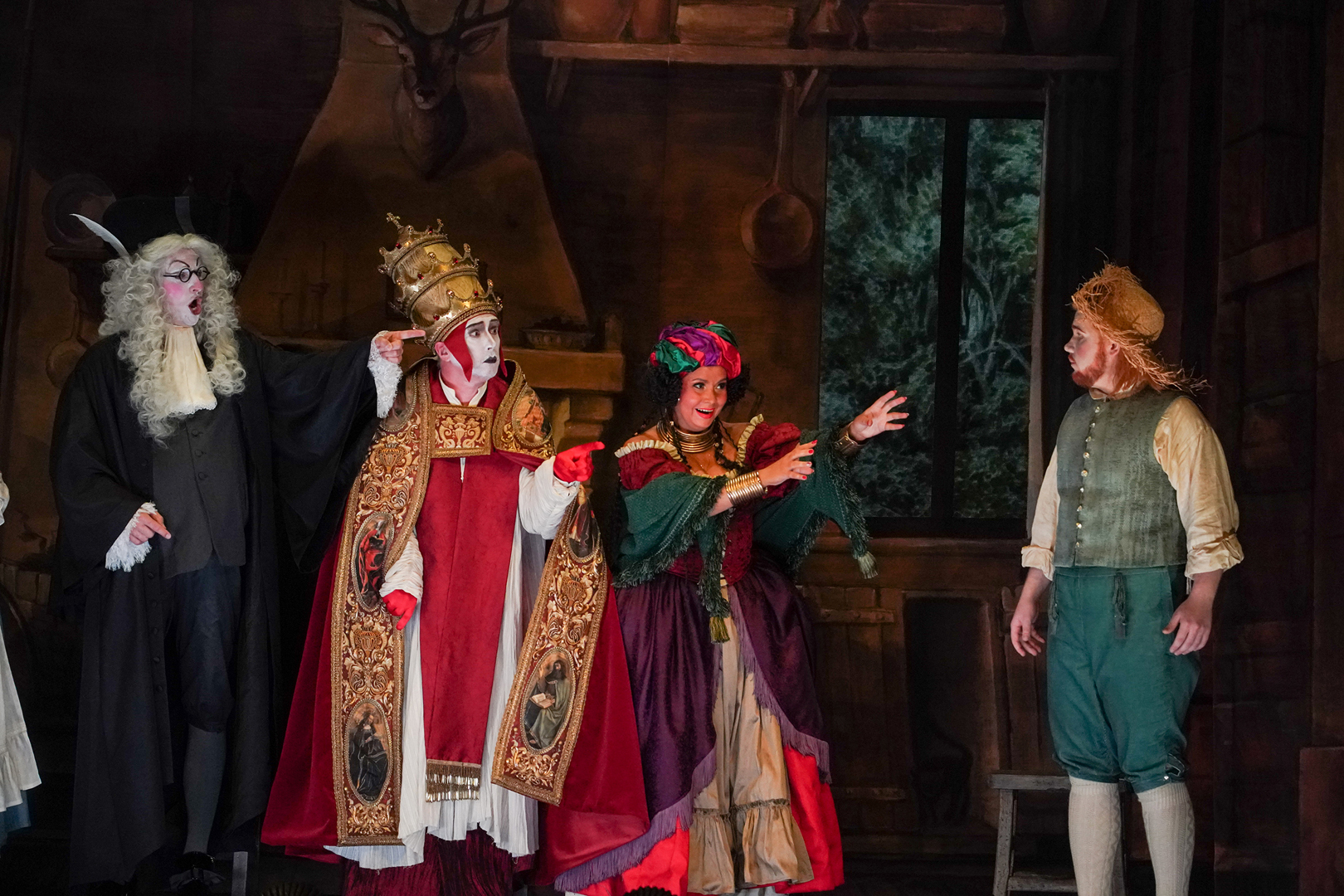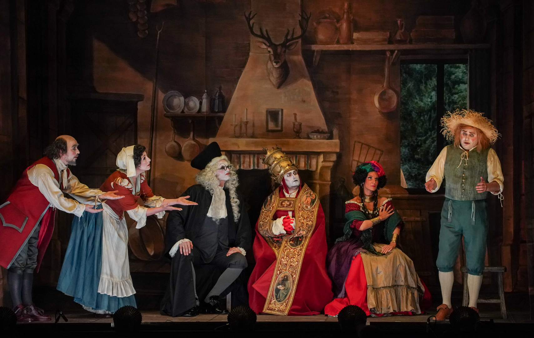 Вот-вот — подхватит режиссер постановки Юрий Муравицкий: и действовали в ней поначалу персонажи, близкие маскам комедии дель арте. А потому пожалуйте в «театр в театре» с роскошным барочным занавесом и порталом, украшенным золочеными лепниной и амурами, на сцене которого явится нарочито простодушный спектакль, какими тешили публику площадные лицедеи. Вот шустрая прелестница Коломбина, выведенная под именем Розалина и определенная в семью мельника, а вот брошенный ею страдалец Арлекин, которого здесь зовут Коломбелло. Есть Гадалка, Священник и Судья, так и не сумевшие склеить союз молодых, и есть наивные родители невесты, которые, спасая ее будущий брак, отправятся за подмогой к самому Королю. Раз глупышка влюбилась в него при случайной встрече в лесу — ему и разводить беду. Однако монарх, видом совершенный Людовик XIV в зените славы, вдруг заинтересуется неизвестной пейзанкой и захочет провести с ней ночь. И вот она уже у его ложа в полной экзальтации: «Не то что тело, жизнь готова отдать тебе, о солнцеликий!» Но из-за ширм выйдет к ней шаркающей походкой некто лысый, сменивший перья и раззолоченные одежды на халат. Пейзанка в ужасе. Несостоявшийся любовник тоже — но уже от мысли, что кто-нибудь еще узнает о его интимных секретах. Со страху владыка отправляет Розалину, осознавшую, что любит она только своего Коломбелло, под венец, поспешив щедро одарить.