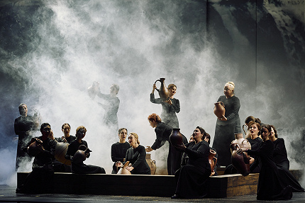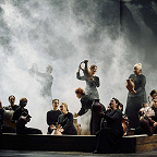 А вот постановка столь однозначно удачной не показалась. Режиссер Елизавета Корнеева и ее команда (декорации – Екатерина Агений, костюмы – Жанна Усачева, свет – Валентин Бакоян, видео – Анастасия Андреева, хореография – Константин Хлебников) решили подчеркнуть ораториальную и символистскую сущность оперы и, кажется, перестарались. Получилось почти концертное исполнение, где статика хора и солистов оживлена гимнастическими экзерсисам и не слишком эстетичной хореографией, что драме в целом не очень помогает, – действие тянется вяло. Не разнообразят его ни цветовое решение (почти все в этом спектакле черно-белое: идея понятна, реализация навевает скуку), ни гигантские проекции (то Ниагарский водопад вместо тихой Арагвы, то христианский храм почему-то на «рентгеновском» снимке, то есть данный инверсией черного и белого; то обилие молодых мужских и женских лиц крупным планом – интерпретировать их появление в спектакле можно тысячью способов, так и не разгадав загадки режиссера), ни несколько претенциозные пластические вставки.
