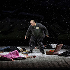 В меньшей степени – Станислав Мостовой и Алексей Антонов. Первый, когда-то бывший блистательным Ленским, в небольшой партии Рулевого выступил характерным с долей комического тенором, благодаря чему и слился с богомоловским антуражем. Второй, с полновесным басом и хорошей культурой звукоизвлечения, набросал-таки портрет проворного по части выгоды папаши Дональда. Но ему раздваиваться и не пришлось: к этому подвигал сам Вагнер при попустительстве Богомолова, как-то не придумавшего нацепить на этот персонаж маску зайчика или человека-паука – может, потому что сосредоточился на титульном персонаже. Но исполнитель партии Андрей Борисенко с не очень выразительным, без темных инфернальных оттенков голосом будто ушел в глухую оборону: формально все исполню, но тайну своего истинного отношения к происходящему унесу в могилу. И это, не исключено, был лучший ход из возможных. Потому что те, кто пытался ввязаться в богомоловскую игру, выглядели актерски самыми беспомощными – слишком неподъемные задачи та игра предполагала. В итоге Анжелика Минасова – Сента запомнилась лишь как достойная певица (но с оговоркой: сосредоточенная исключительно на себе, в ансамблях она перекрывала всех и вся), а Хачатур Бадалян в партии ее несостоявшегося жениха отметился одной гитарой, с которой режиссер отправит его на Грушинский фестиваль. Хотя и там резкий, порядочно раскачанный тенор нового барда едва ли проникнет в душу трепетным поэтессам и социально заточенным менестрелям.