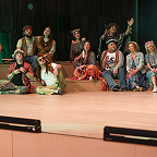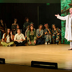 Если с текстом визуальный ряд особого противоречия не выказывает, то с музыкой – еще как! Земфира, поющая под гитару в бардовской манере куплеты про ревнивого мужа, смотрится весьма пародийно. Вместо ярких цыганских танцев, самых эффектных номеров «Алеко», режиссер предложила мучительно долгое топтание массовки по сцене: хиппи нюхают травку и под ее чарами не знают, куда себя приткнуть, слоняясь из угла в угол. И в целом сочная партитура Рахманинова находится в непреодолимом противоречии с тем, что мы видим на сцене, а отсюда – прямая дорога к театральной фальши, потому что самая изысканная режиссура должна в первую очередь слушать музыку, ее характер и настроения и выстраивать свои параллели или перпендикуляры, основываясь на ней, а не противореча ей, иногда отталкиваясь от нее, но не отрицая ее.