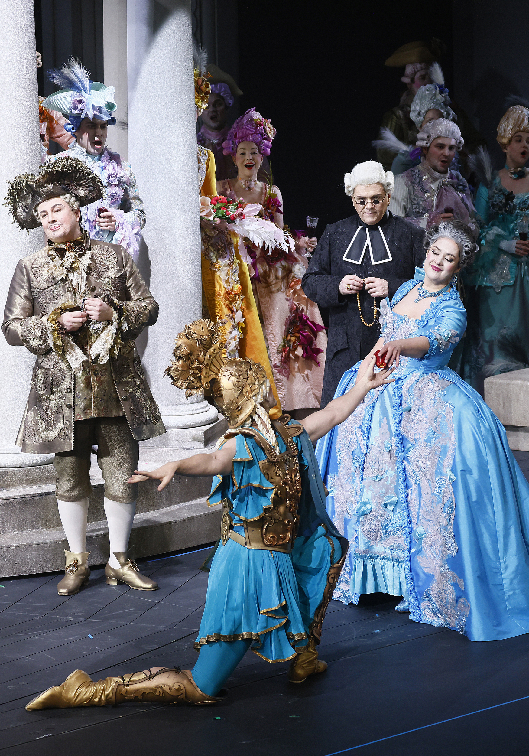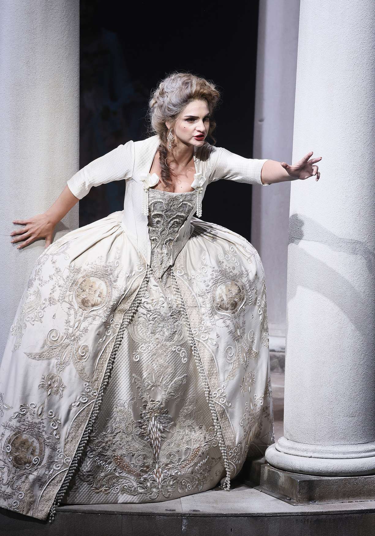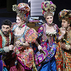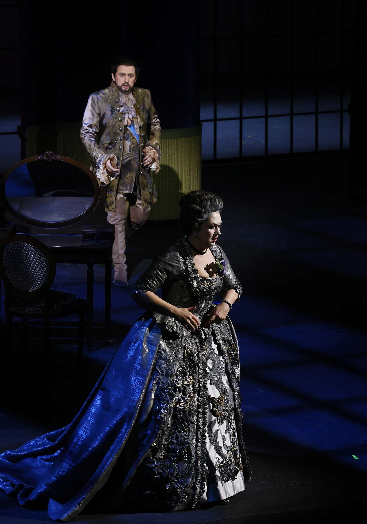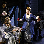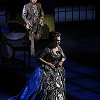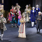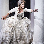 Вместо дежурных пальто и нехитрых платьиц вне моды и времени, в которых ныне передвигается по подмосткам население чуть не всех опер мира, — пышные кринолины, расшитые камзолы и шляпы с перьями (от художницы Виктории Севрюковой). И героиню не перевели в продавщицы или обитательницы борделя. Она та, какой ее представили авторы, — актриса «Комеди Франсез» Адриана Лекуврёр. Столь же реальная, как Сара Бернар, и столь же прославленная в истории французского театра, как та.