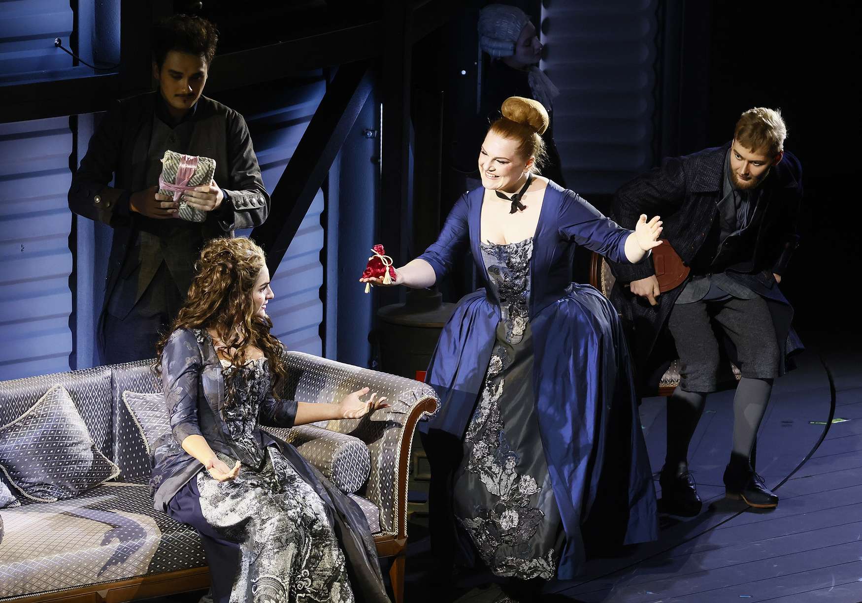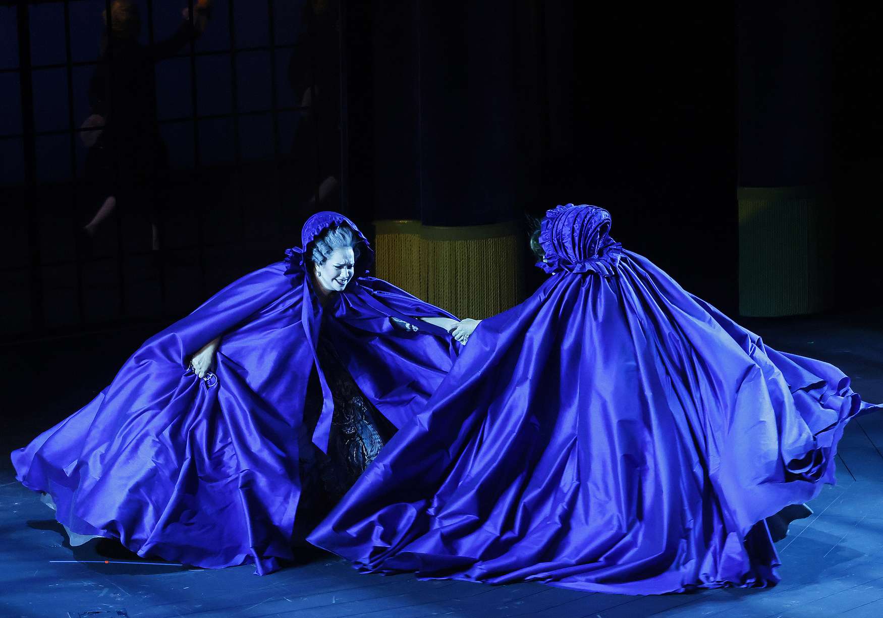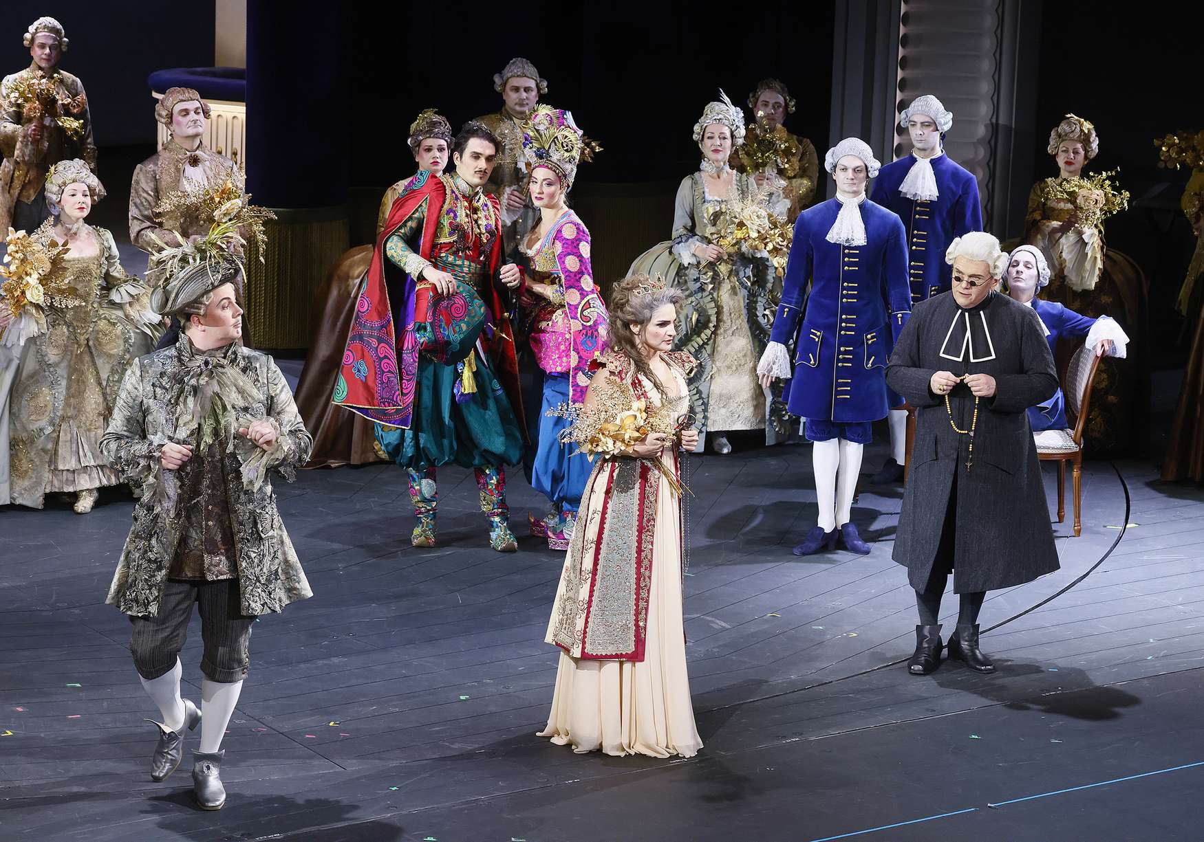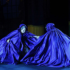 Вместо дежурных пальто и нехитрых платьиц вне моды и времени, в которых ныне передвигается по подмосткам население чуть не всех опер мира, — пышные кринолины, расшитые камзолы и шляпы с перьями (от художницы Виктории Севрюковой). И героиню не перевели в продавщицы или обитательницы борделя. Она та, какой ее представили авторы, — актриса «Комеди Франсез» Адриана Лекуврёр. Столь же реальная, как Сара Бернар, и столь же прославленная в истории французского театра, как та.