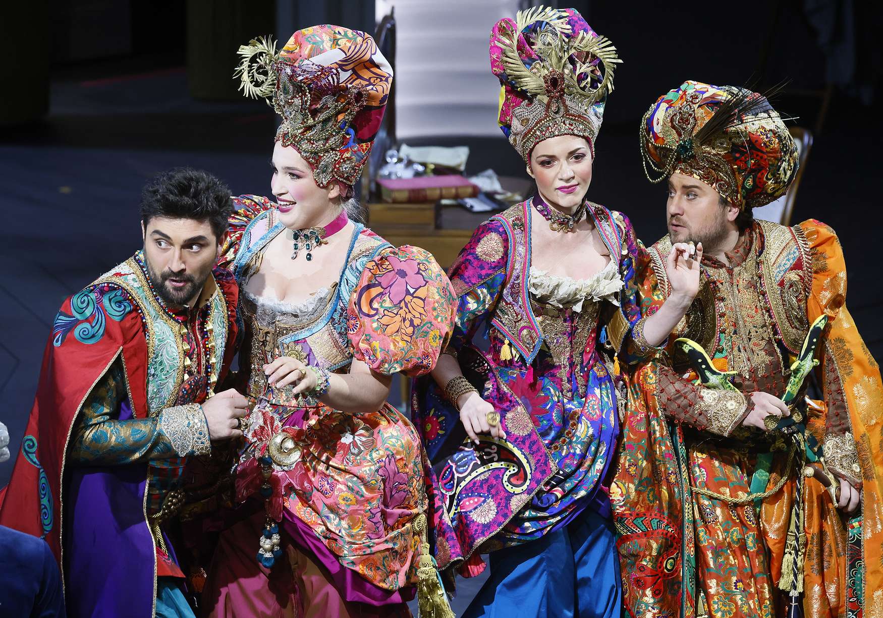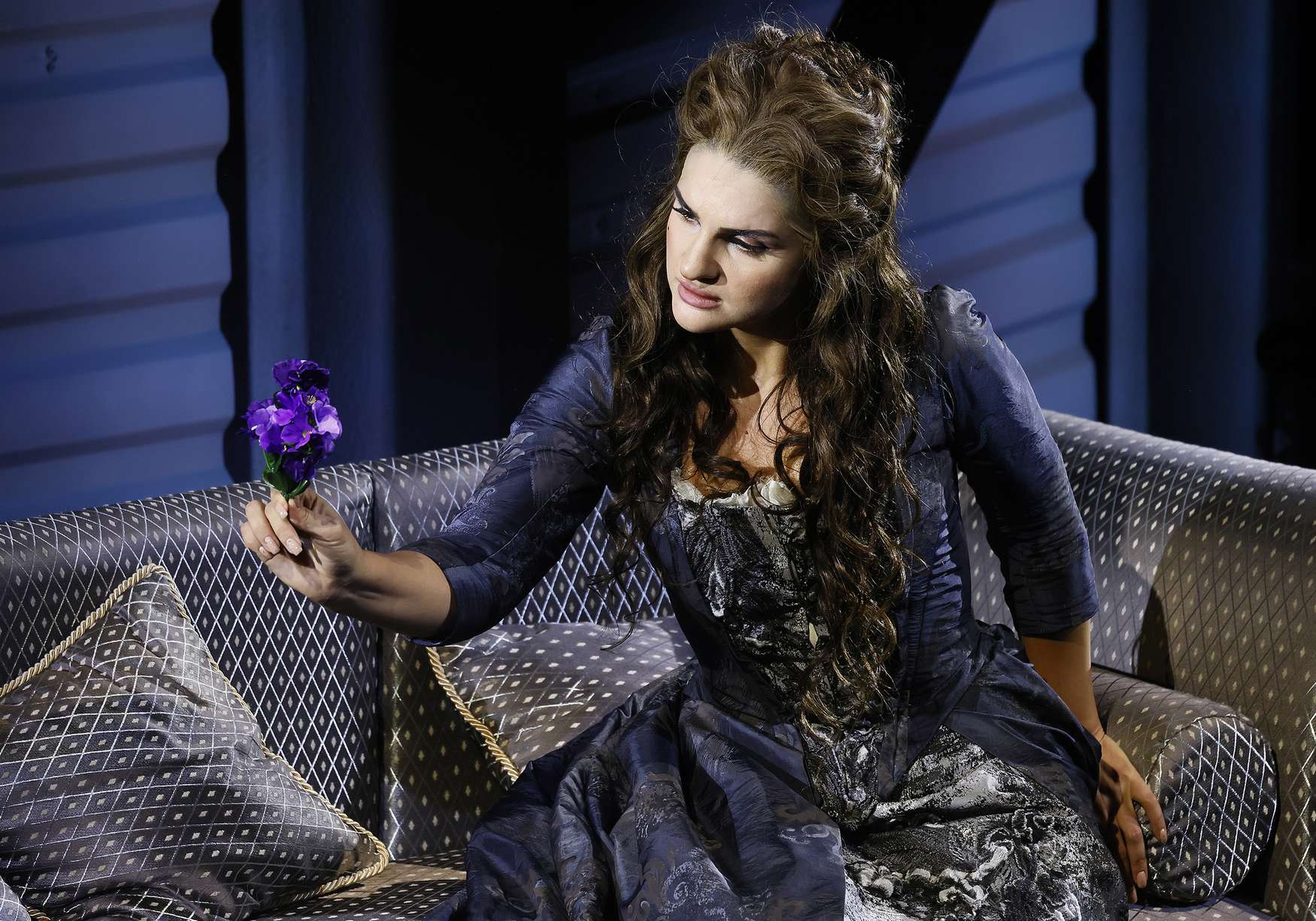 В первом акте на сцене — сцена, повернутая к публике закулисьем с гримерными столиками (художник — Зиновий Марголин). Тут суетятся перед выходом актеры, а на заднем плане они, включая героиню, будут играть перед публикой, оборотившись к воображаемой лицом, а к реальной, обосновавшейся в креслах Исторической сцены Большого, — спиной. Играют «как бы» — манерно поводя ручками и неловко сходясь в то, что мизансценами даже в самых буйных фантазиях назвать проблематично. Не такой ли театр отвергала в свое время Адриана Лекуврёр?