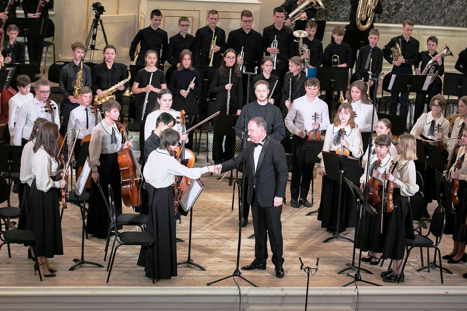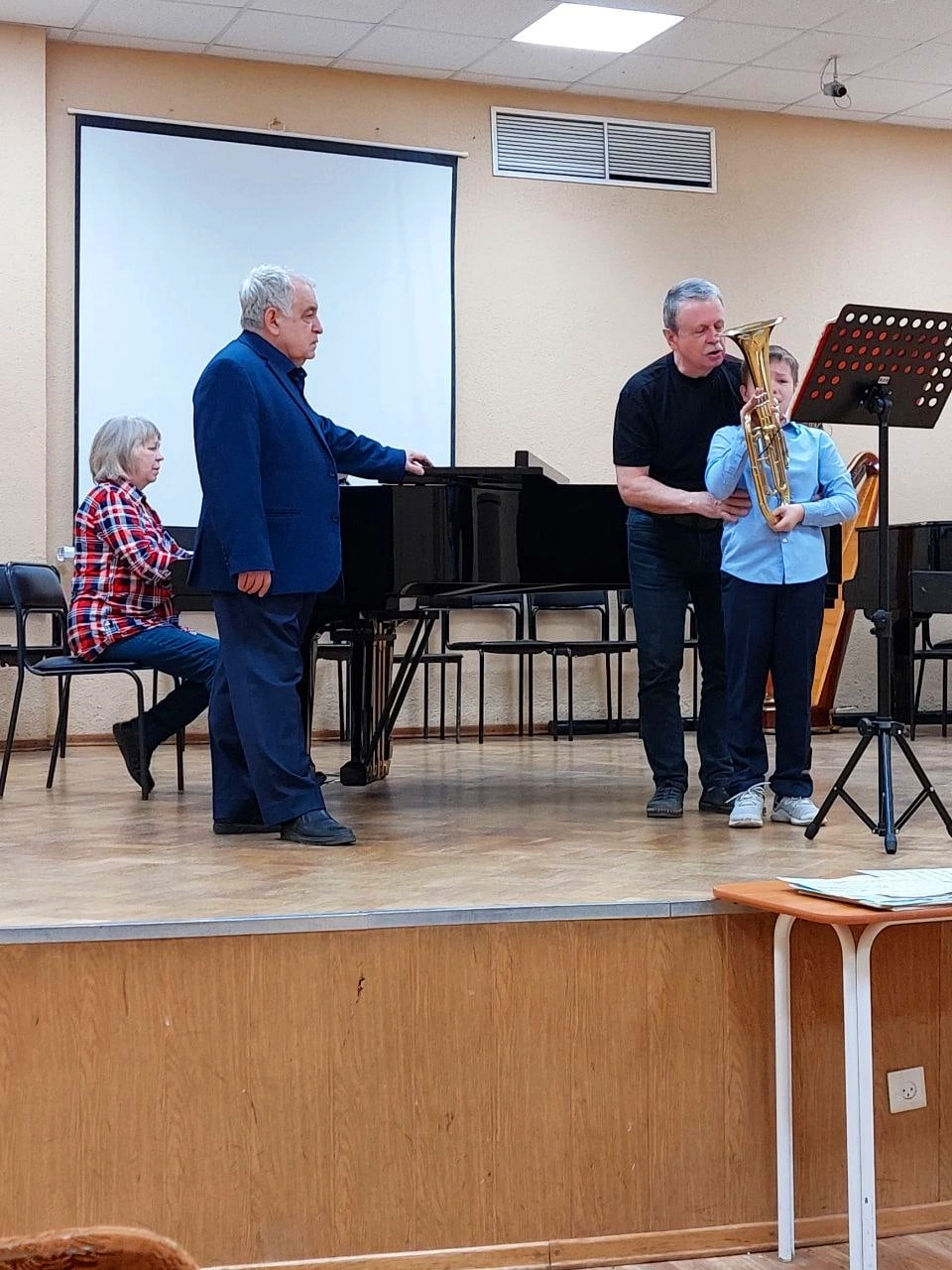 Еще одна идея директора – вывести преподавателей и концертмейстеров школы на концертную сцену. Реализация этой идеи сейчас успешно происходит: в 2022 году был проведен первый концерт преподавателей и концертмейстеров, посвященный Дню учителя. А уже в 2023 году преподаватели и концертмейстеры ДШИ № 4 выступили в Малом зале филармонии им. М. Глинки Санкт-Петербургской академической филармонии имени Д.Д. Шостаковича. Концертная деятельность так захватила преподавателей и концертмейстеров, что они создали действующие коллективы – струнный ансамбль и ансамбль духовых и ударных инструментов, в котором в качестве исполнителя на трубе выступает и сам директор.