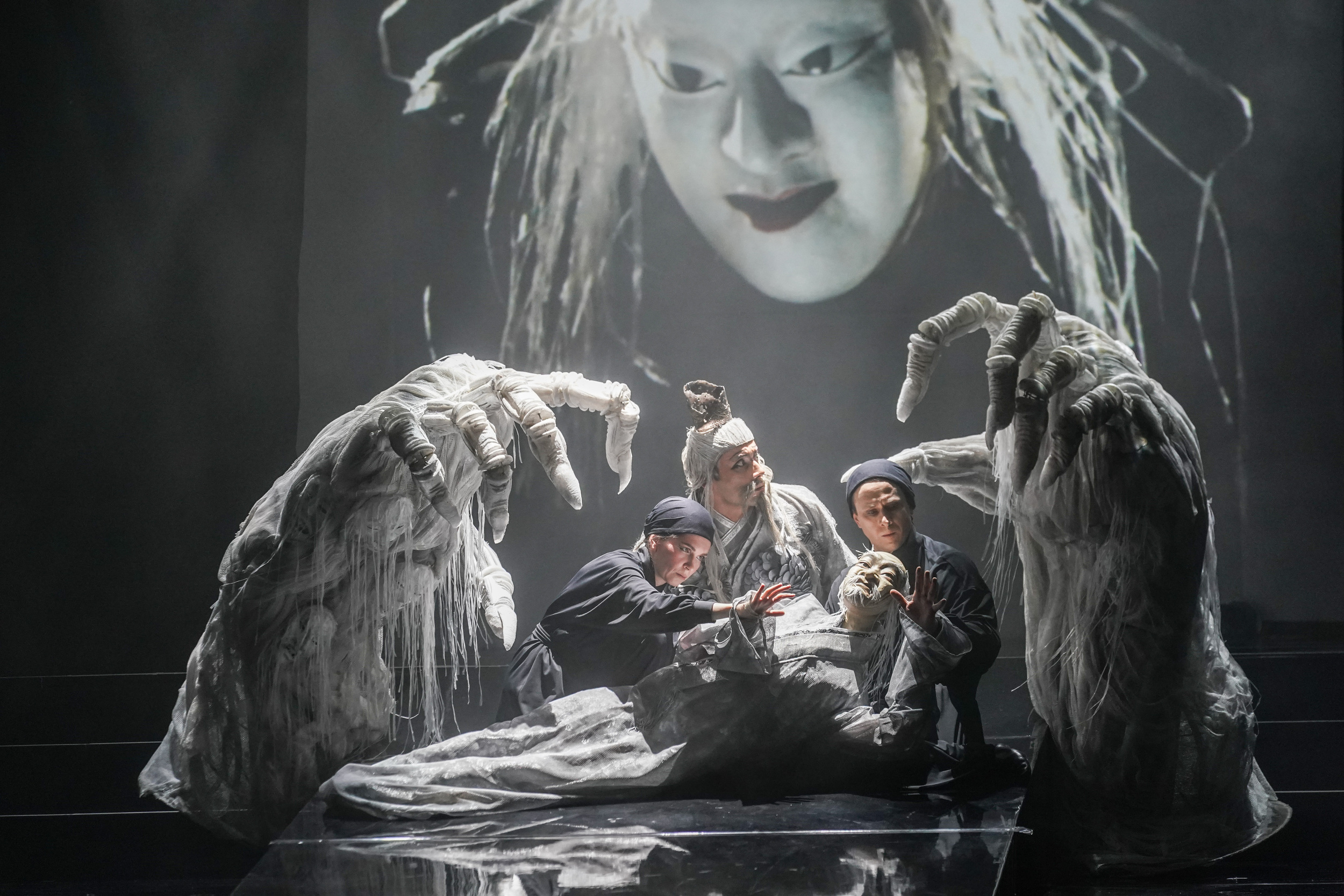 Взглянуть на сцену – там ошеломляющая феерия от художницы по костюмам Виктории Севрюковой и художницы по гриму Татьяны Величкиной. «Соловья» от рождения скрещивали с балетом – тут попробовали произвести эту операцию с куклами. Они появлялись и в «Сыне мандарина», но лишь расцвечивая историю в теневом театре. На этот раз их превратили в главных действующих лиц (за которые взялся отвечать Центральный театр кукол имени Образцова). С одной стороны, ничего удивительного в таком развороте нет: марионетки вхожи в оперный спектакль давно, в том числе и у нас. Еще недавно такими опытами занимался театр «Тень», сегодня эстафету подхватил столь же маленький и отважный «Трикстер». Но поставить все на куклу там, где красуется лейбл «Большой театр», – смело.