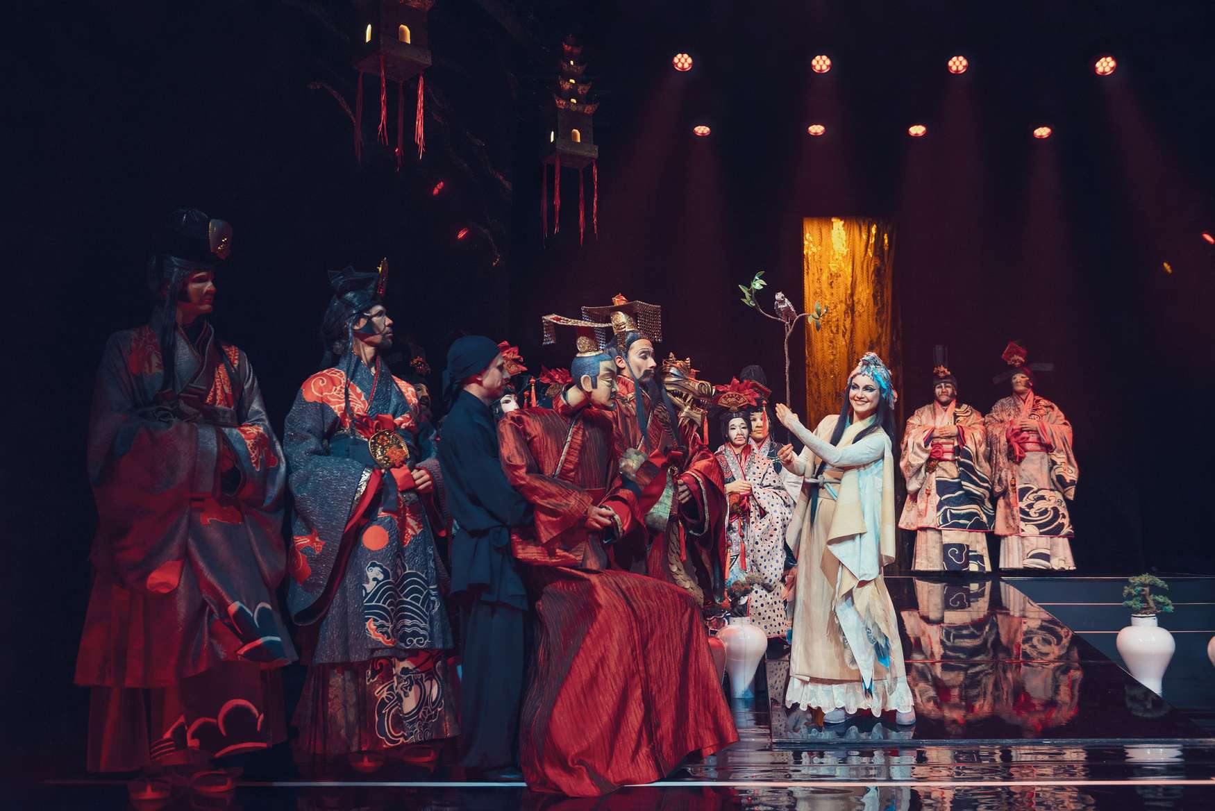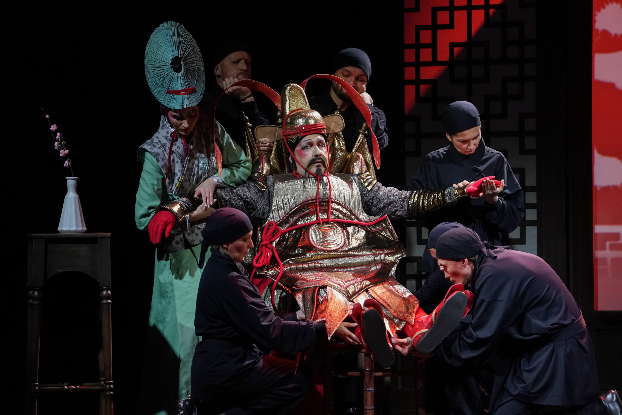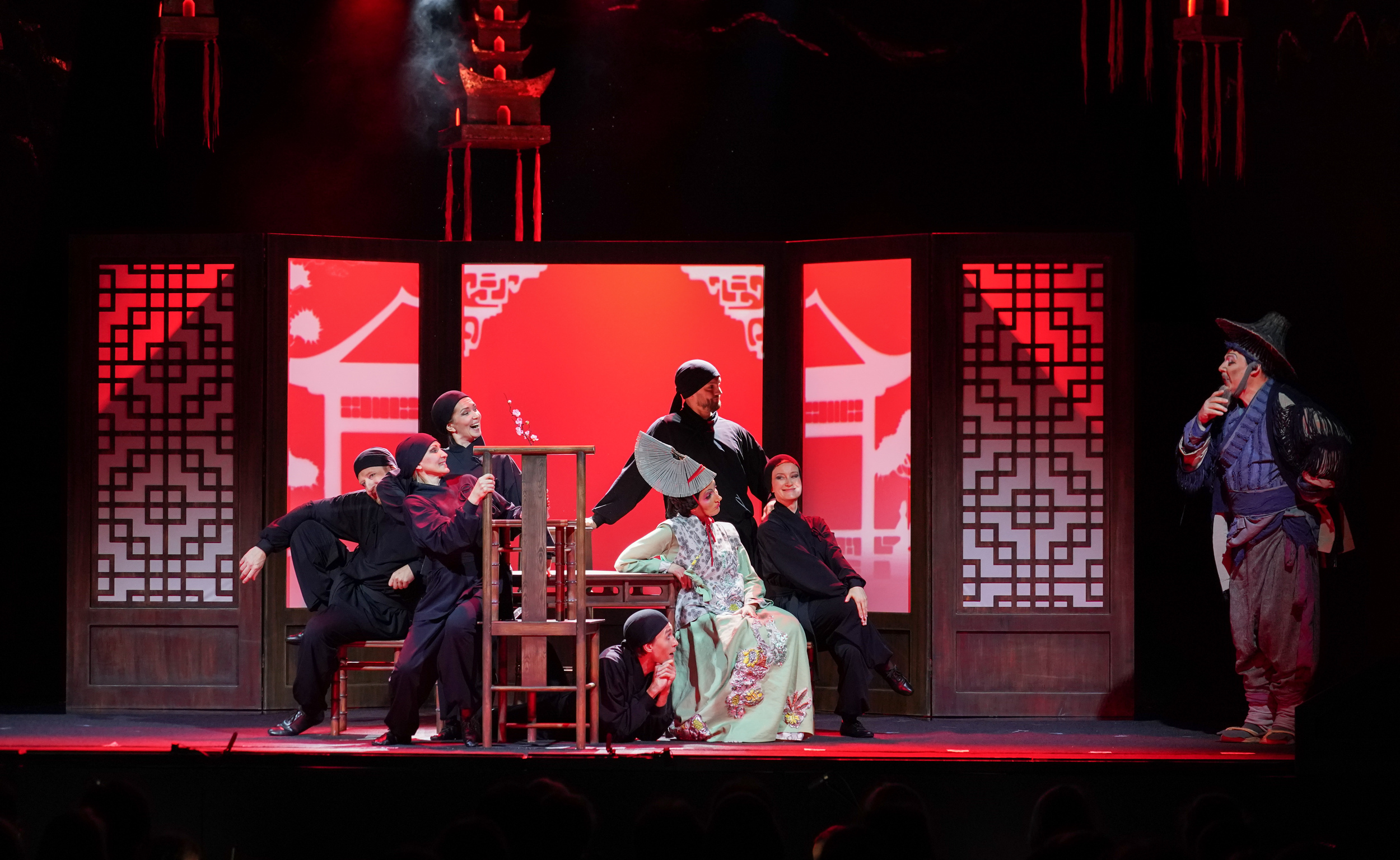 В противовес закаменевшей китайской группе, жизнь на сцене и за ней, где-то там, где рождались идеи, била ключом. Начнем с того, что для постановки опус решили освежить: новую оркестровку заказали композитору Валерию Кикте, за актуализацию либретто взялась Кей Бабурина. Оба преуспели. В диалогах хорошо уловлена стилистика комедии дель арте (по образу и подобию которой писалась опера). В музыке тон задаст «игрушечный» барабанный бой, прозрачно намекнувший: будем шутить и дурачиться, – сверх того поприбавится «китаизмов». Но особые изыски для уха не приготовлялись. К чему они бесхитростному сюжету про то, как богатый Мандарин, ищущий на старости лет своего изгнанного сына, находит его в трактире, где тот бегает в слугах, не имея никаких шансов повести обожаемую дочку хозяина под венец.
