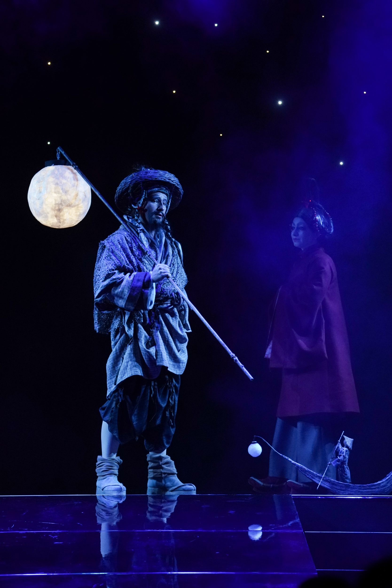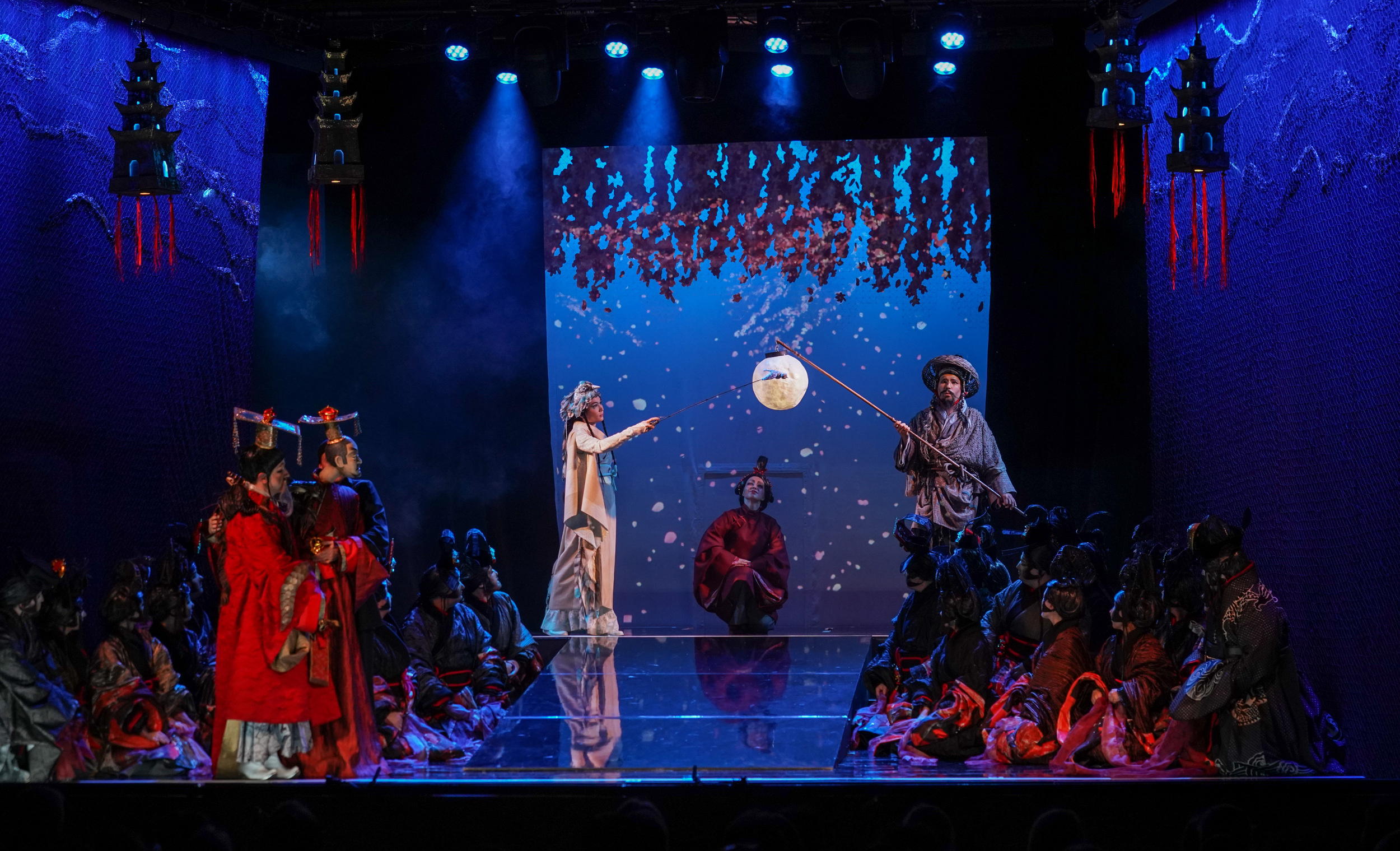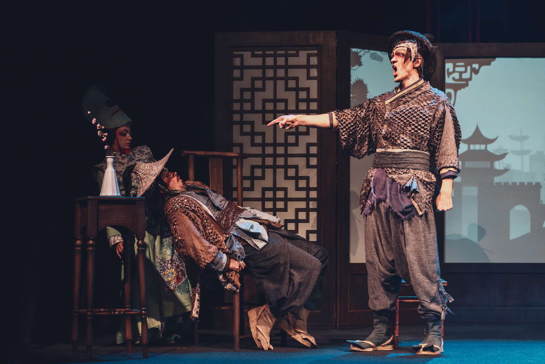 В противовес закаменевшей китайской группе, жизнь на сцене и за ней, где-то там, где рождались идеи, била ключом. Начнем с того, что для постановки опус решили освежить: новую оркестровку заказали композитору Валерию Кикте, за актуализацию либретто взялась Кей Бабурина. Оба преуспели. В диалогах хорошо уловлена стилистика комедии дель арте (по образу и подобию которой писалась опера). В музыке тон задаст «игрушечный» барабанный бой, прозрачно намекнувший: будем шутить и дурачиться, – сверх того поприбавится «китаизмов». Но особые изыски для уха не приготовлялись. К чему они бесхитростному сюжету про то, как богатый Мандарин, ищущий на старости лет своего изгнанного сына, находит его в трактире, где тот бегает в слугах, не имея никаких шансов повести обожаемую дочку хозяина под венец.