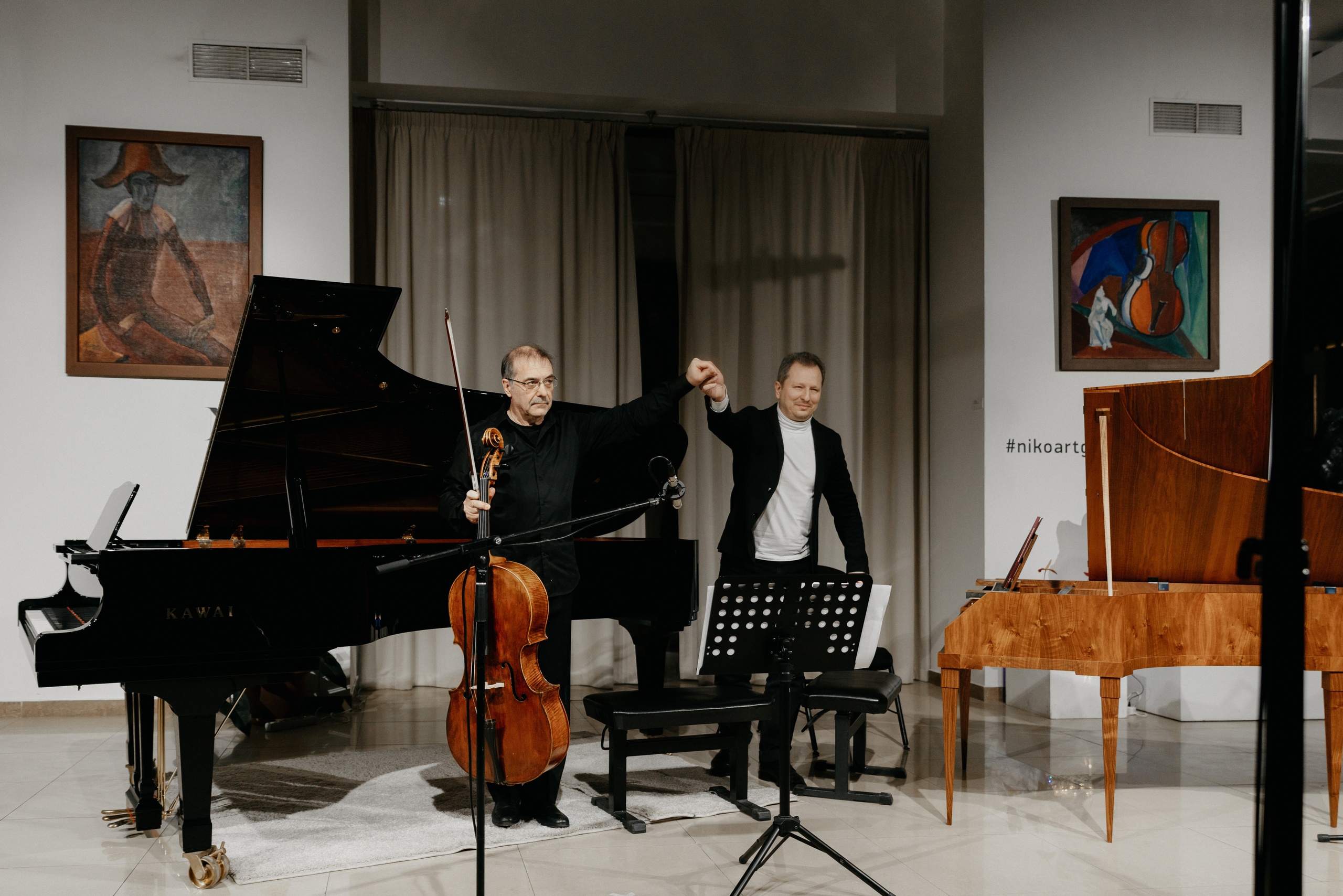 В первом отделении звучала почти исключительно музыка XVIII века, и все играли на исторических инструментах. Одним из главных героев здесь был хаммерклавир (незадолго до того приобретенный и доставленный в Москву Алексеем Любимовым, здесь же, в галерее «Нико», его и презентовавшим). Ему и было предоставлено первое «слово»: в исполнении Максима Емельянычева прозвучала моцартовская Фантазия до минор (К. 475). Емельянычев выступал в этот вечер также в дуэтах с Альбиной Латиповой, Екатериной Воронцовой, Сергеем Полтавским и Юлией Игониной, играл в четыре руки с Юрием Мартыновым, принимал участие и в более расширенных ансамблях, вплоть до бисового октета, переключившись во втором отделении с хаммерклавира на современный Kaway.