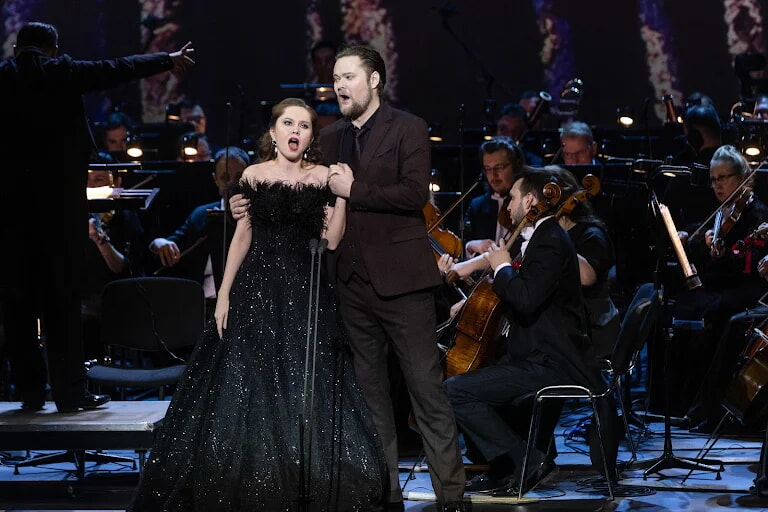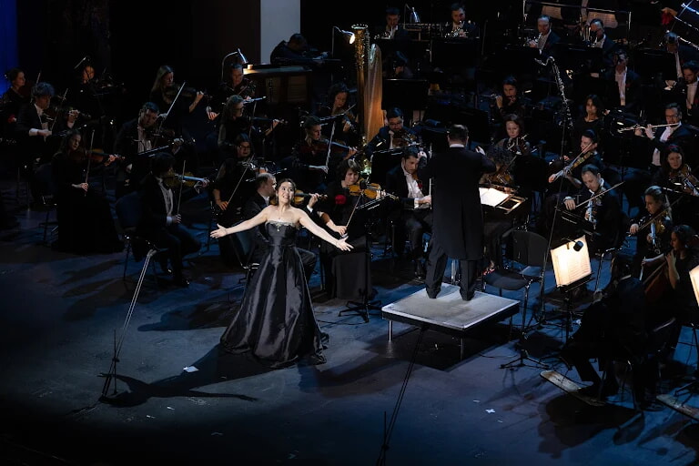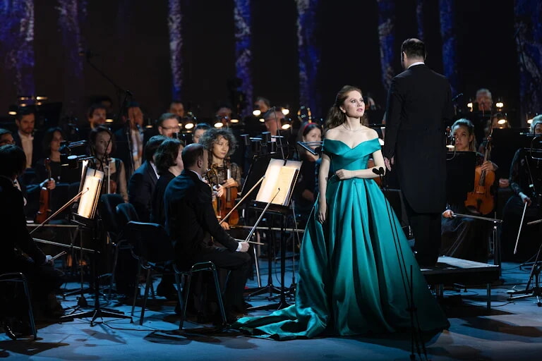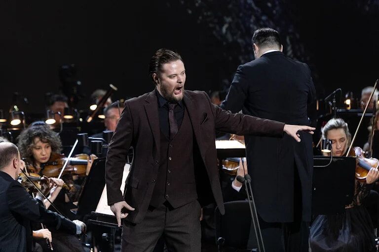 Видеопослание из Льежа прозвучало в начале второго отделения, полностью отданное западной музыке. А начинался концерт отечественной классикой. МГАСО под управлением Арифа Дадашева исполнил колоритный полонез из «Ночи перед Рождеством» Римского-Корсакова, словно напомнив об одном из главных юбиляров наступившего 2024 года (180-летие со дня рождения). К музыке главного сказочника русской оперы обратились еще дважды – контратенор Артуш Полеян специфически (без полноценных низов и с напряженными верхами) озвучил третью песню Леля из «Снегурочки», а сопрано Елизавета Пахомова трогательно и музыкально исполнила заключительную арию Марфы из «Царской невесты», напомнив о своем впечатляющем успехе на премьере этой оперы в сентябре ушедшего года.