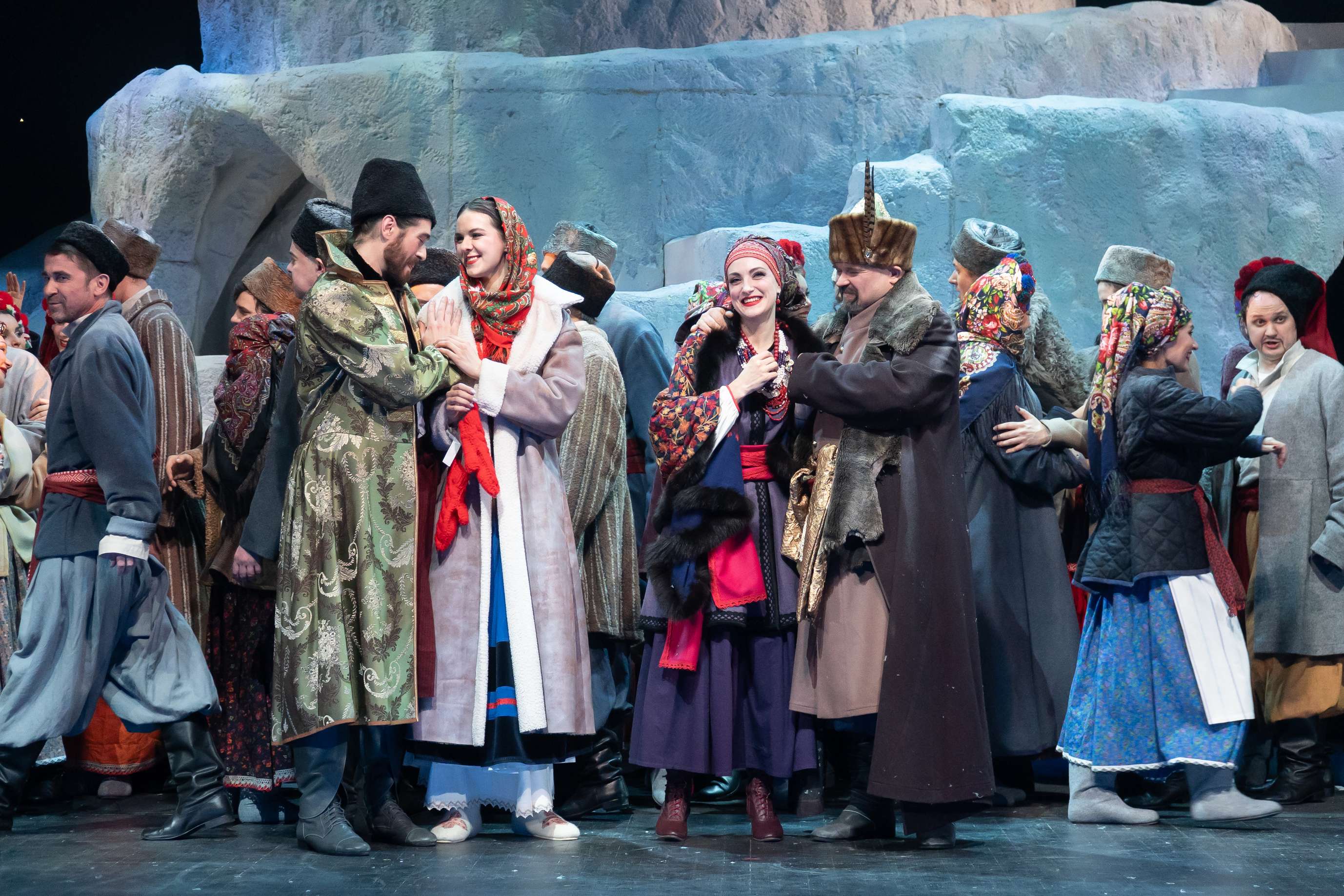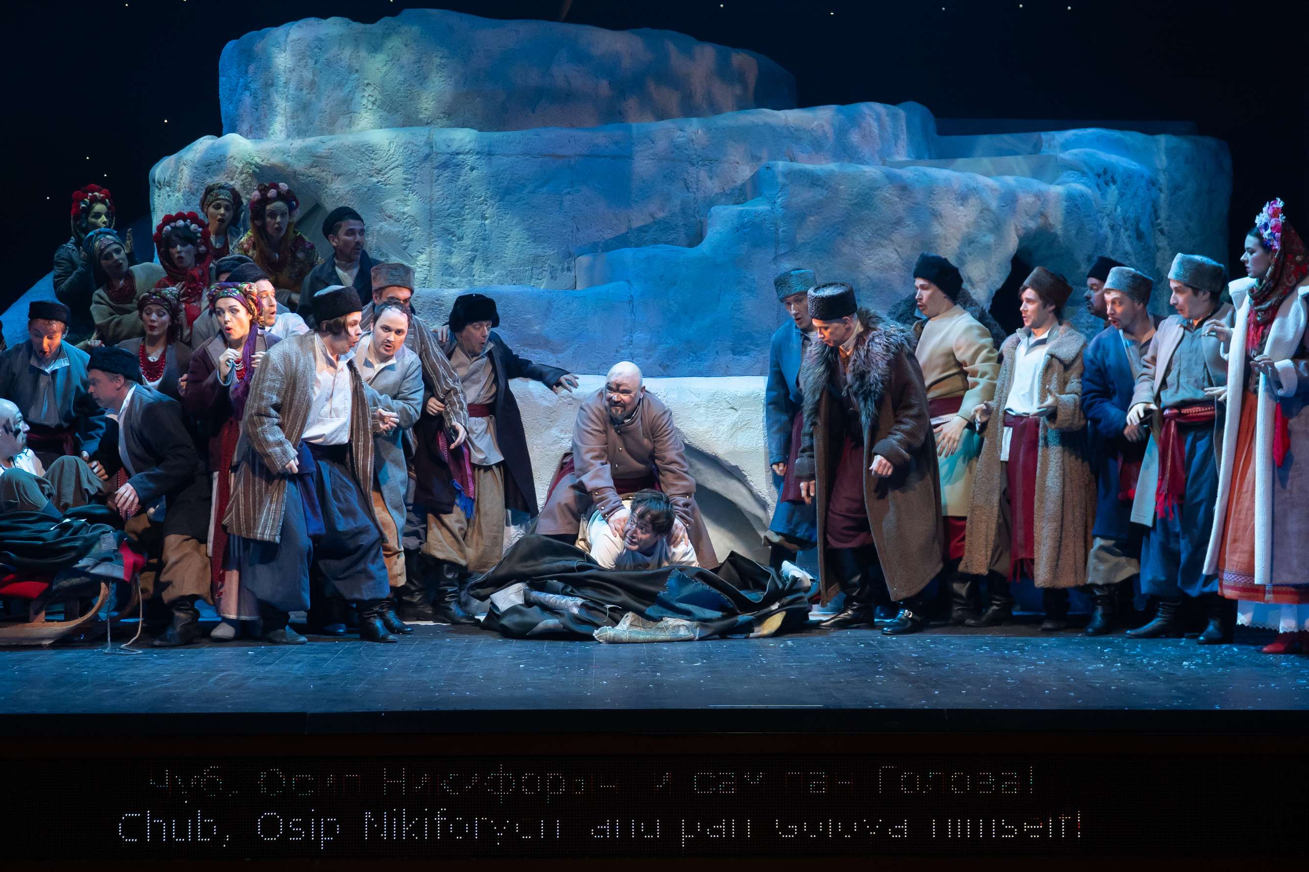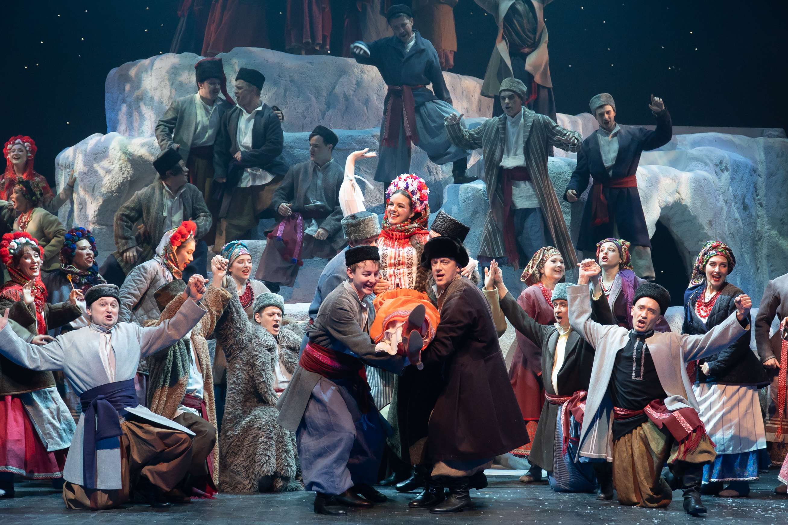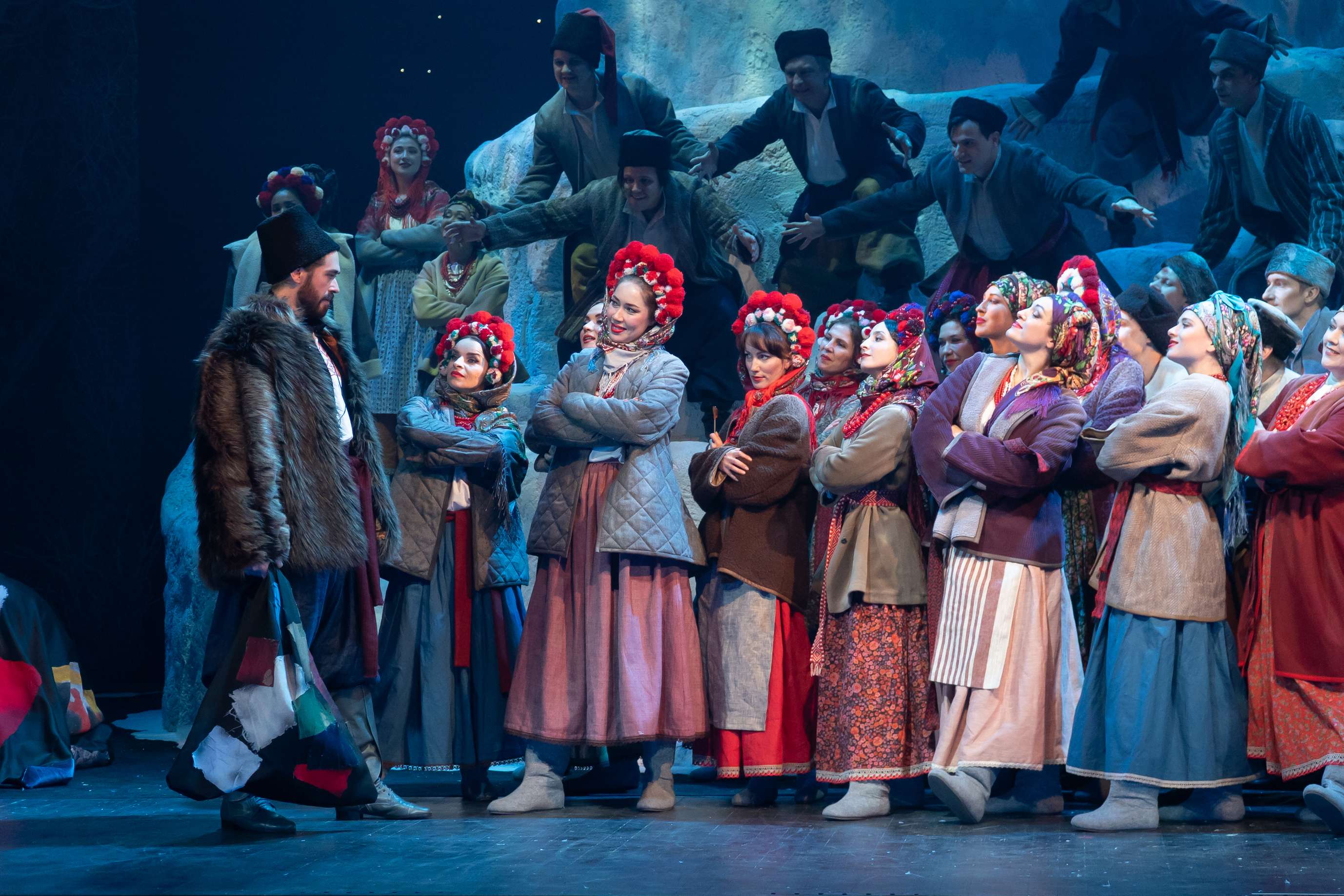В середине 2-го действия он устроил преждевременный антракт и выпустил в зал стюардов, раздающих публике баранки. Не всякий понял, к чему это, и, оголодав, оприходовал полученное угощенье. Зря. Чуть зазвучит хор колядующих «Добрый вечер» — в зал потянутся красиво разряженные (художником Марией Высотской) парубки и дивчины, которым в припасенные мешочки и требовалось положить те баранки. Или уж свою личную конфетку, как сделала моя соседка по ряду, расчувствовавшись. И было от чего: хор звучал роскошно, но еще ценнее были те тепло и душевность, которые в эти минуты накрыли публику... Сочтем, что высказывание по горячей теме прозвучало, хотя и в формате спорном: подобный интерактив в профессиональной среде признают, скорее, слабостью, чем силой театральной режиссуры.