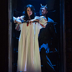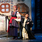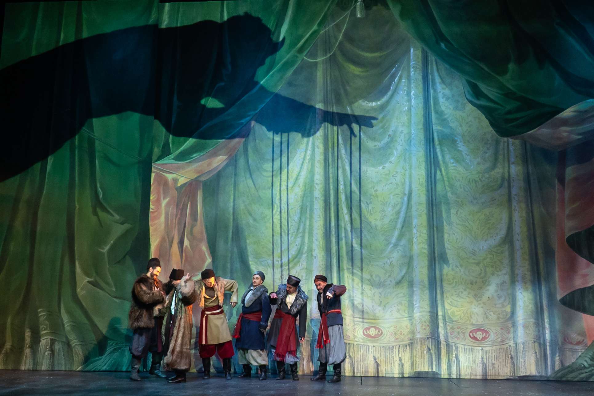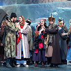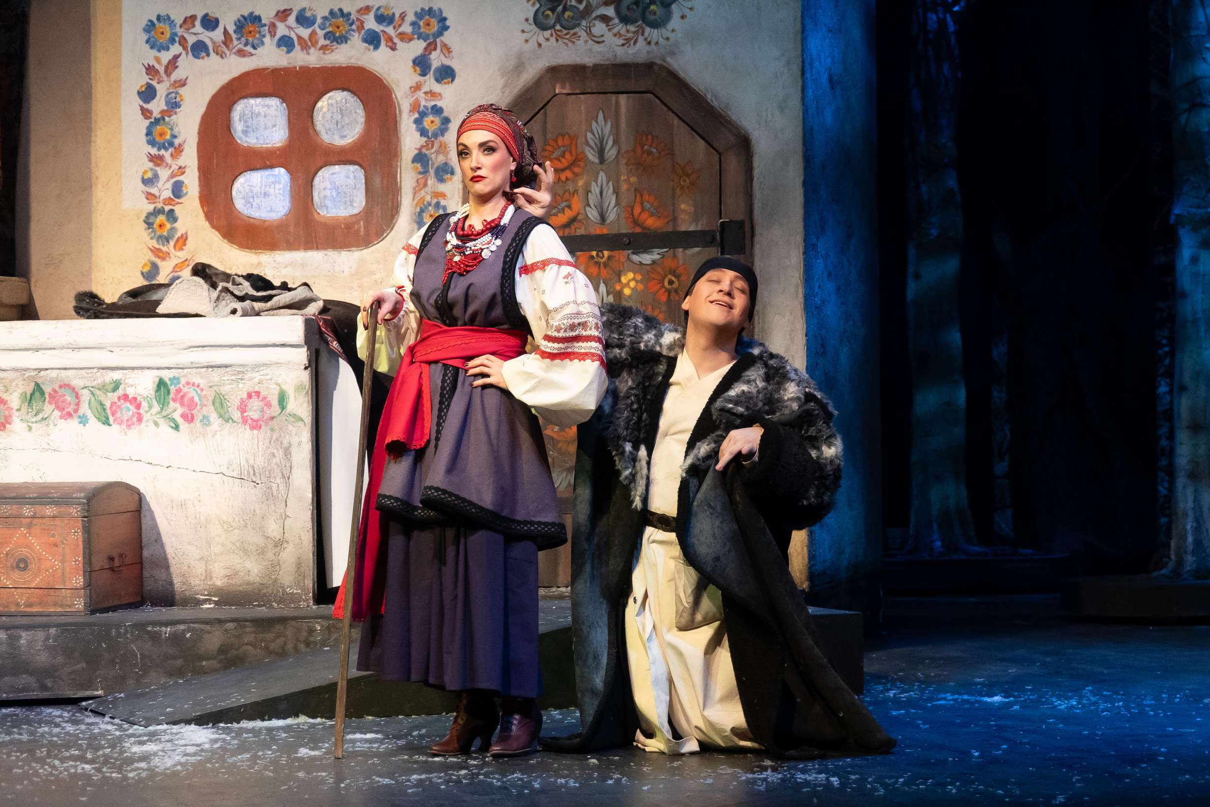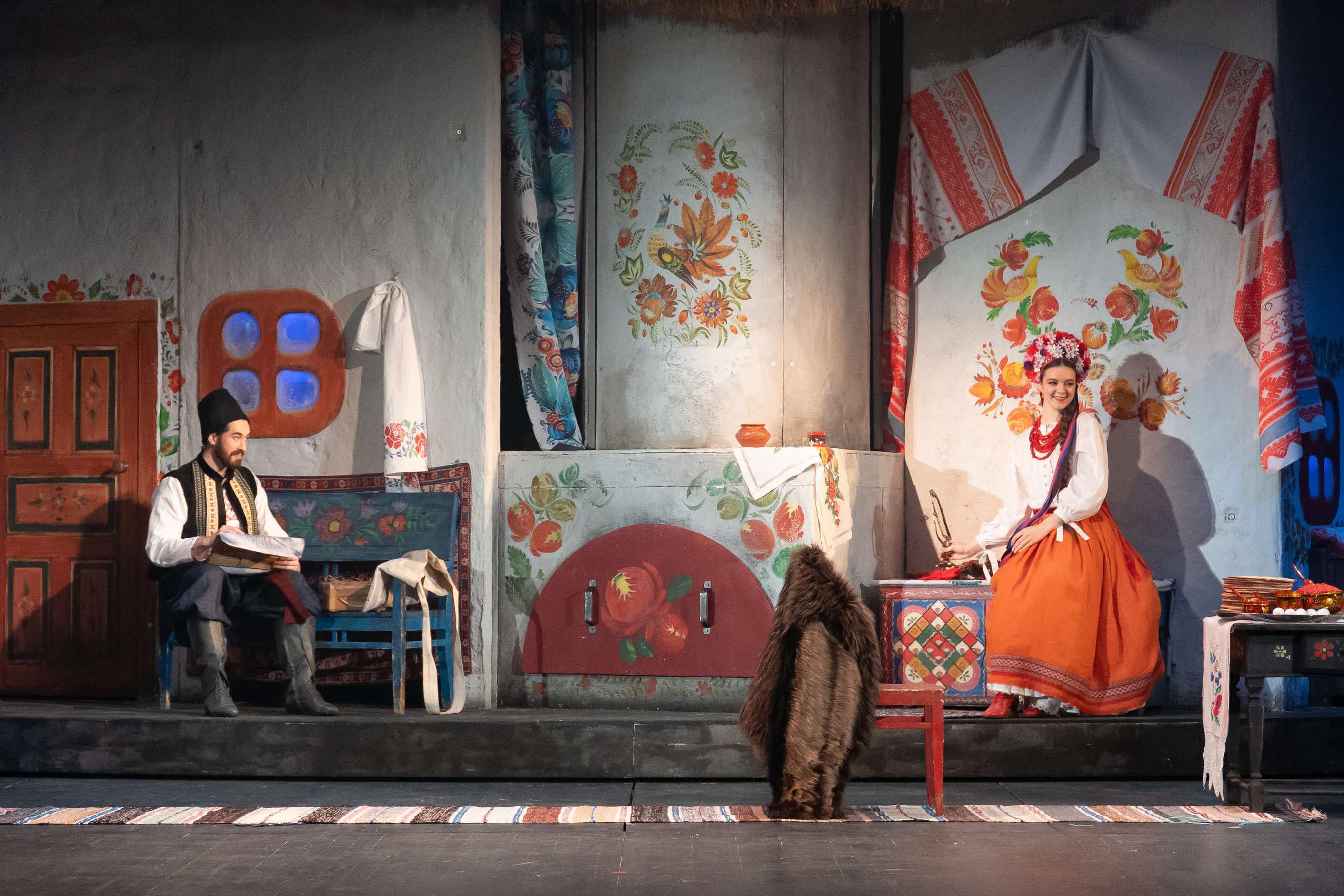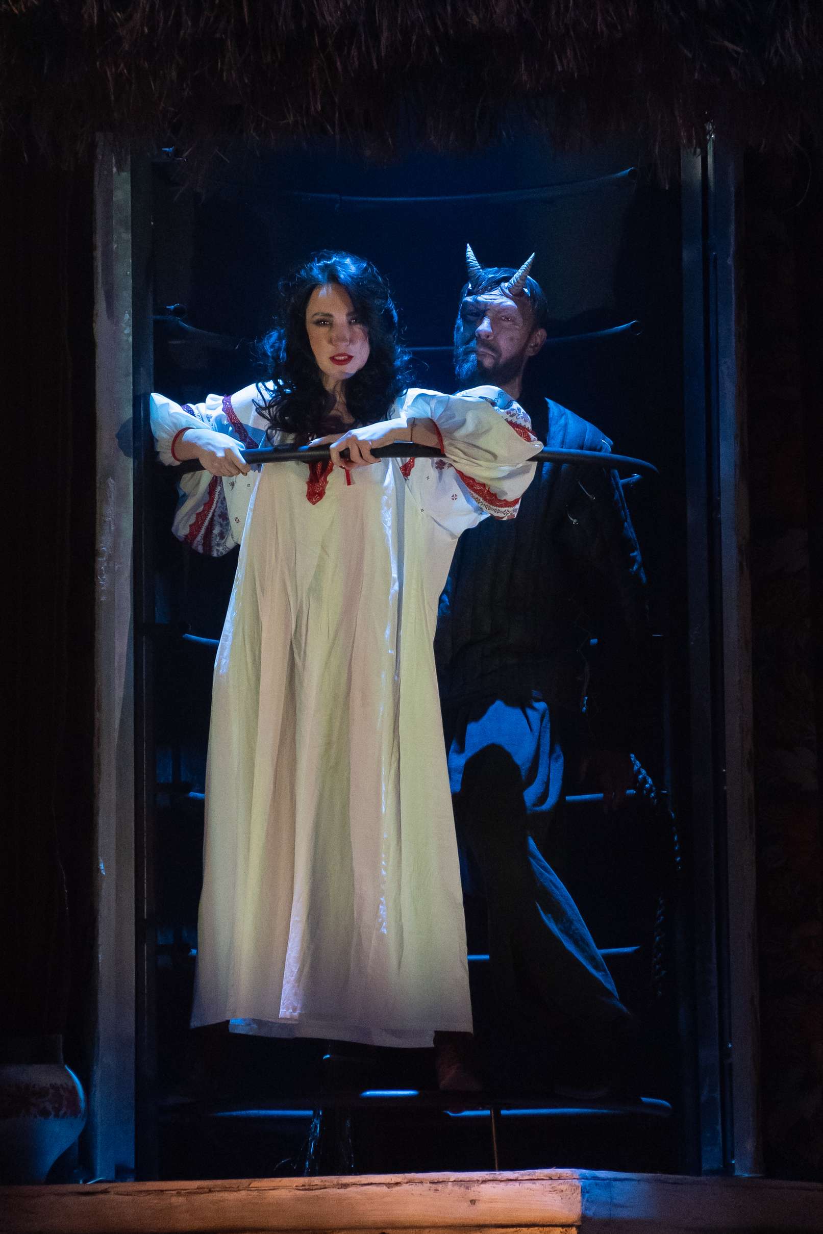 В середине 2-го действия он устроил преждевременный антракт и выпустил в зал стюардов, раздающих публике баранки. Не всякий понял, к чему это, и, оголодав, оприходовал полученное угощенье. Зря. Чуть зазвучит хор колядующих «Добрый вечер» — в зал потянутся красиво разряженные (художником Марией Высотской) парубки и дивчины, которым в припасенные мешочки и требовалось положить те баранки. Или уж свою личную конфетку, как сделала моя соседка по ряду, расчувствовавшись. И было от чего: хор звучал роскошно, но еще ценнее были те тепло и душевность, которые в эти минуты накрыли публику... Сочтем, что высказывание по горячей теме прозвучало, хотя и в формате спорном: подобный интерактив в профессиональной среде признают, скорее, слабостью, чем силой театральной режиссуры.