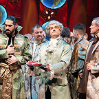 Поскольку намерений высказаться по актуальному ныне вопросу режиссер не скрывал, предположим, что следующие: нам нужны ничем не замутненный гром российских побед и демонстрация твердой уверенности в том, что ничто не разлучит два народа. Причем последняя позиция потребовала сверх музыкальной вивисекции дополнительных аргументов. Пока звучал русский номер, на занавесе сменяли друг друга групповые и индивидуальные портреты обитателей геликоновской Диканьки. Но слеза («родные мы все, родные!») никак не текла, потому что этот номер у Чайковского — дивная декоративная безделка, к сантиментам не располагающая: под него в опере развлекают двор балетные. Но режиссер добился-таки единения «наших» и «ваших» — способом, менее вымученным, хотя и тоже волюнтаристским по отношению к оригиналу.