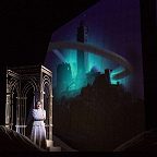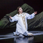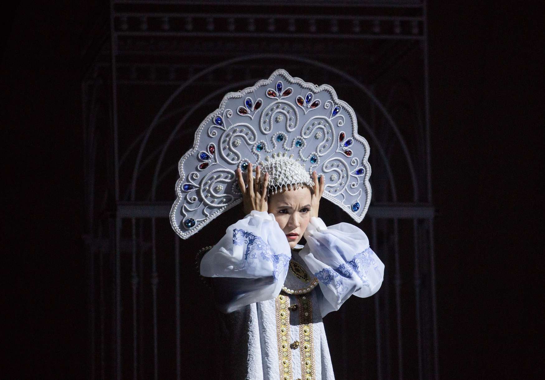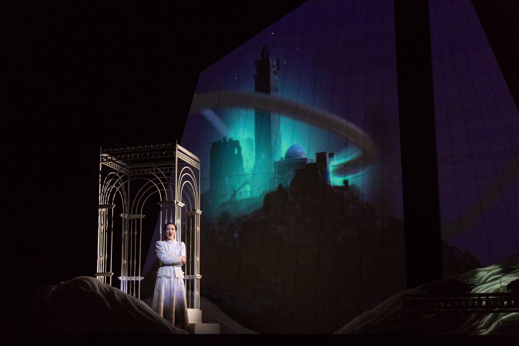 Встреча Наины с Фарлафом в «темном лесу» получается встречей двух немолодых героев с нечистыми эротическими намерениями. Режиссер в упоении прорисовывает в ней штришки и нюансы в ужимках, жестах, позах, согласно ритму музыки. В таких многочисленных узелках, из которых связана режиссура постановки, сквозила главная проблема «Руслана и Людмилы» Глинки – большой волшебной оперы, чей «полимодальный» жанр существует между сказкой, мифом и оперой-обрядом, но психологизма в ней, действительно, немало, он просочился в партитуру вместе с романсовостью, наполняющей сольные высказывания главных героев. Руслан поет сентиментальнейший романс, оказавшись на поле, «усеянном мертвыми костями», Людмила словно эхом вторит ему в «Ах ты, доля-долюшка», вступая в диалог с солирующей скрипкой. И тут мощные своды большой оперы уменьшаются до размеров петербургского салона. Сложность, однако, в том, что психологизм и обряд как будто несовместимы, а так велик соблазн напсихологизировать оперу насквозь, но вместе с этим может улетучиться сказка, миф уплощается до бытовых историй. И очередной капкан поджидал режиссера в сцене с Головой, где Руслан пел свои меланхоличные куплеты наедине с пустой сценой, робко усеянной лишь несколькими смешными валунчиками. Все это продолжило напоминать сочинение школьника, столкнувшегося с трудностями в описании волшебного леса, ограничившись чем-то очень условно-приблизительным. В этой сцене, наиболее неудачно решенной, точнее, не решенной никак, режиссер попала в заложницы картонной вампуки, оставив зрителя в недоумении – то ли плакать, то ли посмеиваться над незадачливым «горе-богатырем», льющим неуместные слезы в самый ответственный момент. Без сказки остались и сады Наины с Черномором. Здесь могла бы спеть свою песню виртуальная реальность, за которую отвечали видеохудожники, но они лишь предоставили странноватый набор слабо действующих картинок.