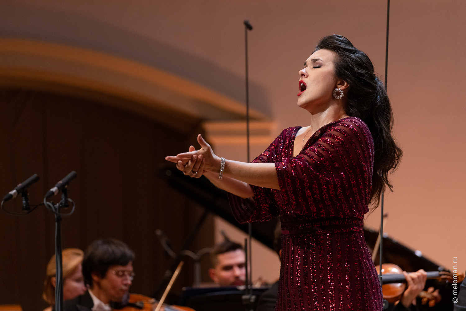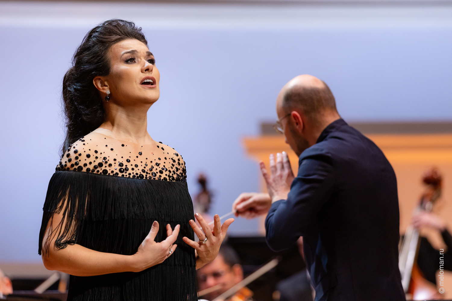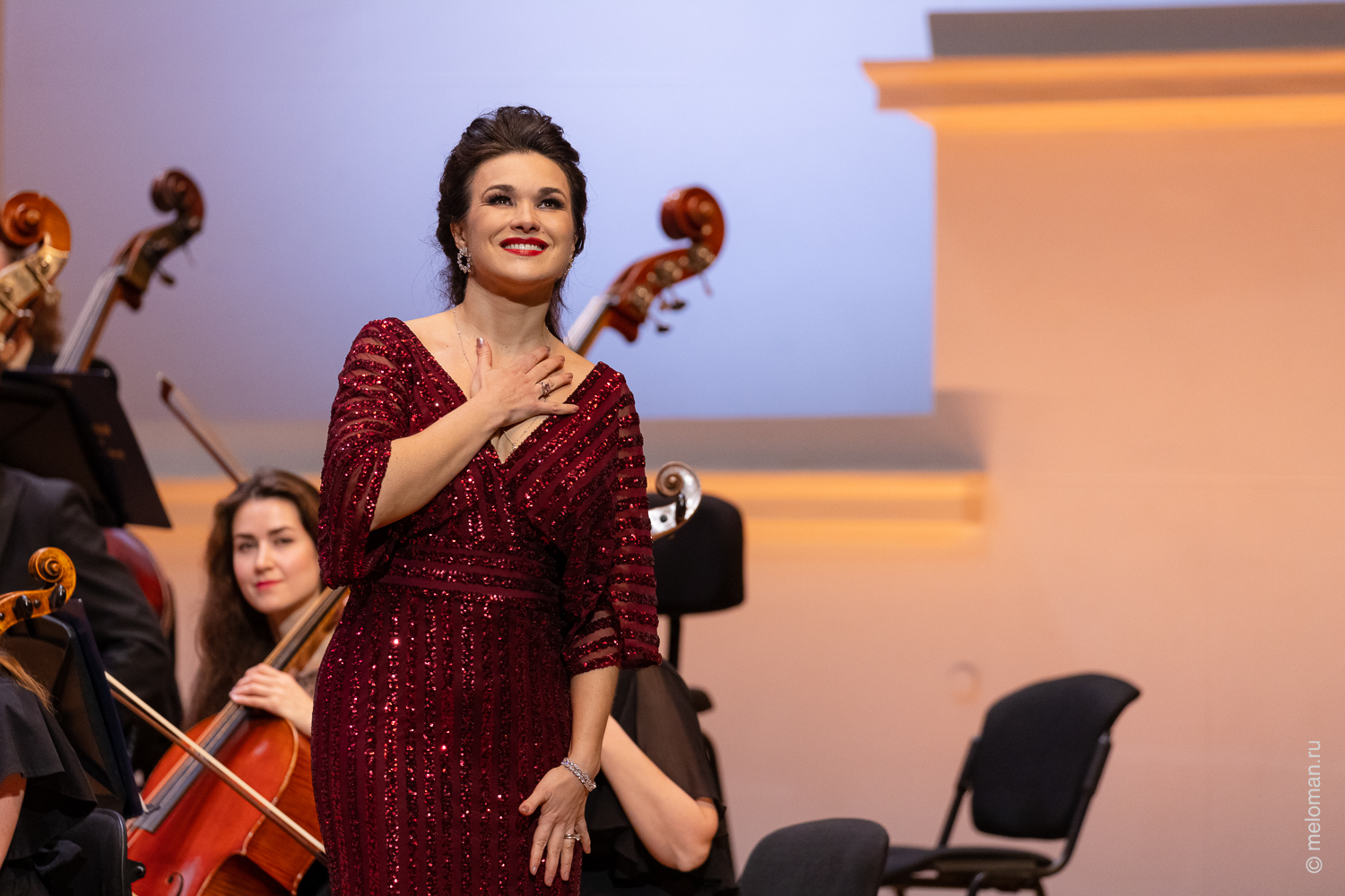 Сольник начался сразу, без разогревающего вступления в виде какой-нибудь увертюры: речитатив и рондо Донны Анны из «Дон Жуана». Моцарт – давняя территория певицы, она пела много партий в его сочинениях, но избранный фрагмент сразу заставил насторожиться. Драматическая по сути сцена с высоким эмоциональным напряжением и глубиной требует голоса решительного и плотного, не лишенного моцартовской элегантности и виртуозности, но все же сугубо драматические краски тут играют первую скрипку. Голос Ольги Перетятько едва ли обладает названными характеристиками: он легкий и нежный, звонкий, сильный и полетный, однако ему явно недостает массивности и глубины. Донну Анну поют разные голоса – и большие плотные драмсопрано, и легкие колоратуры, каждая, конечно, тут находит и привносит свое. Тем не менее трагедийный пафос образа обойти невозможно и очень трудно искусственно сублимировать, когда природные данные не обладают нужными качествами. В итоге Донна Анна получилась технически безупречной, но эмоционально бедноватой, лишенной волевого стержня и напора – певица сумела показать только их эскиз.