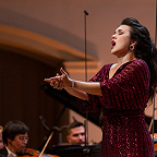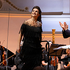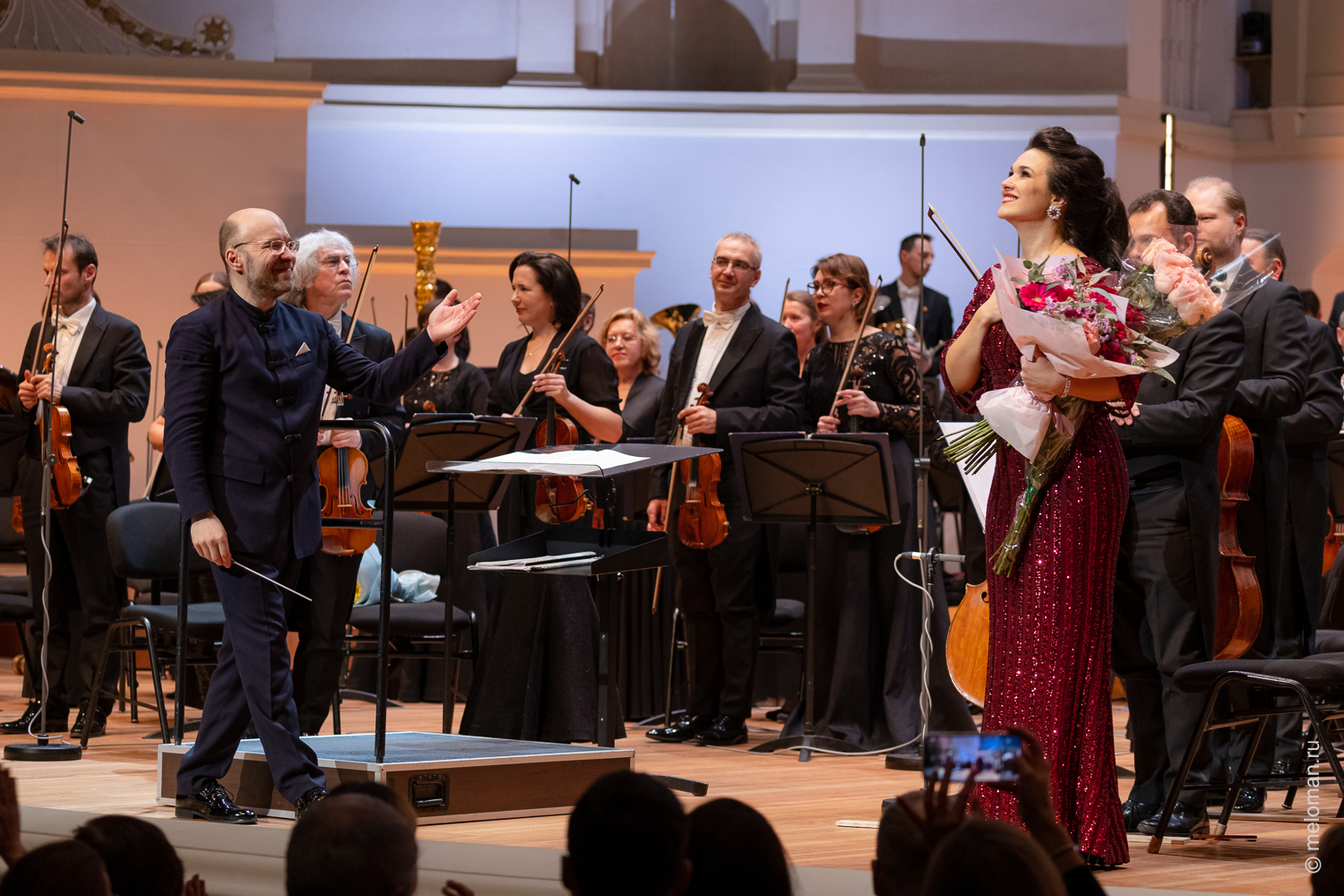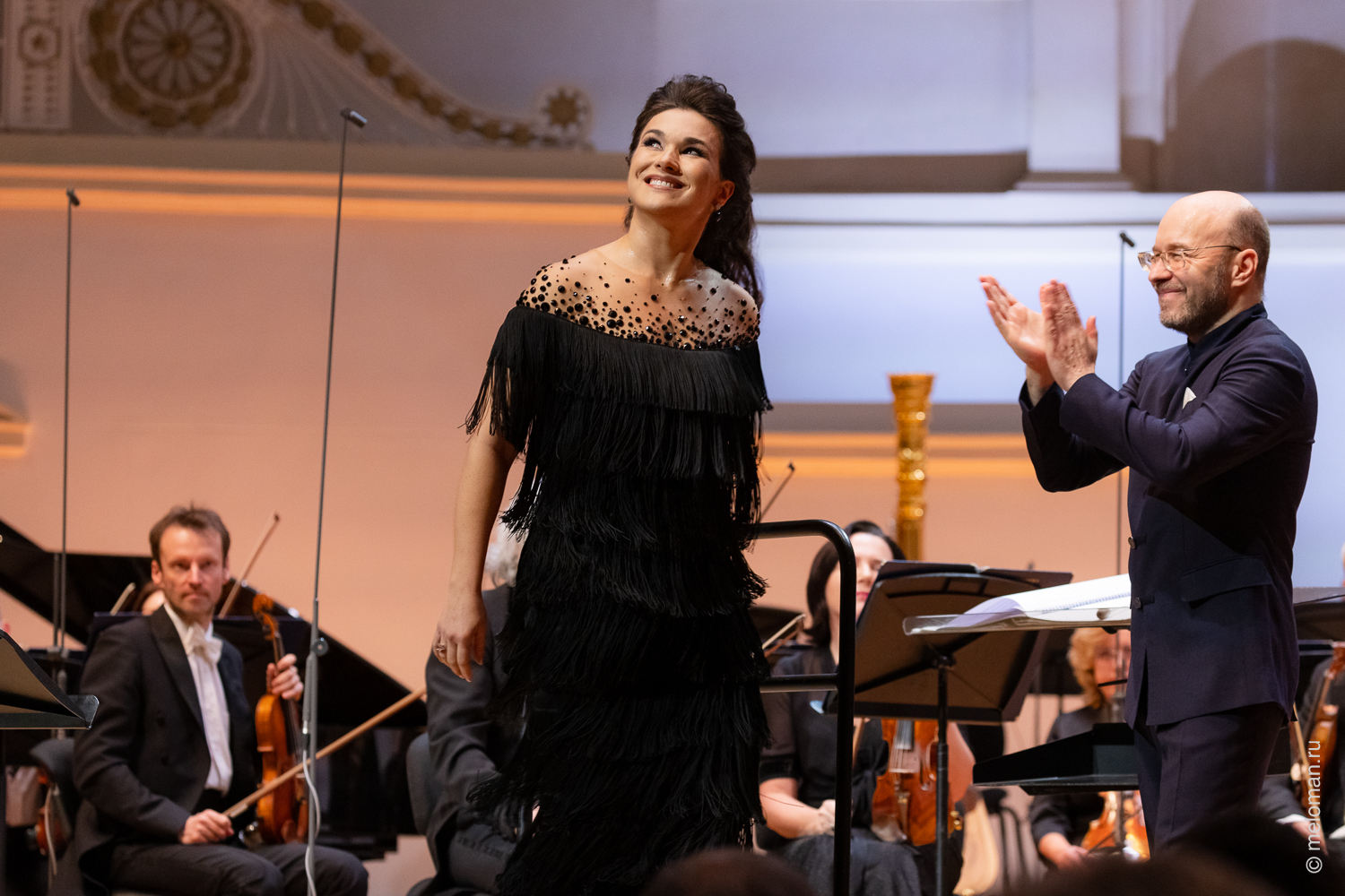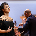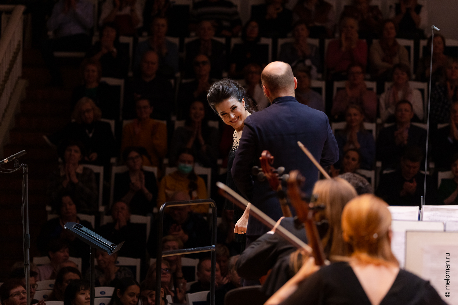 Сольник начался сразу, без разогревающего вступления в виде какой-нибудь увертюры: речитатив и рондо Донны Анны из «Дон Жуана». Моцарт – давняя территория певицы, она пела много партий в его сочинениях, но избранный фрагмент сразу заставил насторожиться. Драматическая по сути сцена с высоким эмоциональным напряжением и глубиной требует голоса решительного и плотного, не лишенного моцартовской элегантности и виртуозности, но все же сугубо драматические краски тут играют первую скрипку. Голос Ольги Перетятько едва ли обладает названными характеристиками: он легкий и нежный, звонкий, сильный и полетный, однако ему явно недостает массивности и глубины. Донну Анну поют разные голоса – и большие плотные драмсопрано, и легкие колоратуры, каждая, конечно, тут находит и привносит свое. Тем не менее трагедийный пафос образа обойти невозможно и очень трудно искусственно сублимировать, когда природные данные не обладают нужными качествами. В итоге Донна Анна получилась технически безупречной, но эмоционально бедноватой, лишенной волевого стержня и напора – певица сумела показать только их эскиз.