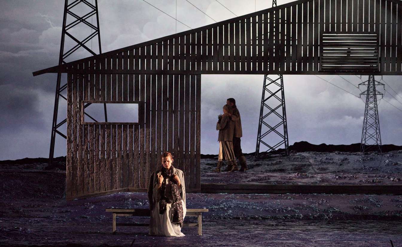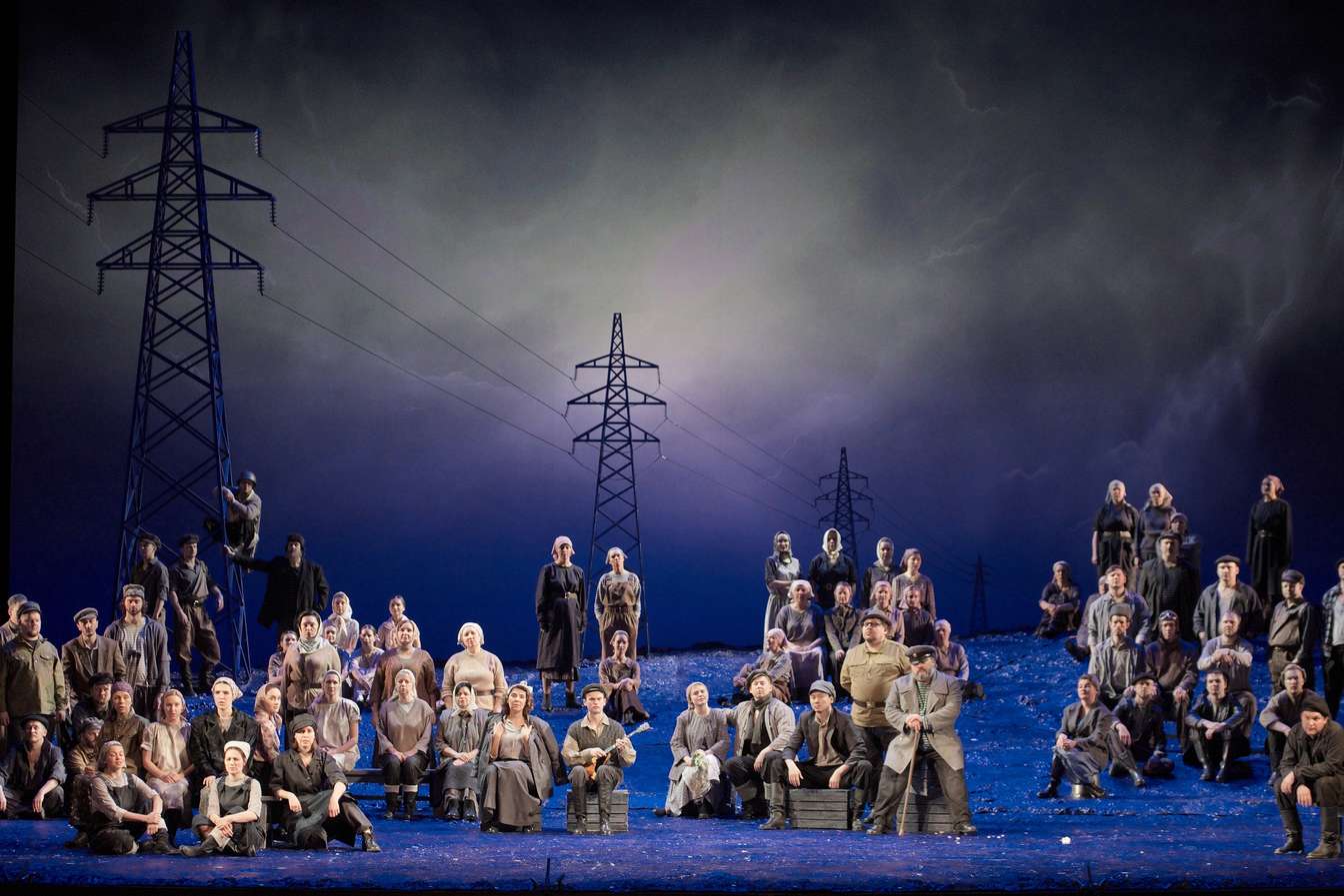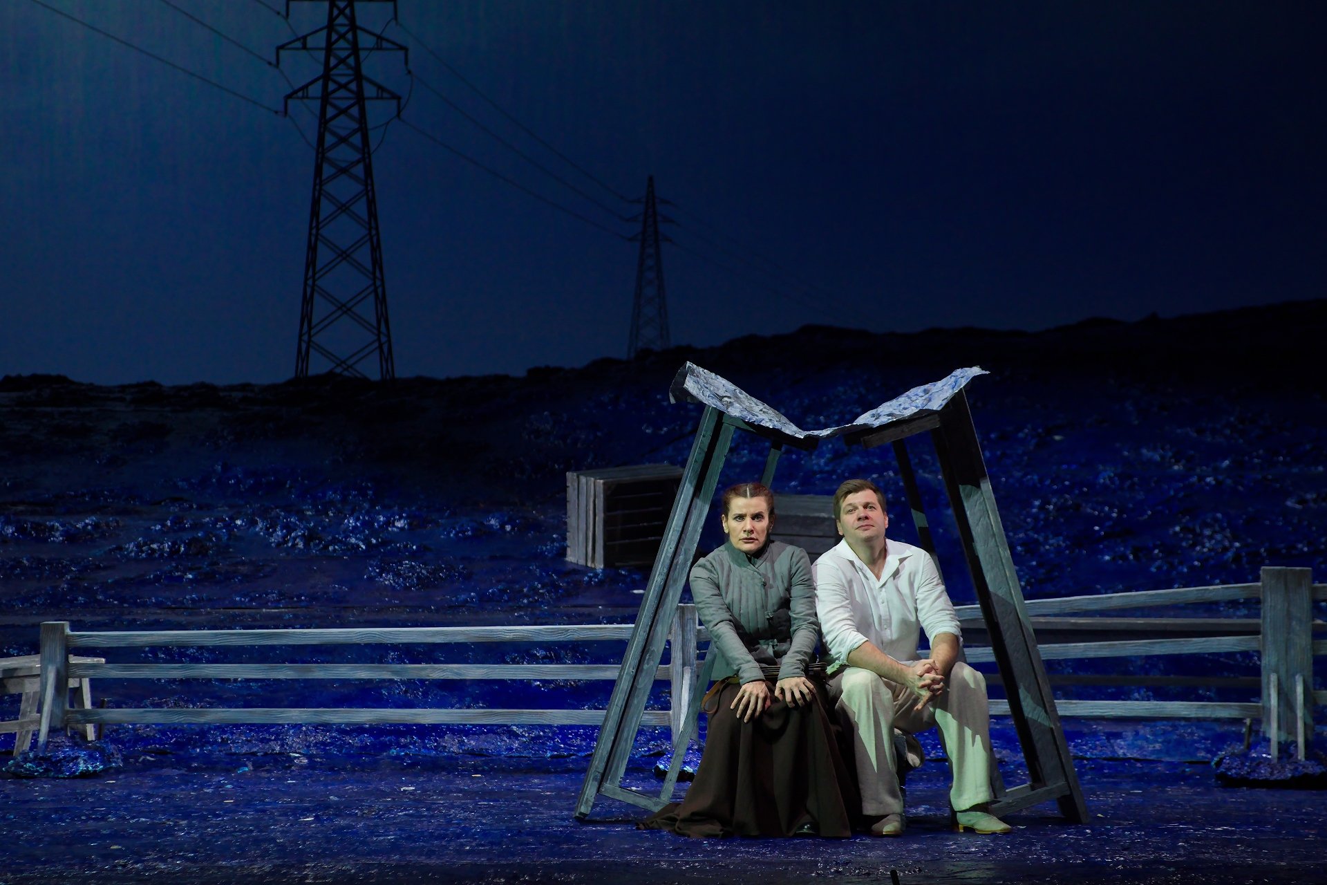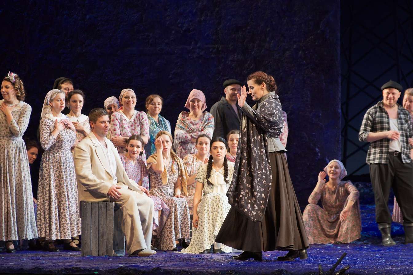 Отдельная песня — хор, который здесь колхозное население, живое, ладное в многоголосицах, да еще и затанцевавшее (причем вовсе не стадом коров на льду) после штудий с балетмейстером Сергеем Землянским. Органичность существования коллективный герой постановки потерял только в том эпизоде, где его перевели из народных масс на «роль» голоса совести героини: с театральных антресолей эта инфернальная субстанция звучала так жирно, по-земному, что драматическое борение на сцене приобретало самый иронический оттенок, явно не предусмотренный. Но сей кикс вместе с еще одним (слишком раздевшейся героиней на танцах) — пожалуй, все, что повредило режиссерской партитуре, в остальном безупречной.