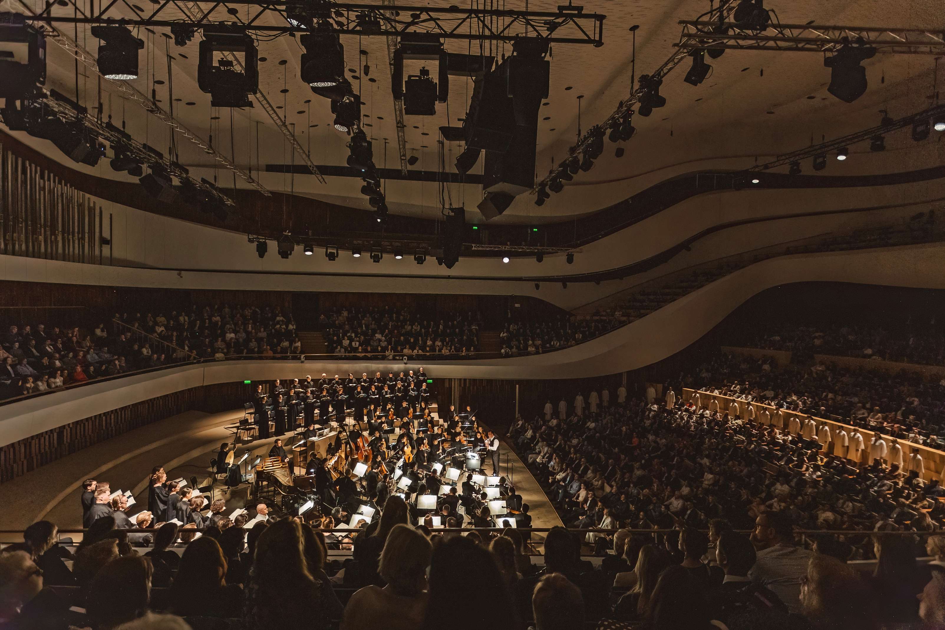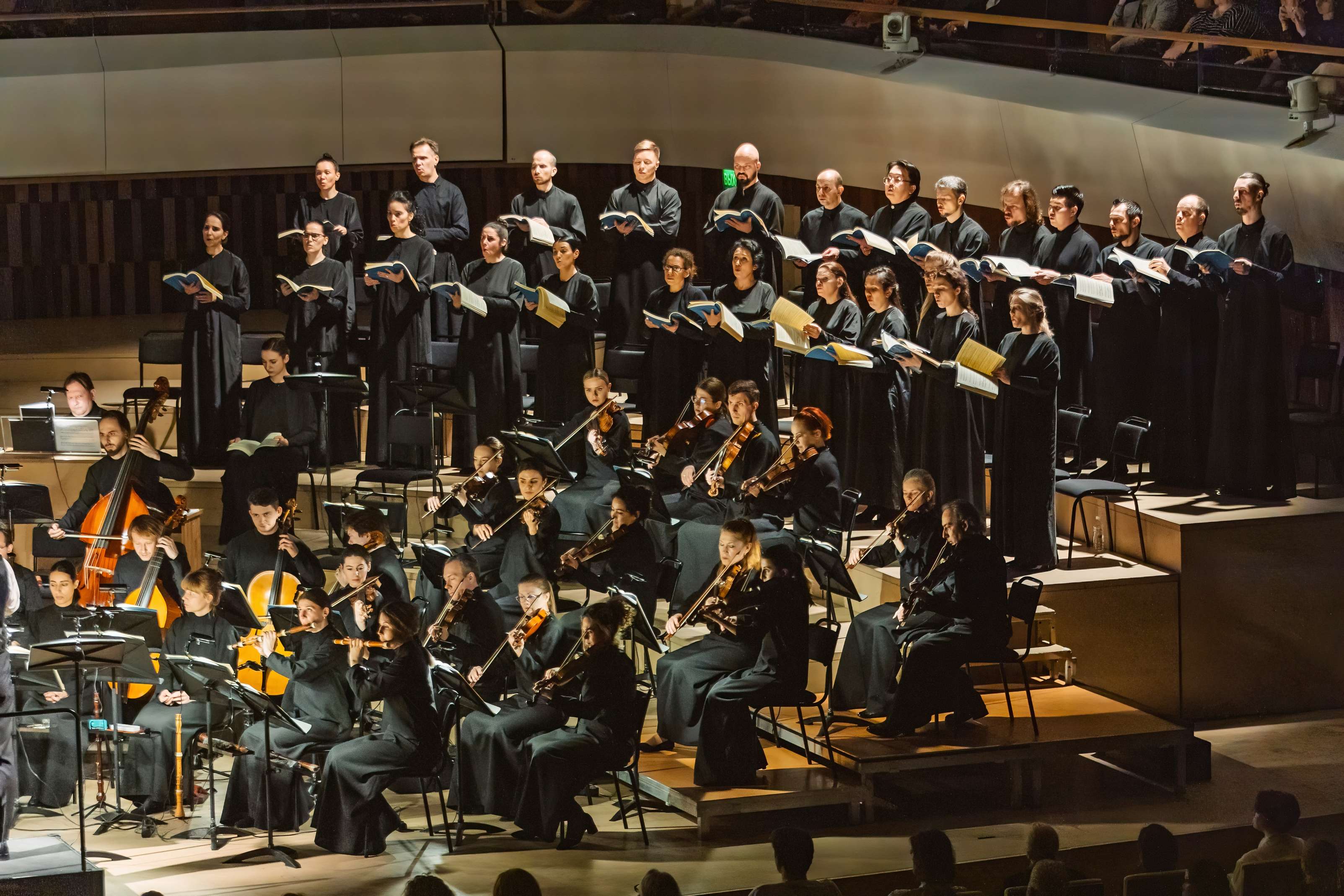 Это был не просто концерт, но также и не семистейдж. Курентзис развернул действо не столько в сторону театрального представления, сколько храмовой мистерии: на нее работали и полумрак, и соответствующие одеяния музыкантов, и еще многое другое, включая отсутствие аплодисментов – не только по ходу, но и по окончании (о чем специально попросили публику). Отдельным и потрясающим эффектом в одном из последних эпизодов стало пение детского хора «Весна», раздававшееся откуда-то из-за пределов зала – словно бы прямо с небес…