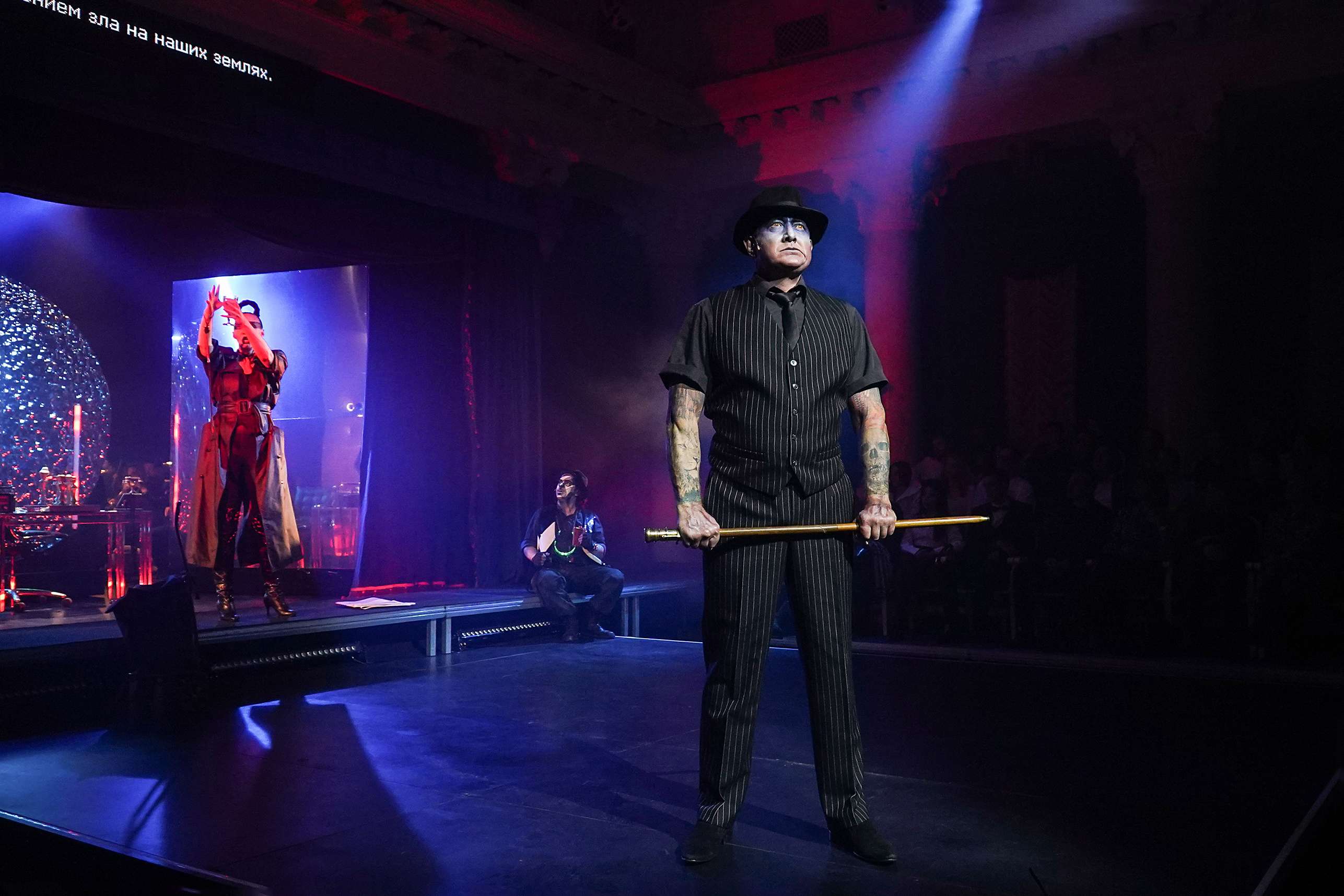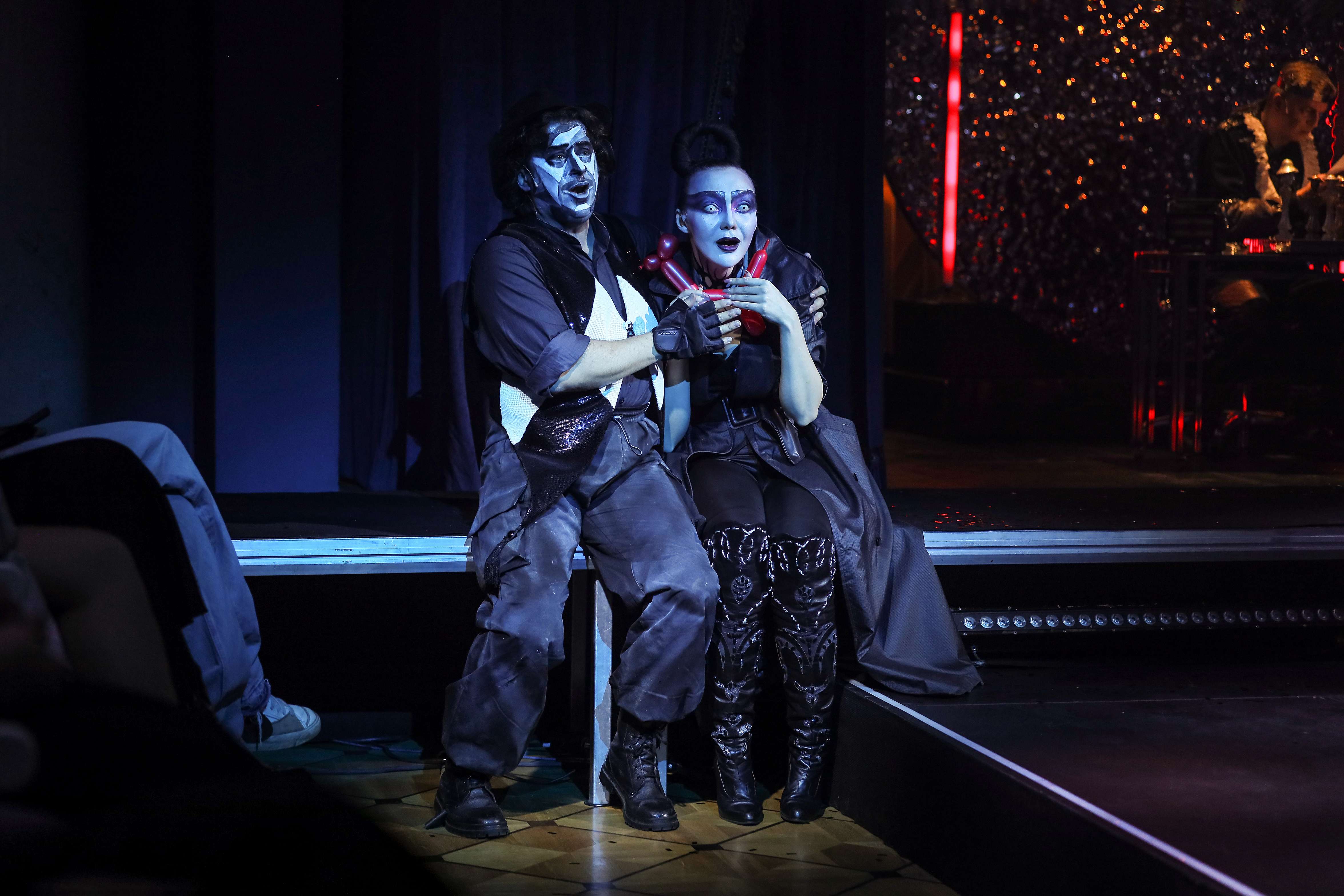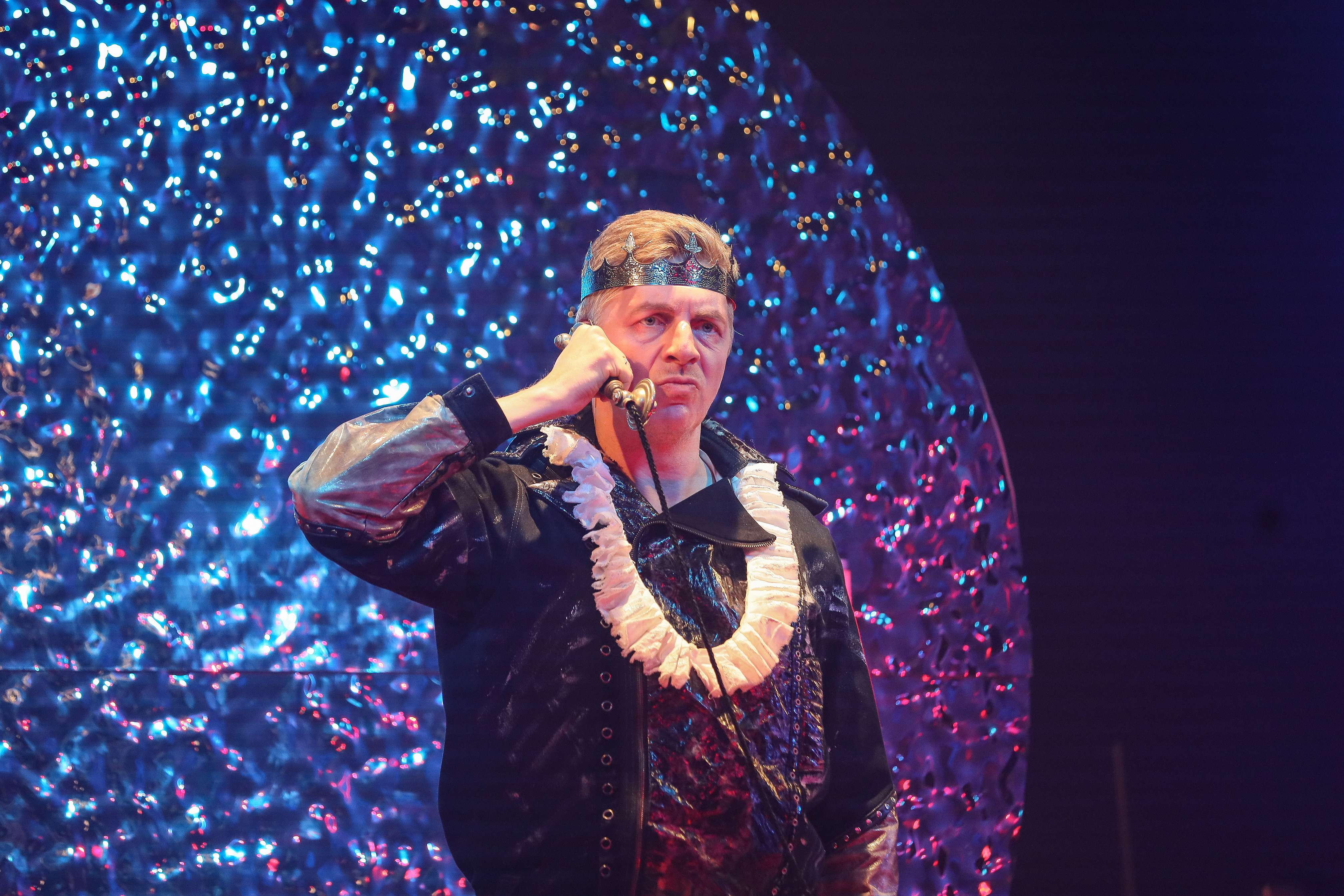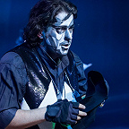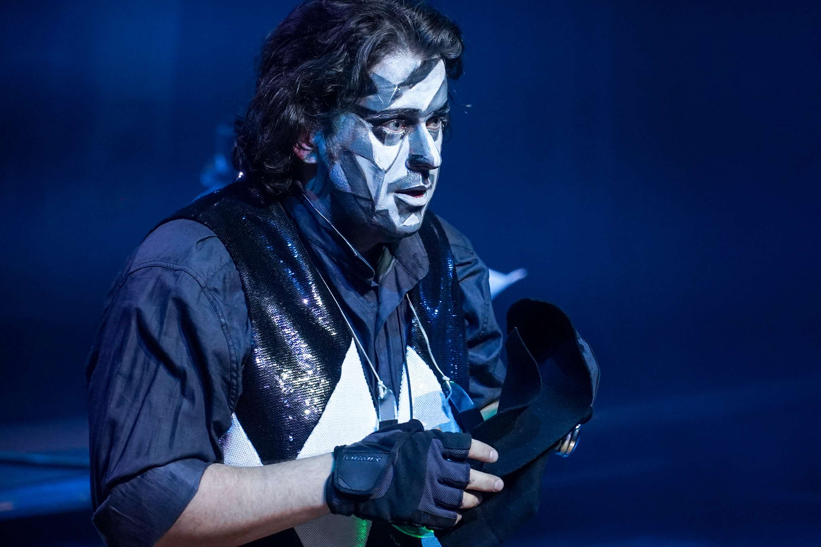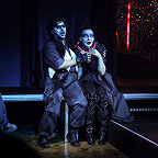 Актеры выдвигались на передний план и отступали в тень, укладывались по здешней привычке в горизонтальную позицию в минуту любовной истомы и вяло кружили, пытаясь подстрелить друг друга. Но кто они — эти Император, Смерть, Арлекин, Громкоговоритель? И что за связи меж ними? Аллегоричность и абсурдизм, которые есть в сочинении, перетекут в спектакль лишь несмелыми предположениями режиссера насчет того, что это такое. А на опыты по части образности решатся только те, кто придумывал костюмы и грим: Ростислав Протасов и Наталья Блинкова. Барабанщику они придали демонический вид, а ища образы жизнелюба Арлекина и Смерти, кажется, взяли на вооружение строчку из либретто «настали времена, когда и жизнь людей не радует, и смерть не печалит»: первого раскрасили в сумеречные цвета, а вторую представили вполне уютным господином (если только не смотреть ему в глаза, будто чем-то выбеленные). При этом приметы войны в спектакле художники свели к минимуму, хотя чуть не на каждом сантиметре оперного пространства только о ней и речь. И были правы. Ведь мы уже знаем: эта опера не про какой-то блицкриг.