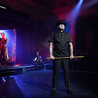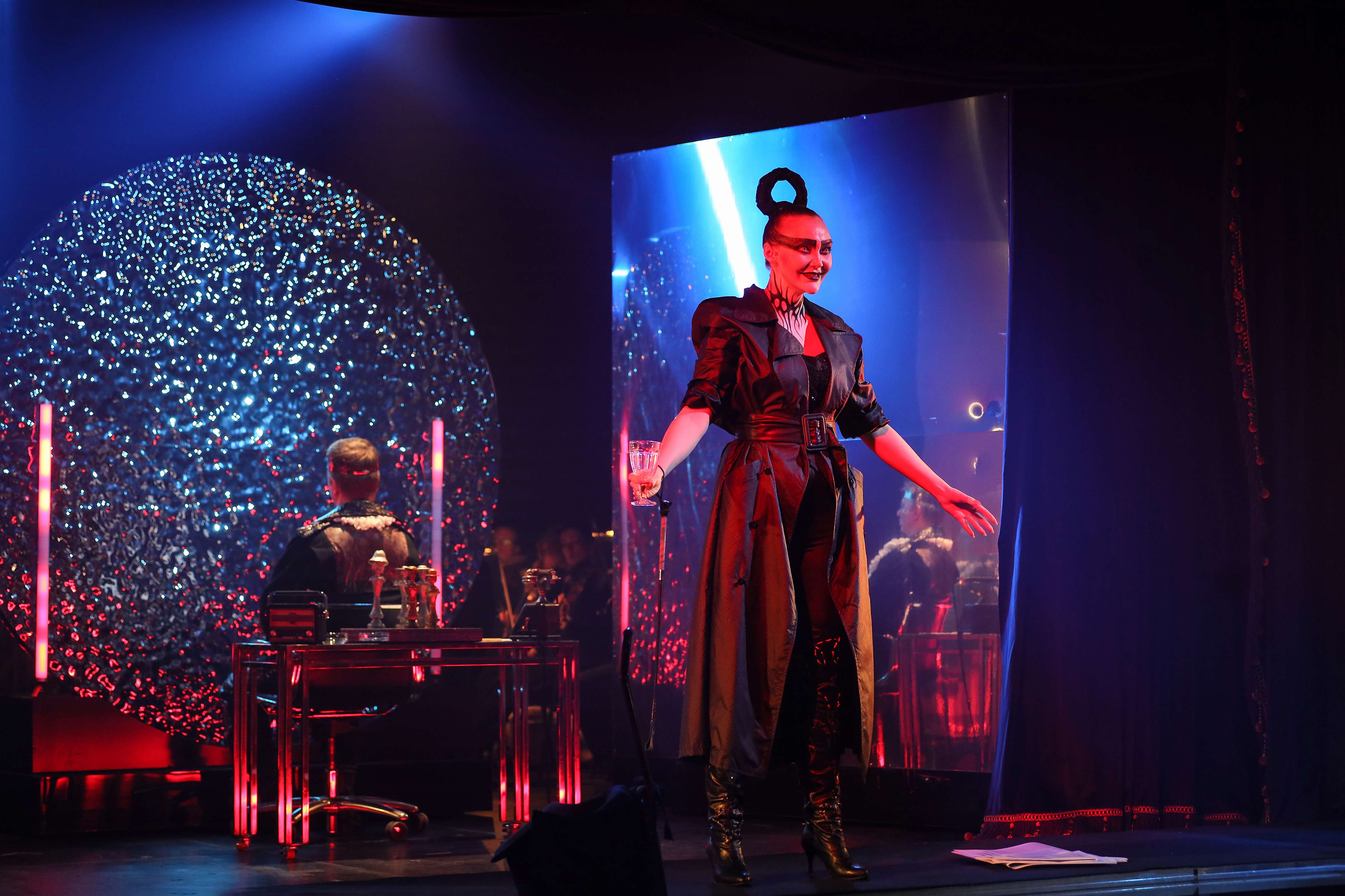 Ансамбль тут отправили за занавес, а на авансцену, каковой стала площадка в центре зрительного зала, вывели артистов. Они недурно справлялись с разговорными пассажами, переведенными на русский, и с разной степенью успеха пели на немецком. Маститый геликоновский бас Александр Киселев в образе Смерти и молоденькая сопрано Софья Цыганкова — Девушка максимально старались сообразовываться с гибким, богатым нюансами музыкальным языком Ульмана. На другом полюсе — вокалисты, определенно видящие себя не здесь, в камерном Белом зале, а на необъятной парадной сцене «Геликона». Это протагонист Михаил Никаноров, однообразный в динамике, и это Юлия Никанорова в роли Барабанщика как символа войны, являвшая почти сплошные форте, тембровую жесть и уже проступающую качку. Поди услышь за этой могучей вокальной стеной тонкое пение скрипки и попробуй не упусти стремительные смены настроений ульмановского опуса, которым дирижировала дебютантка «Геликона» Елена Сосульникова. Музыкантам бы сюда, на авансцену... Тем более что ничем интересным эта выигрышная площадка занята не была.