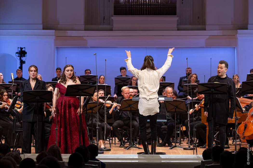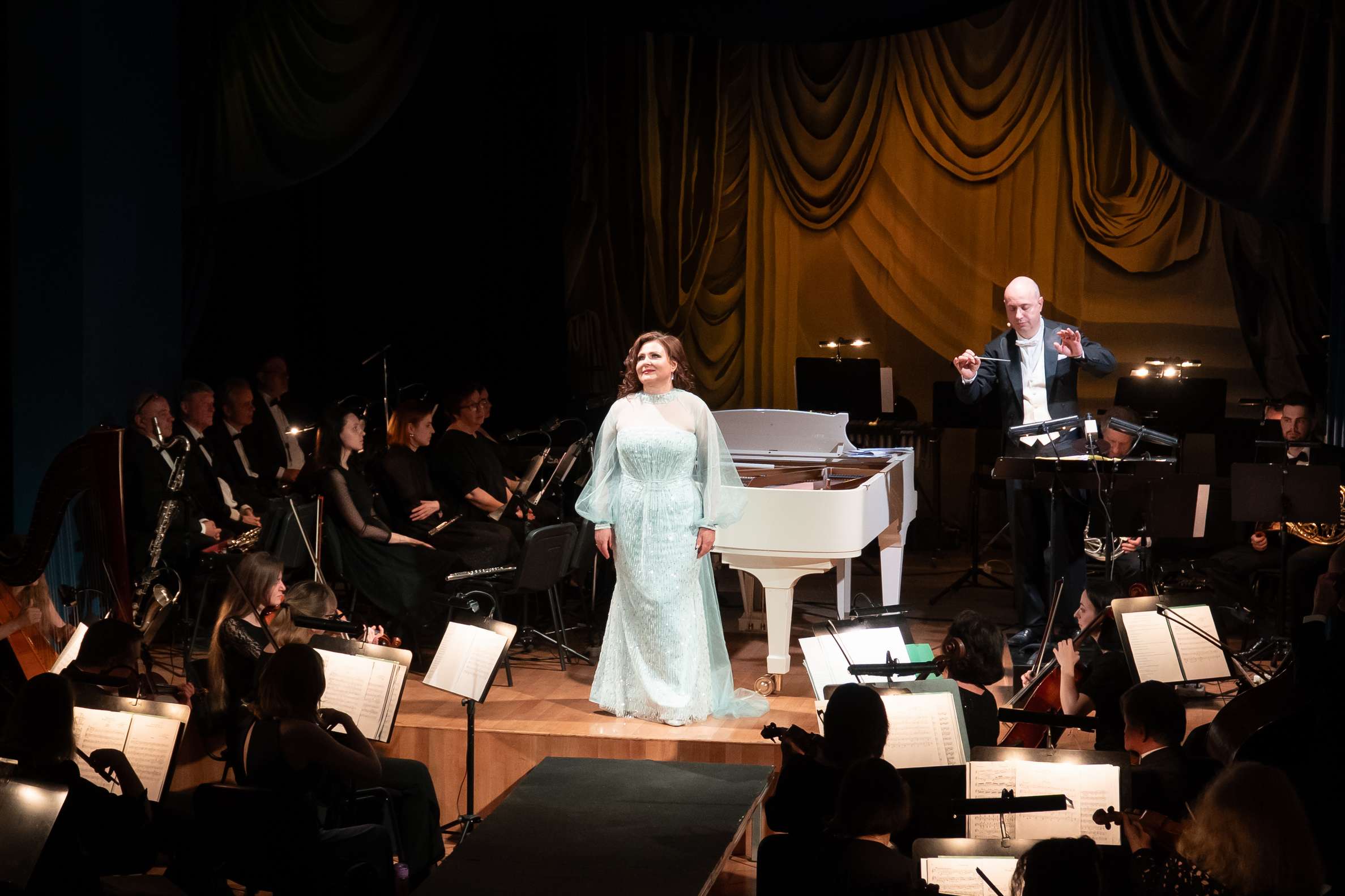 Программа – более чем изысканная. Даже популярнейший Пуччини был представлен малоизвестным сочинением – квартетом «Хризантемы» в оркестровой версии. Среди других композиторов – Пуленк и Яначек, Корнгольд и Элгар, Пярт и Шабрие, Рихард Штраус и Десятников, Копленд и Барбер. Из более или менее популярного – «Грустный вальс» Сибелиуса, «Мадригал» из «Ромео и Джульетты» Прокофьева. Все это оркестр театра под управлением юбиляра исполнил наилучшим образом. Петь в этот вечер Егиазарьян не стал, зато привлек к участию цвет труппы. Лариса Костюк великолепно спела арию из «Марии из Буэнос-Айреса» Пьяццоллы, а затем – вместе с Еленой Семеновой, Вадимом Заплечным и Сергеем Топтыгиным – ансамбль из оперы «Игра в бридж» Копленда. Анна Гречишкина вместе с Софьей Цыганковой и Валентиной Гофер порадовали сценой из оперы «Гензель и Гретель» Хумпердинка. Замечательная Светлана Создателева (незадолго до этого вернувшаяся из Лондона, где впервые выступила в партии Брунгильды в «Гибели богов» с Владимиром Юровским) очень выразительно спела две песни Рихарда Штрауса в сопровождении оркестра. Но, пожалуй, самым ярким моментом стало выступление легендарной и уникальной Натальи Загоринской с «Тремя песнями на слова Дж. Чиарди» Леонида Десятникова.
