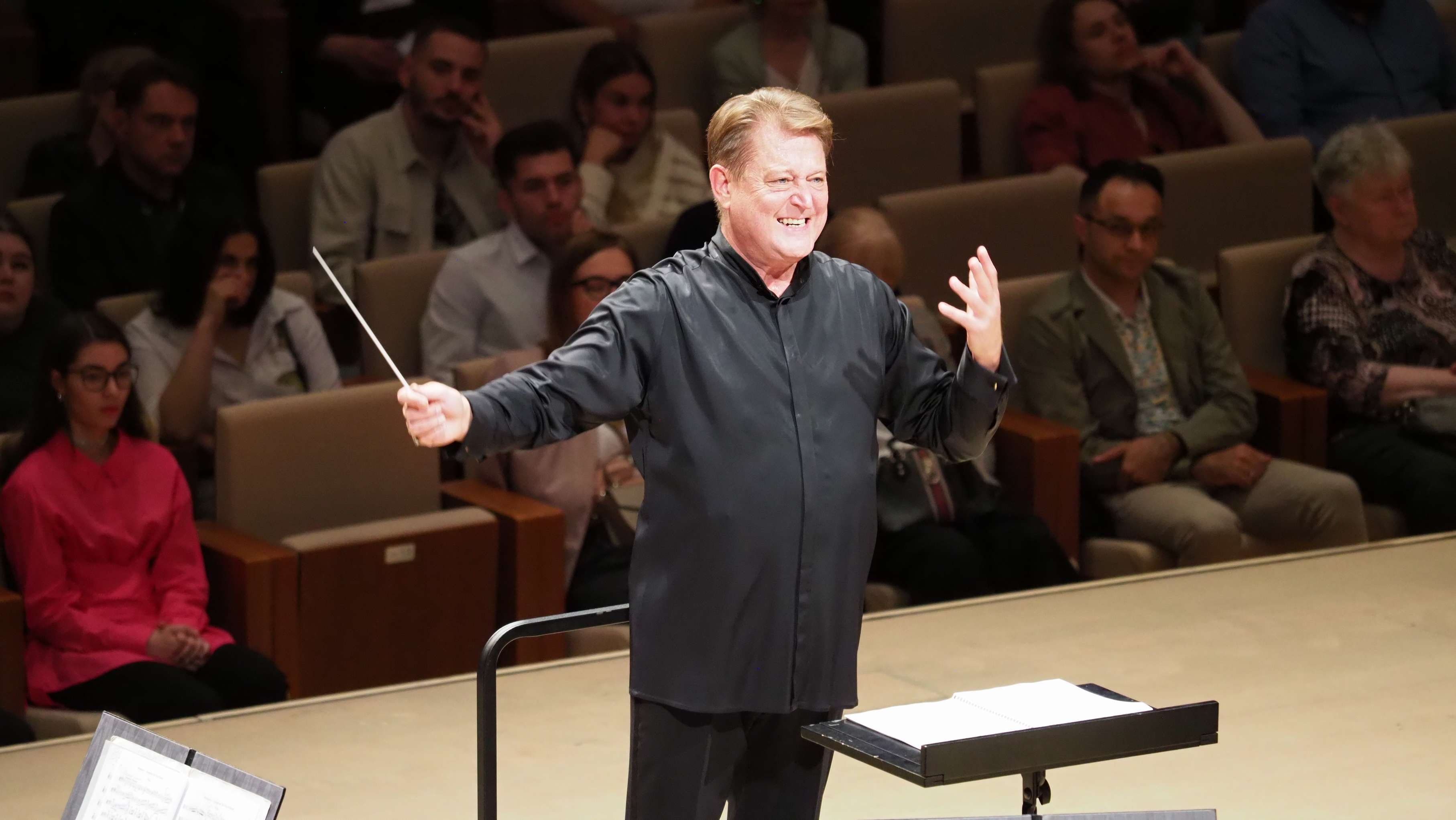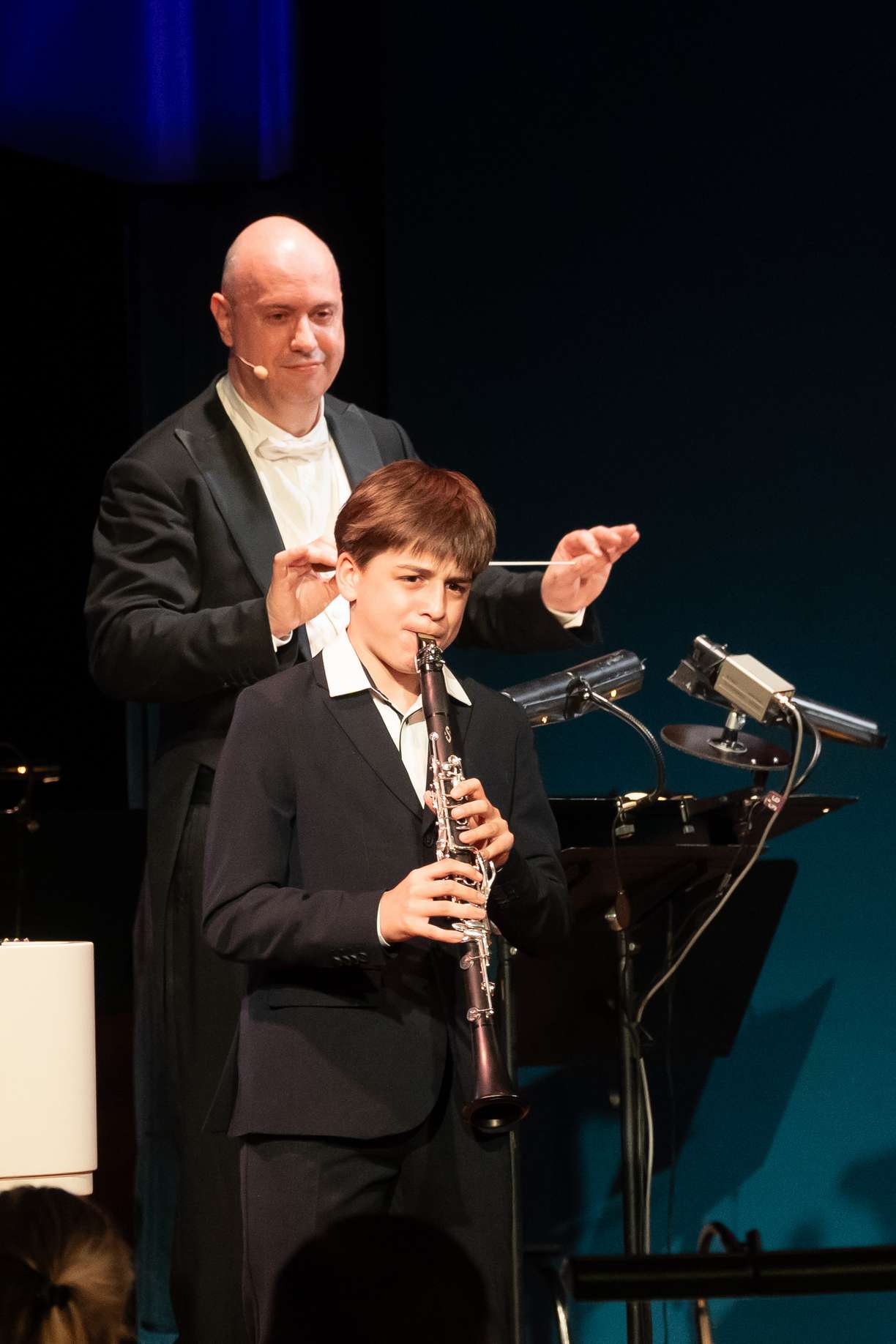 Открытием для многих стал 14-летний мультиинструменталист Андрей Зайцев, с которым юбиляр даже поделился титульным слоганом: «Маэстро умеет не только…» Они сыграли Концертное рондо Моцарта ре мажор для фортепиано с оркестром (KV 382), сменяя друг друга за роялем и за дирижерским пультом. Андрей при этом еще и играл на кларнете – основном своем инструменте (хотя на международных состязаниях не раз побеждал также и с блок-флейтой).