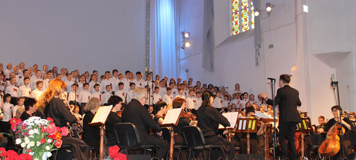 В сопровождении Калининградского областного симфонического оркестра, многие музыканты которого – это выпускники школы-юбиляра, хоровые коллективы исполнили произведения Г. Свиридова, П. Чеснокова, С. Франка и Л. Делиба. Нескончаемыми аплодисментами провожала публика сводный хор школы, исполнивший в финале концерта музыкальную композицию из песен А. Пахмутовой и П. Турчанинова, посвященную памяти военных лет.