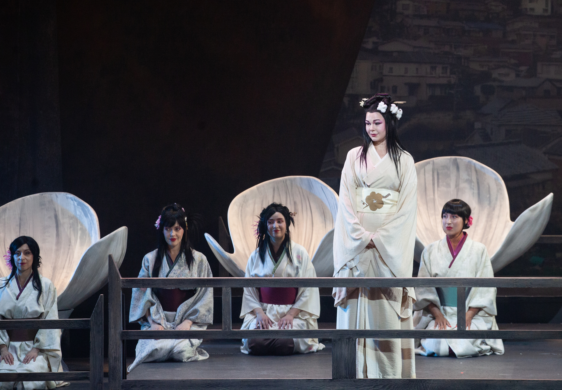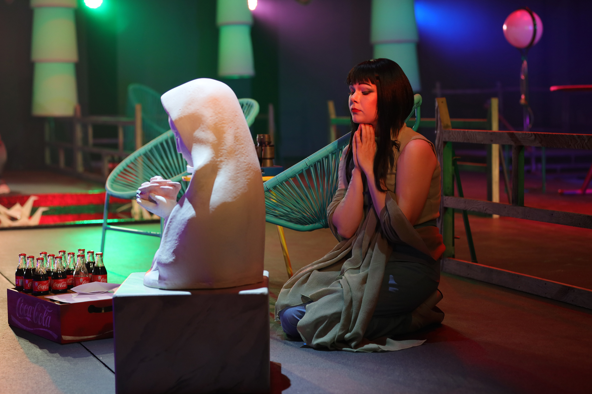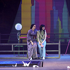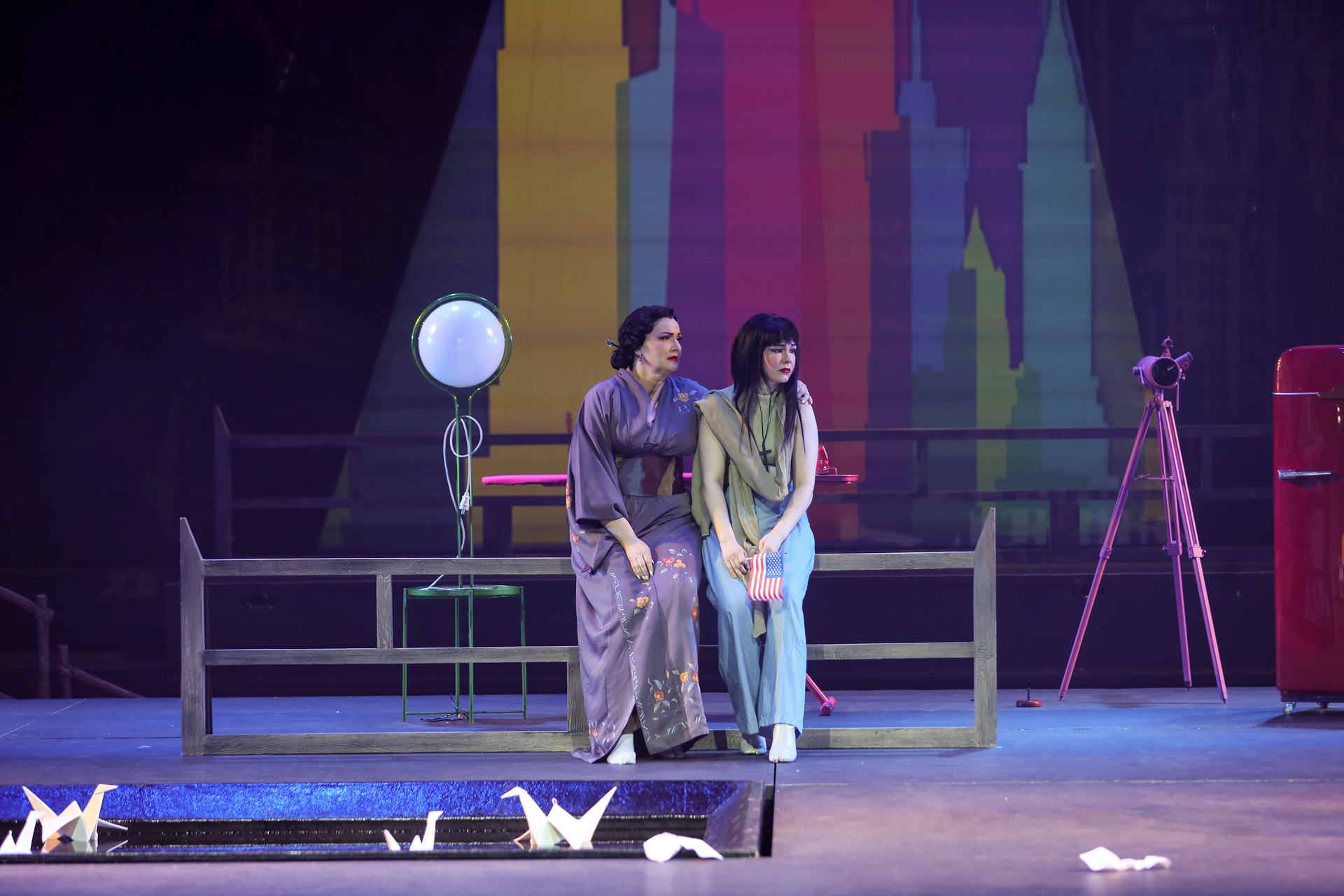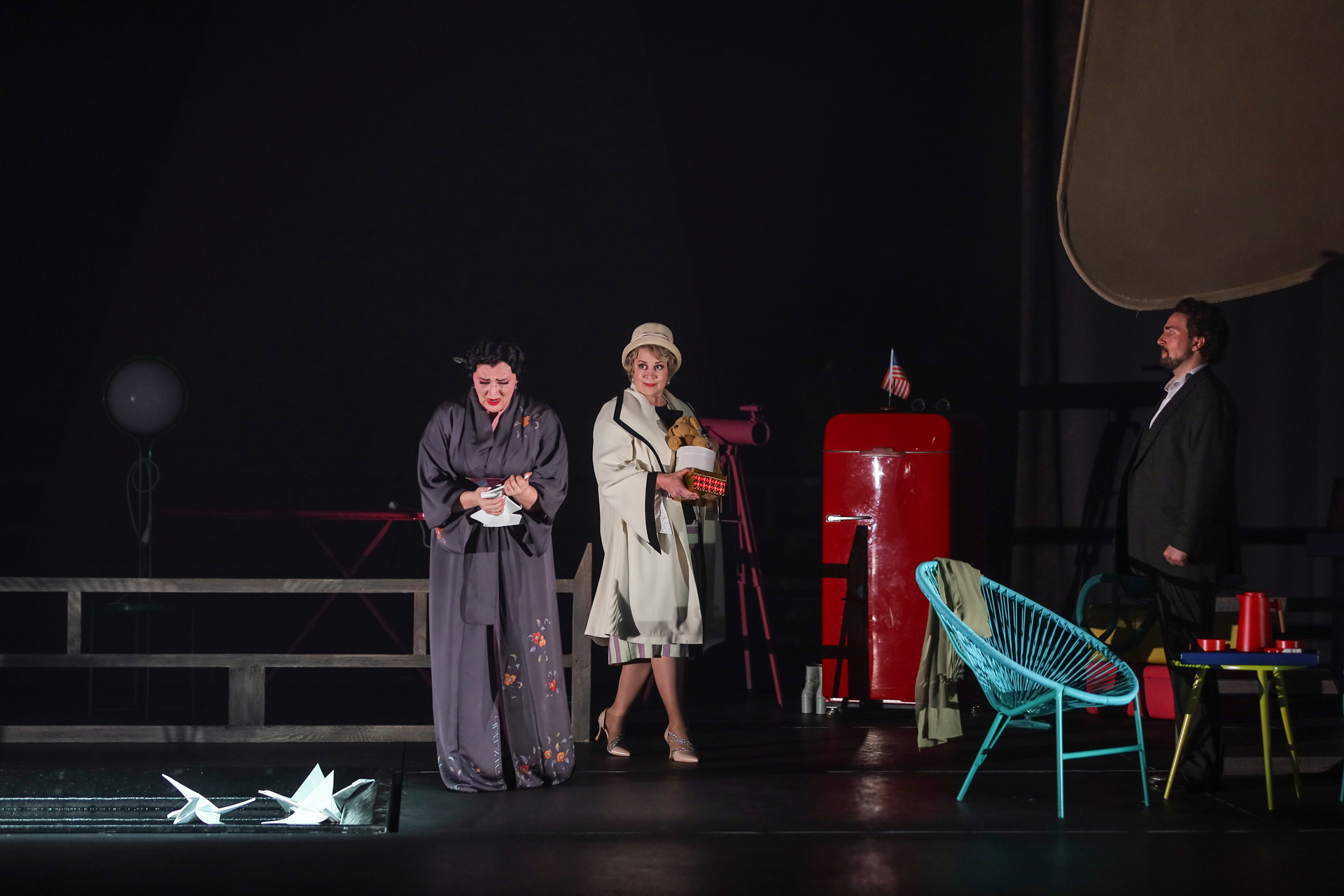 Претензию «Большому брату» выскажут даже в оформлении, набросав немало анилина во второй акт. К этому моменту героиня уже поменяла веру и манеры (вплоть до того, что американского консула теперь позволяет себе кружить в танце и даже невинно целовать), переоделась из кимоно в брюки и свитерок, а сверх того набила свой хрупкий домишко благами европейской цивилизации. Чтобы публика чего случайно не проглядела, гладильную доску с утюгом, электрочайник и холодильник выкрасили в ярко-красный. Из последнего доставали все, что угодно – сигареты, кинжал, каким закололся отец Баттерфляй, том, объемистостью похожий на Библию, – но не еду. У кого, может, и сердце защемит: голодает бедняжка. Однако на переднем крае – уполовиненная коробка с бутылками кока-колы, которой самое место в холодильнике. Но она не там. Наивная японка, похоже, так и не догадалась, для чего держат в доме этот чудо-агрегат. Главное – такие есть в Америке, ставшей для нее навязчивой мечтой. Про эту мечту вопиет здесь все, в том числе небоскребы, нарисованные в духе комиксов на заднике и абрисно – на прозрачных крылышках, свисающих со штанкетов как образный символ спектакля. Только такие не у бабочек и не у мотыльков (как переводят имя героини), а у известной «особы» из басни Крылова, что все пела и плясала, пока зима не накатила. Художники Ростислав Протасов и Алла Шумейко так представляют себе героиню?