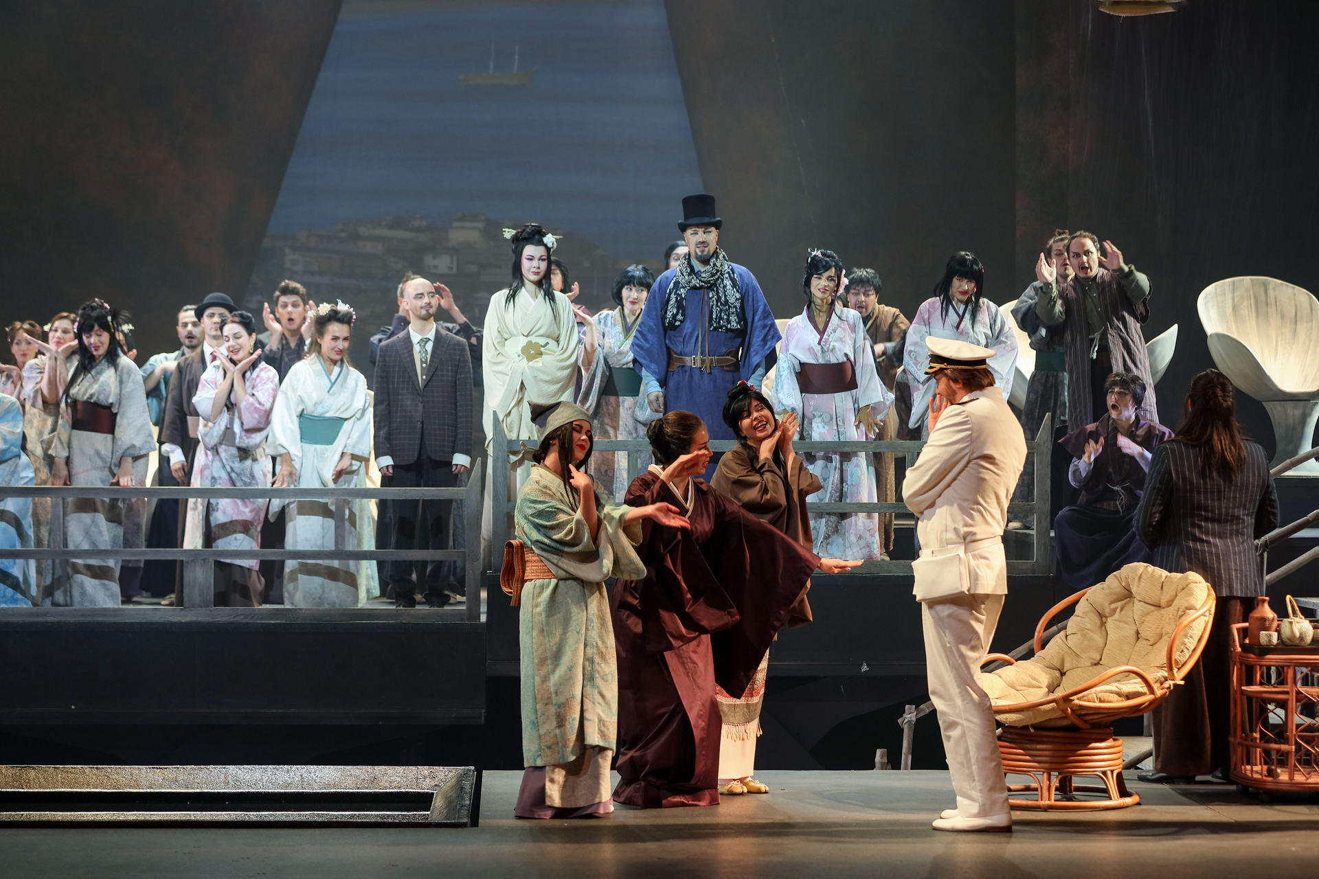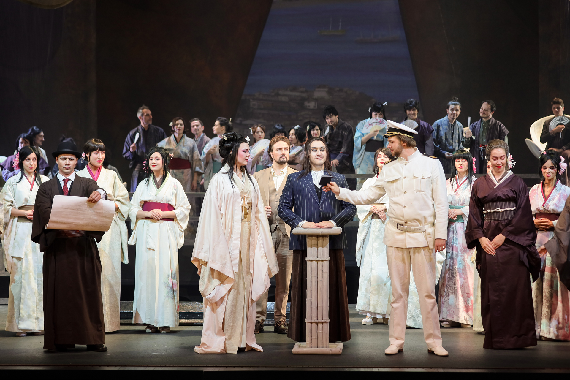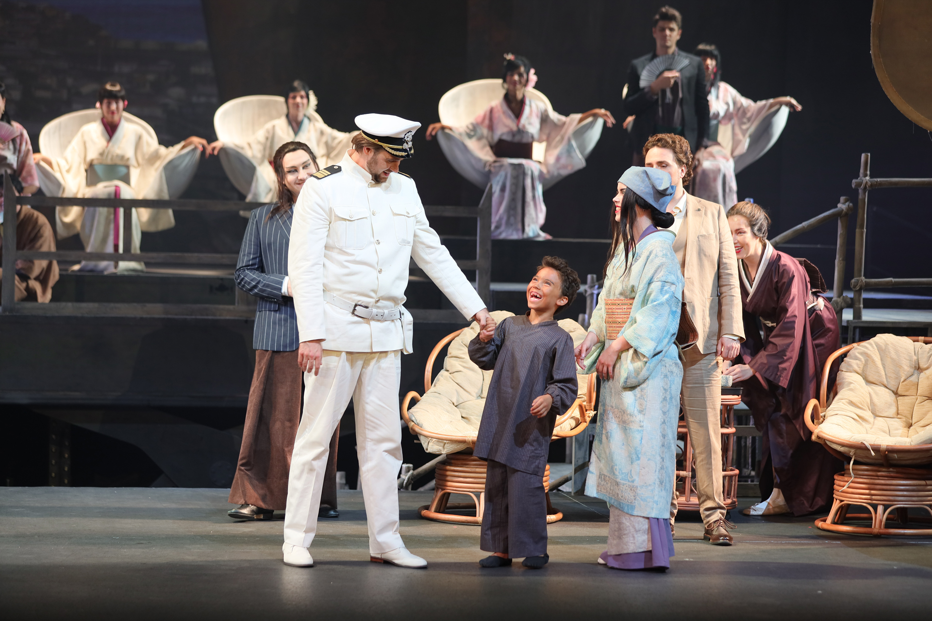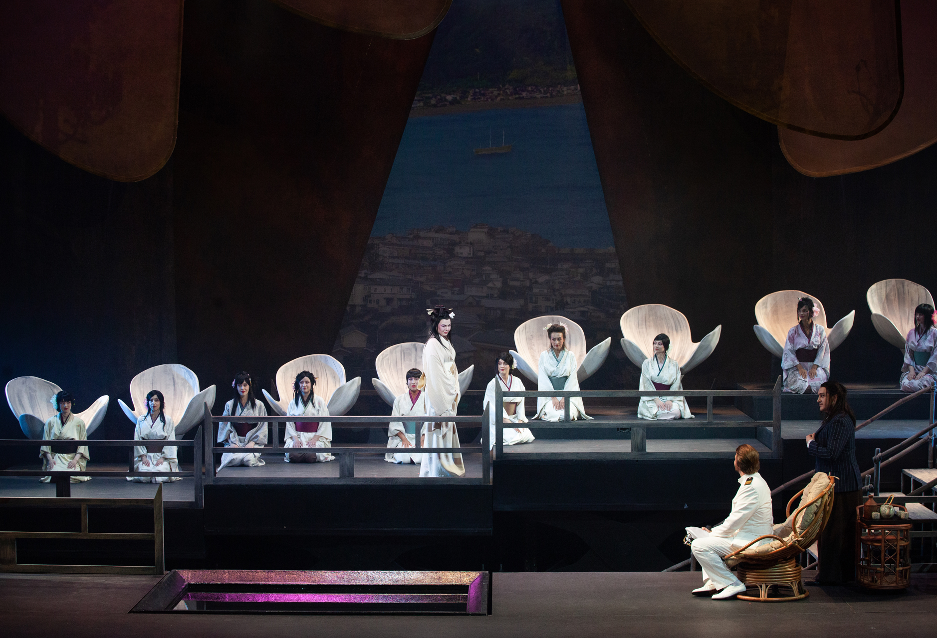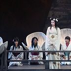 Революционных отличий между редакциями нет. В той, что триумфально ществует по свету 120 лет, полуторачасовой второй акт разбит на два, подужата сцена с многочисленной родней Баттерфляй, чуть сокращена ее предсмертная ария, а неприятному Пинкертону для смягчения образа подарен романс «Addio, fiorito asil», где найдутся осознание содеянного и даже муки совести. Как ни крути, все изменения – только к лучшему. Поэтому браться за первоначальную редакцию есть смысл в двух случаях: если требуется пиар-ход, подогревающий интерес к постановке, и если в упомянутых отличиях хочешь отыскать нечто, позволяющее по-новому взглянуть на шлягер шлягеров. Постановщика спектакля Дмитрия Бертмана, кажется, занимали обе задачи. В самом деле: почему бы не возбудить те же волнения, что вызвала в обществе первоначальная увертюра к «Аиде», добытая театром из потаенных закромов истории? И почему не вплести свой голос в интернациональный хор «Янки, гоу хоум!», разворачивающийся сегодня в стремительном крещендо? Первая версия оперы к этому определенно подвигает.