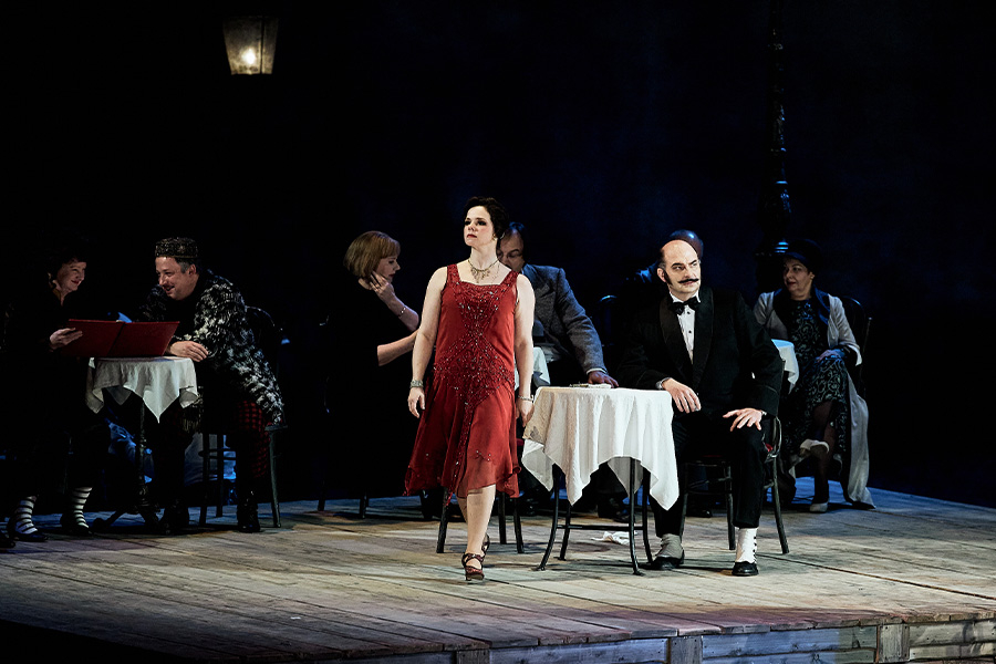 Спектакль – самая что ни на есть классическая «Богема»: с огромными окнами мансарды в крайних картинах, пестрым Латинским кварталом и весьма натуралистичной парижской заставой с циклопической решеткой, перегораживающей всю сцену, в средних картинах. Элемент новизны – лишь в переносе времени действия, о чем свидетельствуют костюмы героев. На сцене явно 20-е годы прошлого века: сдвиг на сто лет вперед по нынешним временам не придает интерпретации никакой остроты, она воспринимается как старая добрая классика.