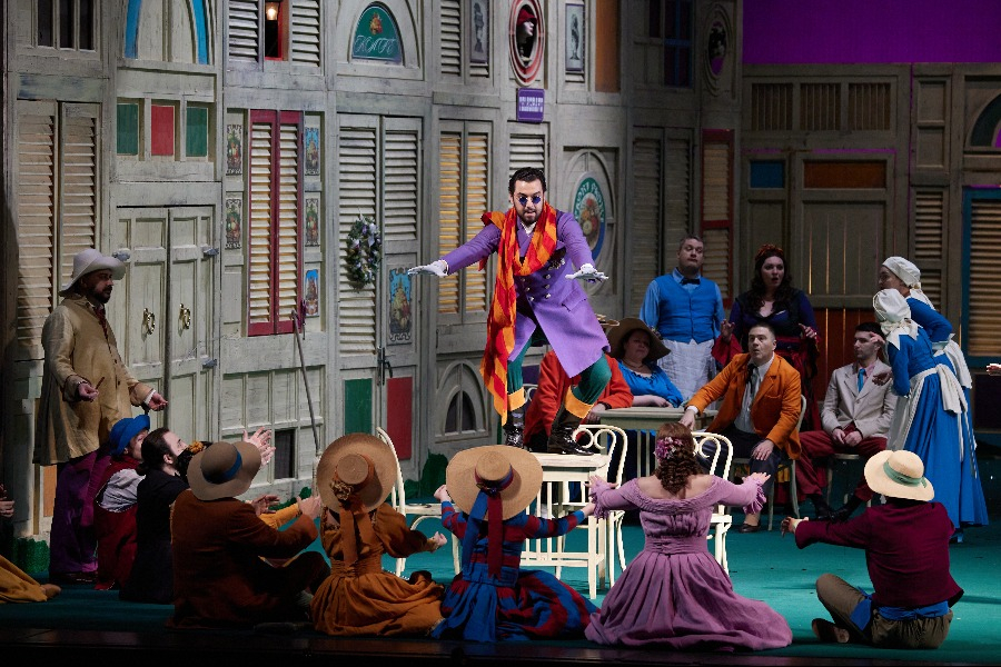 Пестрые и яркие костюмы Владимира Фирера – неопределенной эпохи, но явно про что-то старинное – радуют глаз. Разноцветье на бежево-синем фоне – оптимистичная тональность спектакля, в котором маститый режиссер уделил главное внимание актерским работам. Его Неморино – совершенный недотепа: он не просто традиционный увалень-тюфяк, какого обычно изображают в этой роли, но аутсайдер, буквально метущий улицы метлой. Его Адина – утонченная провинциальная кокетка, умная, но с самого начала не бездушная: теплая линия в ее поведении по отношению к тенору-неудачнику присутствует с первого появления. Его Белькоре – выдающийся позер и хвастун, павлин до мозга костей, к тому же сильно глуп, но не дурак по женской части. Его Дулькамара – эффектный аферист, шоумен, маркетолог от бога, профессионально «разминающий» простодушную провинциальную публику. Его хор-миманс – не безликая толпа, а соцветие индивидуальностей: каждому участнику дана своя роль. Петров ставит комедию без обиняков – опереточно у него канканируют даже солдаты в финале. А чего стесняться? Если смеяться, то напропалую!