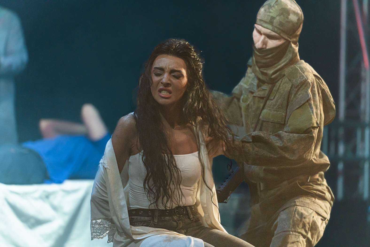 Спорным моментом видится добавление еще одного, помимо прокофьевских, пласта-плана – явных визуальных параллелей со специальной военной операцией на Украине. Этому в немалой степени противится и литературная основа, и музыкальный строй оперы Прокофьева, рассказывающие о реалиях совсем другой войны. Видео-мэппинг чередует вполне нейтральные с исторической точки зрения военные фоны с картинками из зоны сегодняшнего конфликта, в костюмах героев царит эклектика, немалое место занимают современные одежды, армейский камуфляж и вооружение «из наших дней». Герои пользуются гаджетами – этот штрих, скорее, добавляет курьеза, нежели актуализирует постановку. Поведенческая пластика героев (особенно героинь – например, Ольги и Клавдии) с головой выдает в них людей XXI века, что плохо сочетается с музыкальной атмосферой. Однако «новшества» не создают принципиального контрапункта к произведению, не способны его существенно «переинтонировать», и в целом постановка воспринимается как вполне добротный спектакль о событиях именно Великой Отечественной войны – просто с добавлением не всегда уместных реалий.