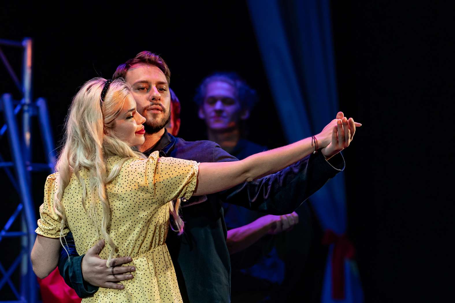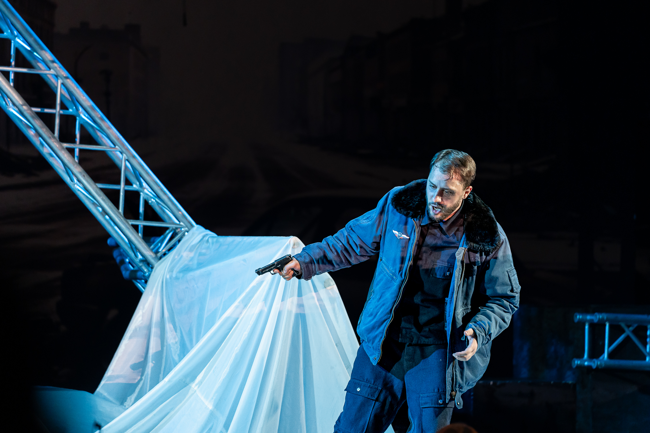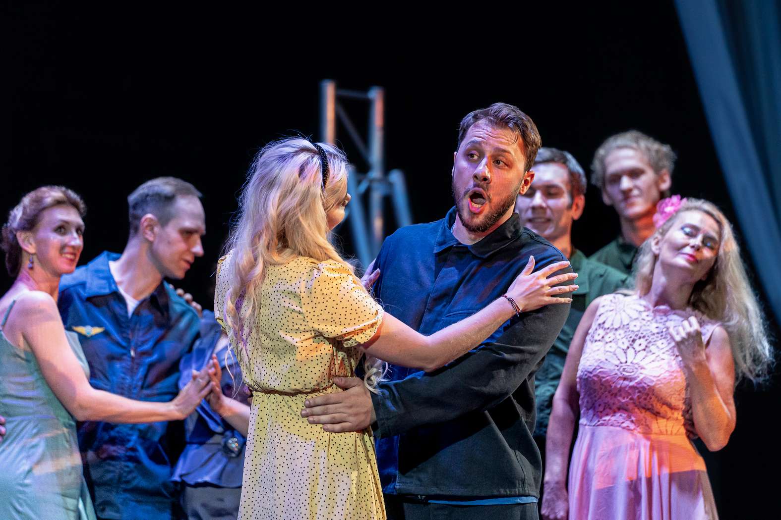 Режиссер Андрей Цветков-Толбин, художники Федор Архипов (сценография), Анна Топуридзе (костюмы), Татьяна Белоненко (декорации), Дмитрий Козин и Сергей Машуков (видео-мэппинг) сумели малыми средствами и на не слишком приспособленной для оперных целей площадке создать полноценный спектакль. Черную глубину сценической коробки «украсили» белые ткани, имитировавшие то заснеженный лес, то больничную палату, и абрисы металлических конструкций – сначала самолет пикирующий, а потом – победно рвущийся в небо. Действие отличалось динамизмом и продуманностью деталей. Режиссеру удалось реализовать заложенный в партитуре «кинематографический» эффект многопланового повествования, где периодически наслаиваются друг на друга реальные события и размышления героев; не откажешь ему и в умении ставить массовые сцены – убедительно сделаны танцевальные номера (фокстрот, румба), деликатно проведена линия хирургической операции и инвалидности Алексея (метафорично, без излишнего натурализма). В спектакле много актерских удач, выразительных зарисовок, что говорит о тщательной работе постановщика, умении сформулировать актеру-певцу сверхзадачу и добиться ее вдохновенного исполнения.
