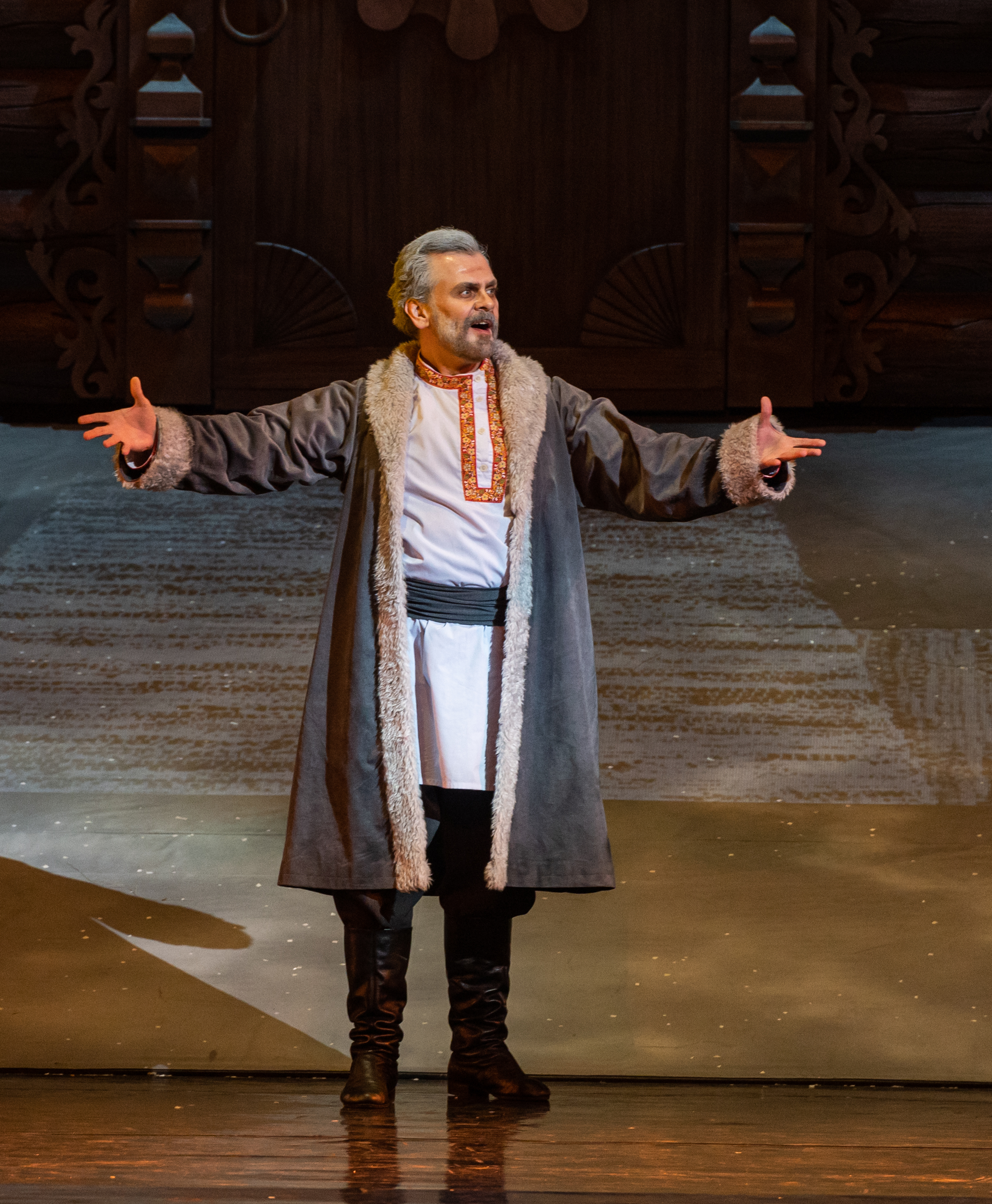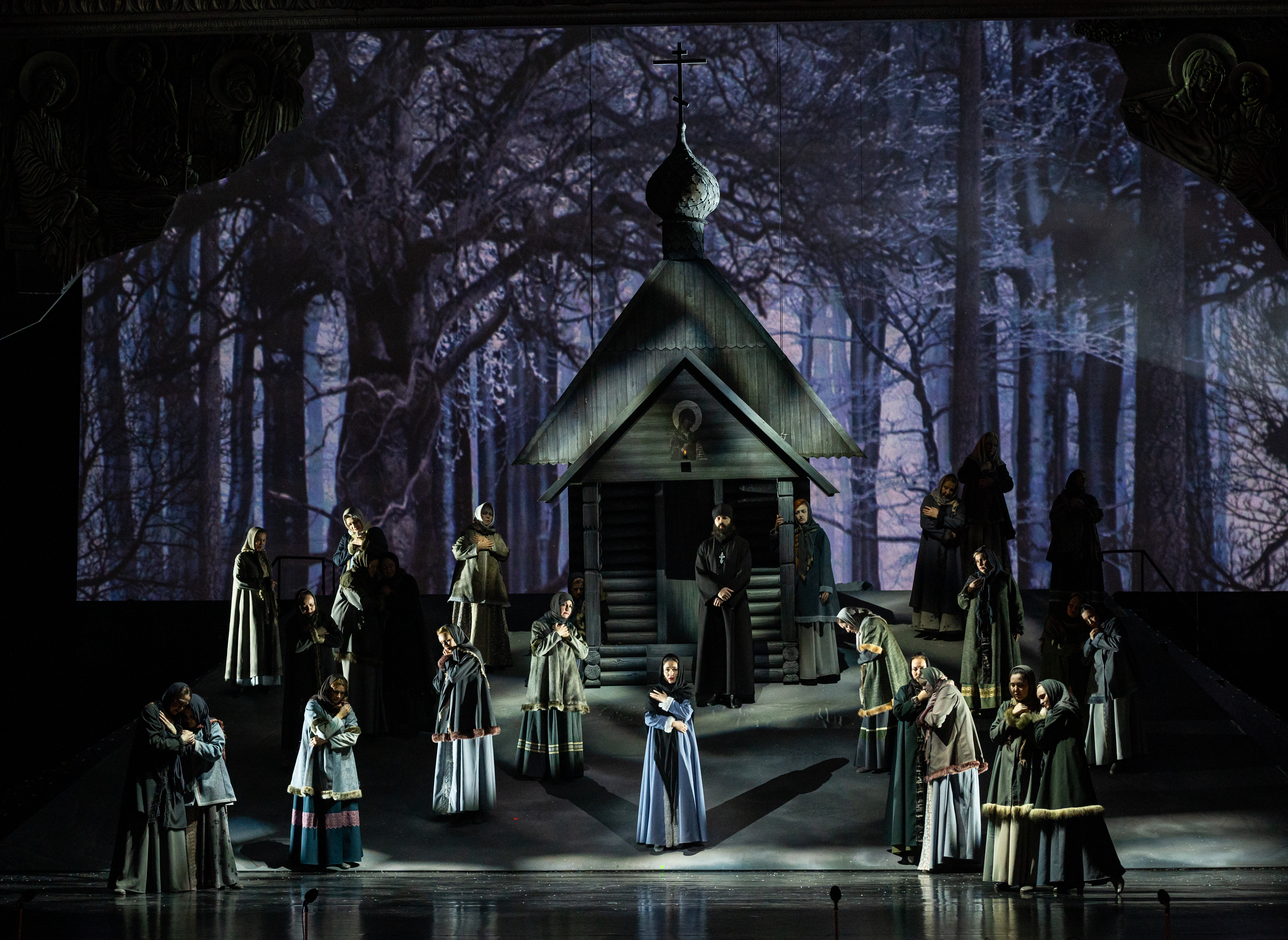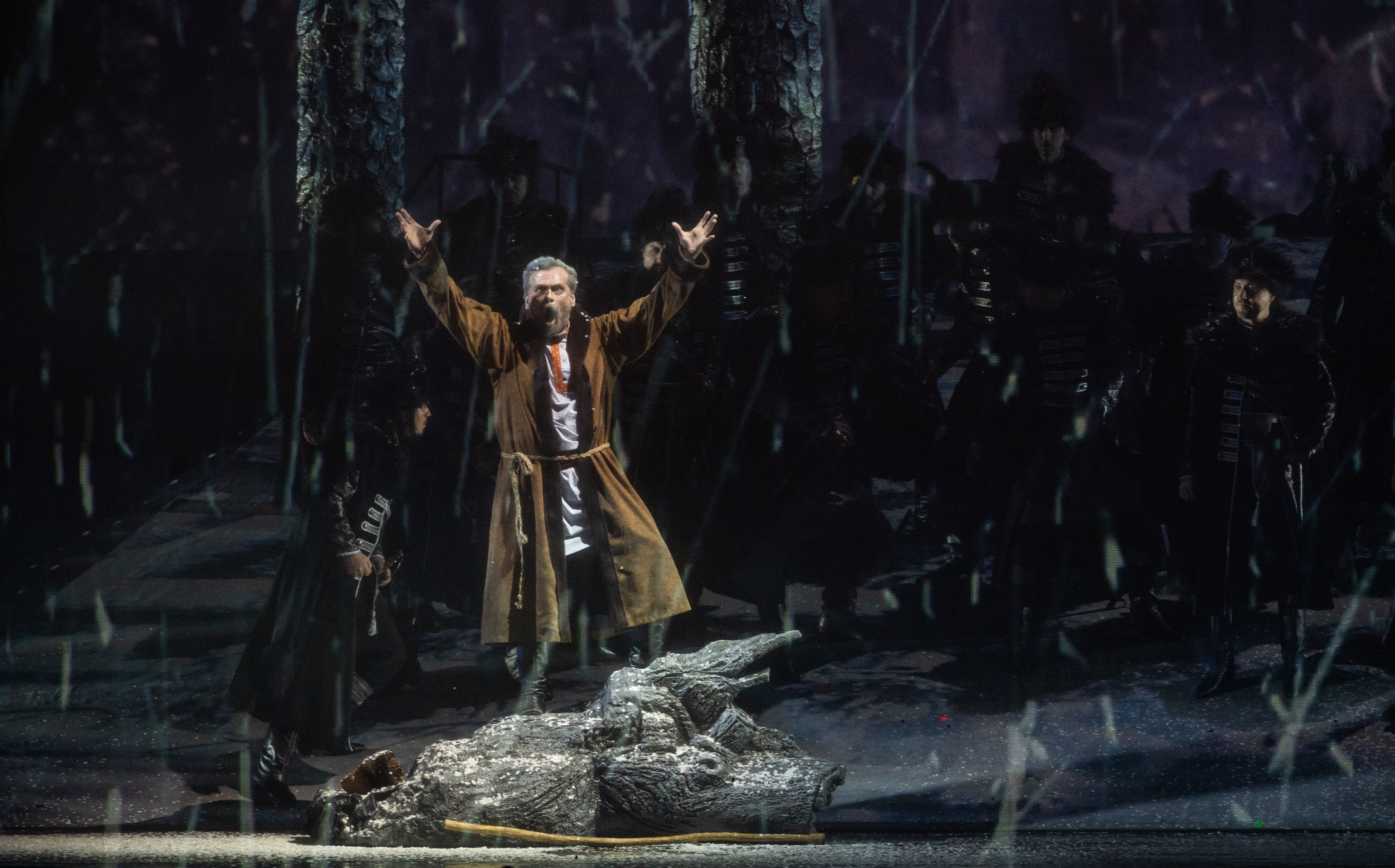 Эти два момента несколько разочаровали, но не испортили целостного впечатления от спектакля, который, конечно, получился у команды постановщиков — помимо режиссера Александрова, это еще художник Вячеслав Окунев, световик Ирина Вторникова, видео-художник Виктория Злотникова, балетмейстер Надежда Калинина. Они выбрали формат исторического костюмного представления, погружающего в героическую эпоху Смутного времени. Наклонный подиум сцены и массивная рама во все ее зеркало создают иллюзию живой картины, ожившего живописного полотна. С помощью колоритных видеопроекций реалистично воссозданы многочисленные локации — село Домнино, панская Польша, изба Сусанина, лесная чащоба с лютой метелью, величественный Ипатьевский монастырь, торжественная кремлевская панорама. Стильные костюмы передают дух эпохи, в них Окуневым подчеркнут национальный колорит противоборствующих сил — русской и польской. Основной колер сценической картинки — приглушенный, почти монохромный, словно мы рассматриваем гравюру. Лишь в финале ярко вспыхивают праздничные цвета, усиливая духоподъемный мотив, с блеском реализованный Глинкой в знаменитом «Славься!».