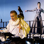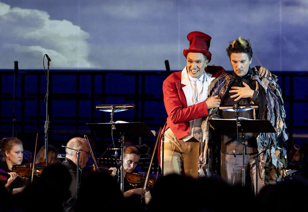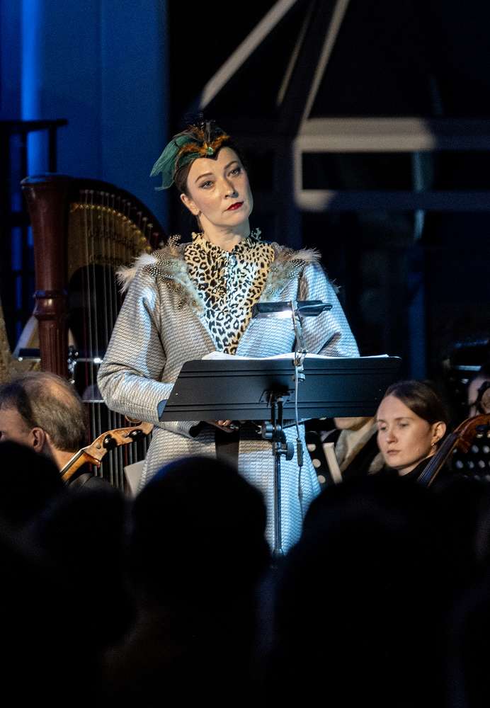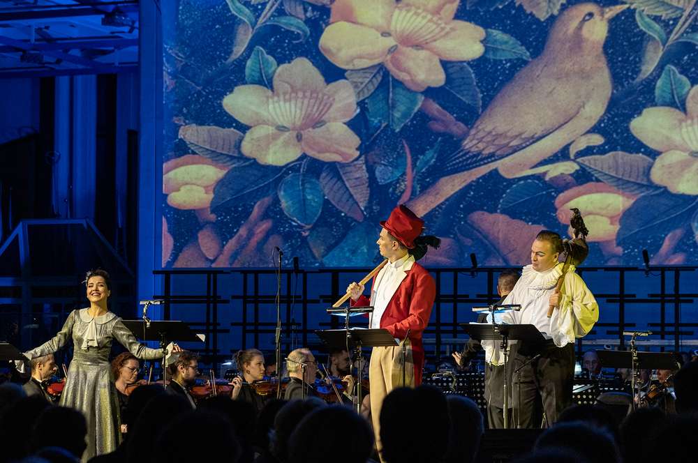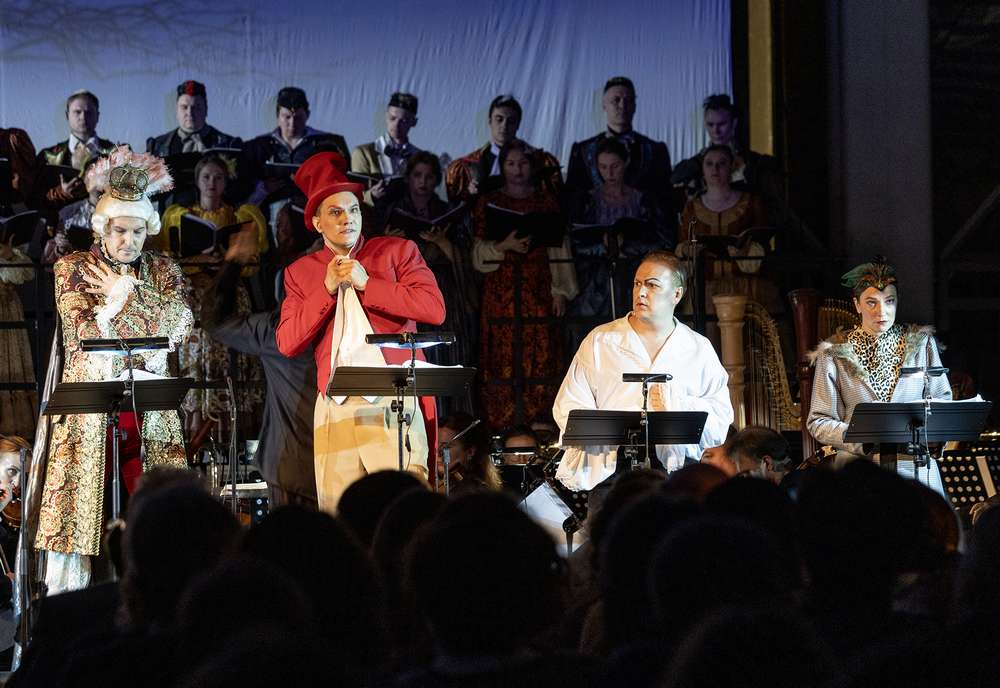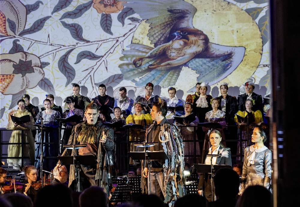 Первое знакомство с «Птицами» прошло на очень высоком уровне. Оркестр под руководством Артема Макарова звучал сочно и вдохновенно, полностью отвечая задаче воплощения позднеромантического опуса, где важны и мощь, и яркость, и красочность, и точность. Колорита добавил ветродуй – специально сделанный в театре для изображения разгула небесной стихии. Солисты хотя и стояли в строго концертном формате в линеечку за пюпитрами и пели по нотам, одеты были в причудливые «птичьи» костюмы, а сами партии были выучены на совесть; также чувствовалась большая фонетическая работа – практически у всех немецкое произношение оказалось отличным. Особо стоит отметить безупречную виртуозность Анастасии Лебедюк, с блеском справившейся со сложнейшей партией Соловья. Сопоставимую по трудности партию Хоффегута добротно исполнил тенор Петр Сизов. Очаровательна была Ольга Бутенко в партии Королька – не столь виртуозной, как у Соловья, но также весьма поэтичной. Харизматичный Алексей Красовский блеснул в партии Орла. Профетические инвективы грозно кидал в зал Владислав Дорожкин (Прометей).