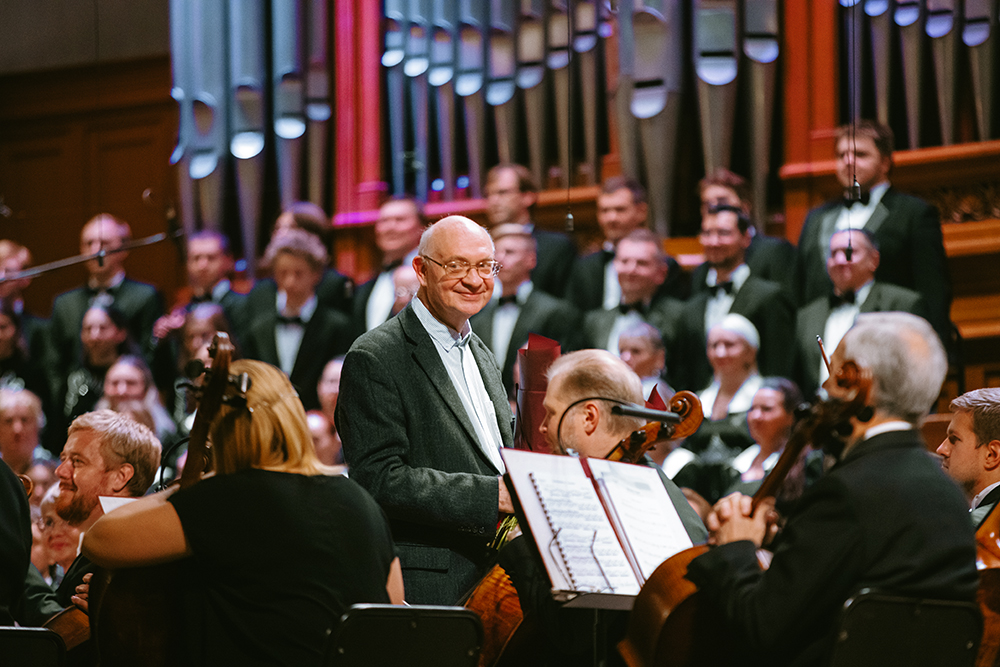 Ефрем Подгайц давно уже вошел в когорту живых классиков, причем в его случае прилагательное «живой» даже важнее существительного. Он не выглядит на свои годы, неизменно улыбчив и доброжелателен, да и его музыка в массе своей носит столь же светлый характер. Среди композиторов, большую часть творчества адресующих детям, у него по-настоящему и нет конкурентов. Лучшие детские оперы Подгайца много лет украшают репертуар Театра им. Н.И. Сац («Дюймовочке», к примеру, скоро исполнится тридцать), идут они и на других сценах. Не столь счастливо сложилась судьба «взрослых» сочинений, особенно театральных. Интереснейшая опера «Лёд-9» (по роману К. Воннегута «Колыбель для кошки»), написанная почти двадцать лет назад и вполне актуальная, так до сих пор и не поставлена. А премьера Четвертой симфонии (оконченной в 2016 году) состоялась только теперь, на этом концерте.