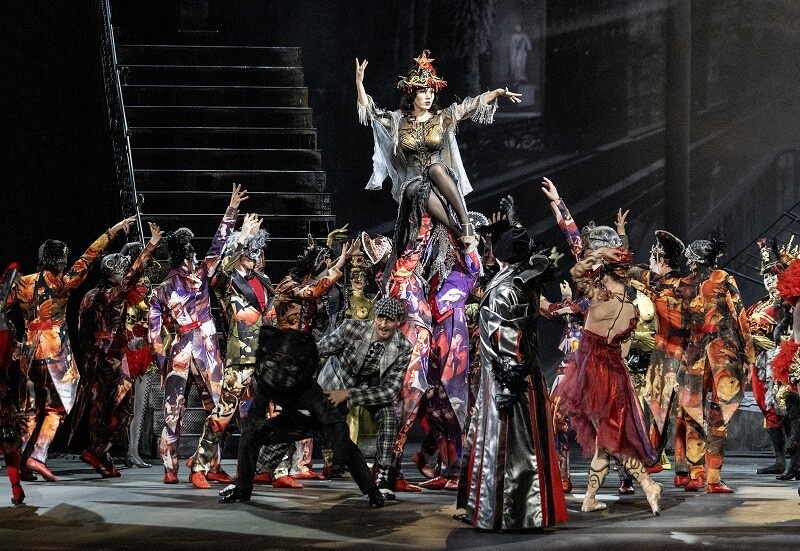 Сценографическая основа ершалаимских сцен – три взметнувшиеся вверх лестницы, увенчанные распятиями, на которых казнят Иешуа (Георгий Цветков) и двух разбойников – Гестаса (Виктор Кондратюк) и Дисмаса (Евгений Саврасов). На авансцене восседает колоритный Пилат – в латах и пурпуре, с посеребренной сединой мощной шевелюрой, в облике которого при желании можно угадать сталинские черты: невероятно глубокая и объемная роль Степана Волкова. Главный элемент московских сцен – огромный трамвай, тот самый, который отрезал голову Берлиозу (в опере персонаж не имеет имени, он назван Здравомыслящим – в этой роли Анатолий Невдах): внутри него под лозунгом «Искусство принадлежит…» заседают критики, анафематствующие Мастера (Виктор Боровиков).