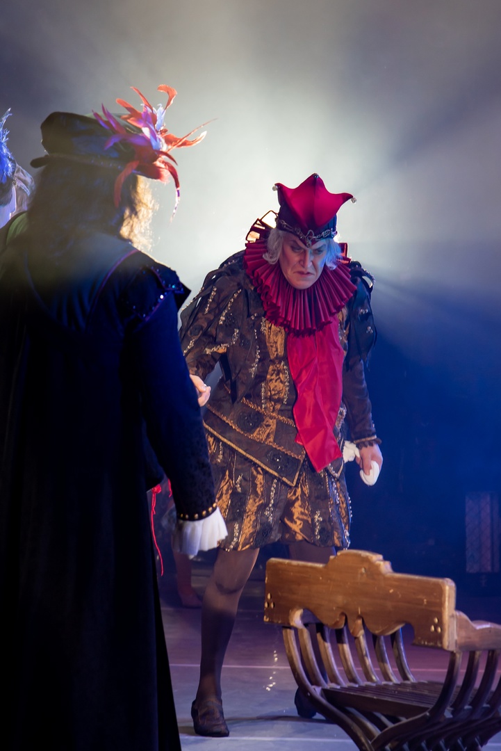 Поднимается «супер», и мы видим пышный герцогский двор — со статуей золотого коня, на которую взгромоздился ехидничающий шут, с изящным троном, с темно-красными портьерами, волнами нависающими с колосников. В центре этого «винегрета» — стройный молодой красавец: вот он Герцог, антигерой. Контрастом к нему — седовласый Риголетто с положенным горбом и опухшими коленями, в красном колпаке с бубенцами, с куклой-маской на палочке. Двор полон высокородными бездельниками: костюмы массовки эклектичны, условно старинные, но однозначно говорят о статусе их носителей (художник Аделина Злобина).