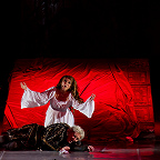 «Риголетто» в Ижевске – это не только адекватная режиссура, но и убедительная музыкальная интерпретация. Несмотря на акустическую неблагоприятность зала, которому нужны постоянные микрофонные «подпорки», очевидна состоятельность вокального состава спектакля. Неистовым, но при этом очень добротным, академичным и выразительным оказался Риголетто Сергея Гордеева — певец проживает роль с огромной отдачей, а партия сделана у него превосходно, на уровне мировых стандартов. Его объемный и гибкий баритон, которому подвластны тысячи нюансов, звучит поистине впечатляюще. Басовой фундаментальностью веет от Спарафучиле Рустама Касимова — низкие ноты завораживают, а колоритный облик помогает артисту играть брутального бандита, тем не менее не лишенного благородства. Яркое сопрано Альбины Гордеевой убедительно справляется с верхушками непростой партии Джильды; присущая ее тембру теплота усиливает трогательность образа юной жертвы. Из главных героев, пожалуй, лишь Михаил Меньшиков в партии Герцога вызывает вопросы: сочный, тембристый, откровенно красивый голос артиста не до конца технически огранен, отчего нередки проблемы с интонированием, а предельные верхние ноты порой выходят с неприятным треском. Певец обладает выигрышной внешностью, для теноров-любовников не только благодатной, но и редкой, с его природными данными можно сделать очень многое, покорить не одну сцену, но голос еще требует значительной работы. Ансамбль протагонистов замыкает Ольга Ушакова в партии Маддалены, чье выступление — где-то посередине между лидерами и не вполне получившимся Герцогом: не всегда хватает яркости звукового посыла, хотя в целом артистка провела роль музыкально и с хорошим ансамблевым чутьем.