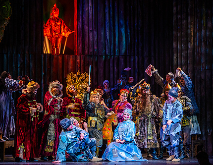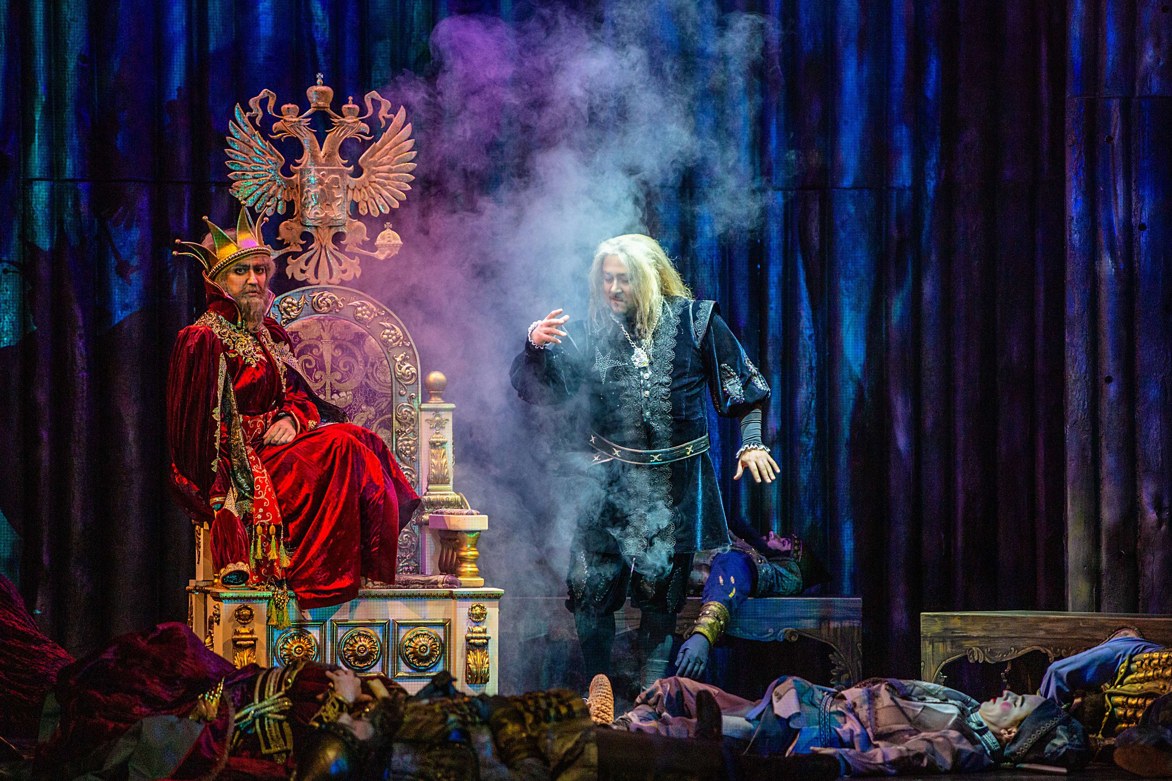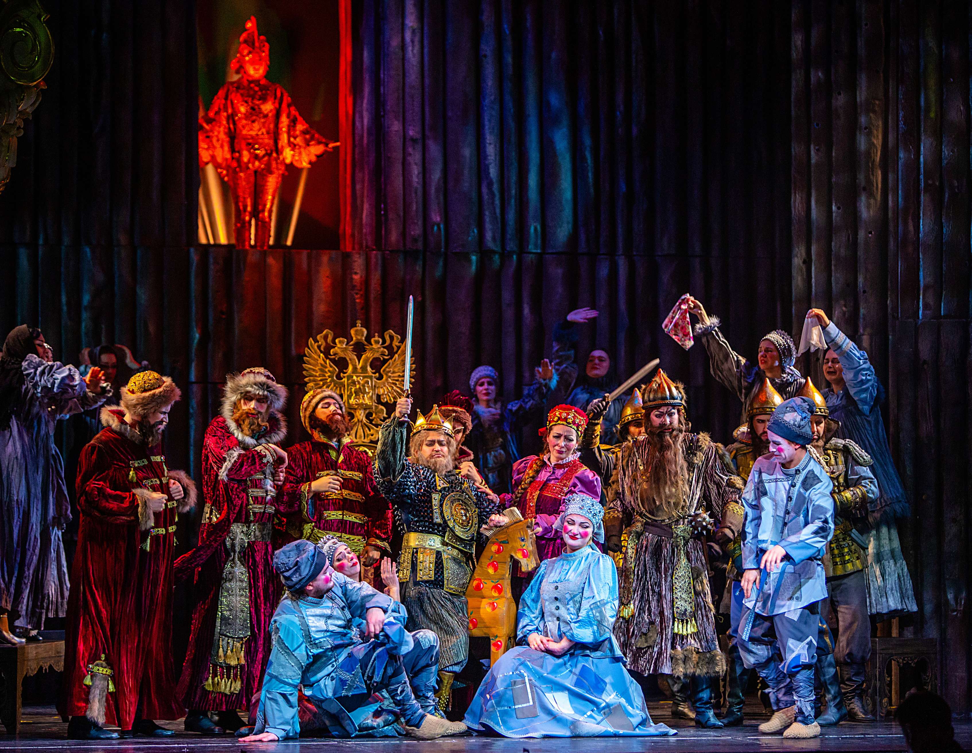 Театр подошел абсолютно подготовленным к исполнению сложнейшей оперы русского репертуара, в которой есть элементы экспрессионизма и очевидного прозрения самых смелых музыкальных экспериментов ХХ века. Оркестр под управлением Максима Валькова преподносит все красоты выдающейся партитуры, при этом выстраивает баланс с солистами так, чтобы не подавлять их даже в моменты предельного буйства чувств и красок. Среди качественных солистов стоит особо упомянуть блистательную Марию Бочманову, певицу с крепким голосом, легко справляющуюся с колоратурными тонкостями партии Шемаханки, сделавшую свою героиню коварной, решительной, а местами не просто злой, но устрашающей: ее мощные звуковые акценты напоминали о вокальном письме Пуччини или Рихарда Штрауса. Убедительно спеты сложнейшие предельные верхи Денисом Ахметшиным — Звездочетом; внятно прозвучали предельные низы у Кирилла Иванова — Полкана. Томные интонации были колоритны у глубокого меццо Кристины Метелицы (Амелфа); призывные возгласы Алины Николаевой — Петушка будоражили слух. Валерий Каула предстал вокально ярким и игрово «размятым» Додоном, что по праву делало его центром всего повествования.