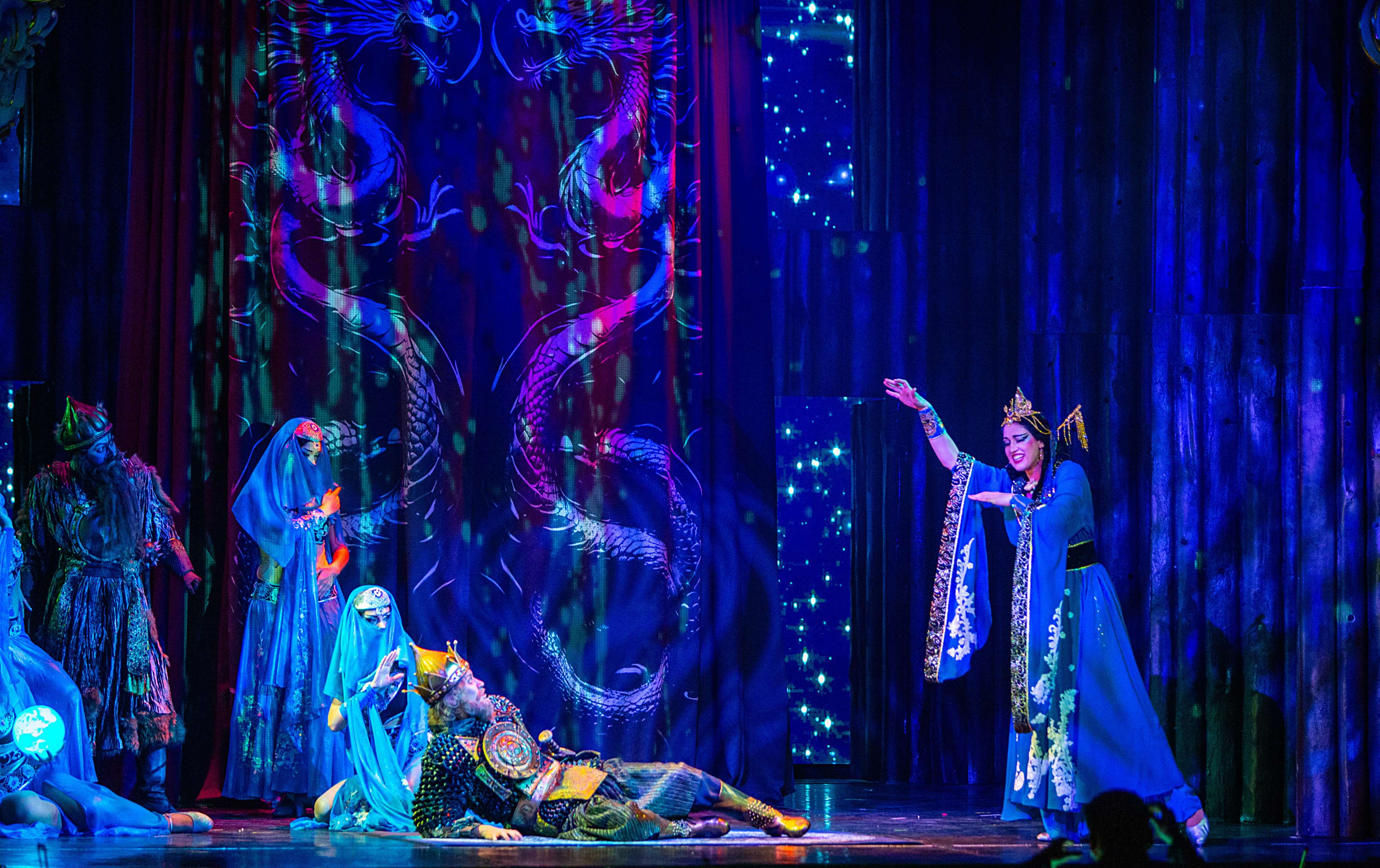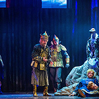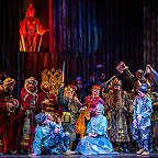 Впрочем, Восток в спектакле весьма условный — в оформлении сцены и в костюмах присутствует эклектичное смешение: китайские драконы на пологах шатра и явно арабо-персидские костюмы на танцующих прислужницах Шемаханки, чьи томные па расцвечивают второй акт — пародийное соблазнение Додона (хореограф Васил Панайотов). Зато крайние русские акты даны без обиняков — Додонова Русь у маститого Вячеслава Окунева вполне конкретна, поскольку сцена сплошь зашита бревнами, костюмы что героев, что массовки — подчеркнуто «отечественного производства», кроя и фасона, отсылающих к русской старине, пусть и универсально-обобщенной.