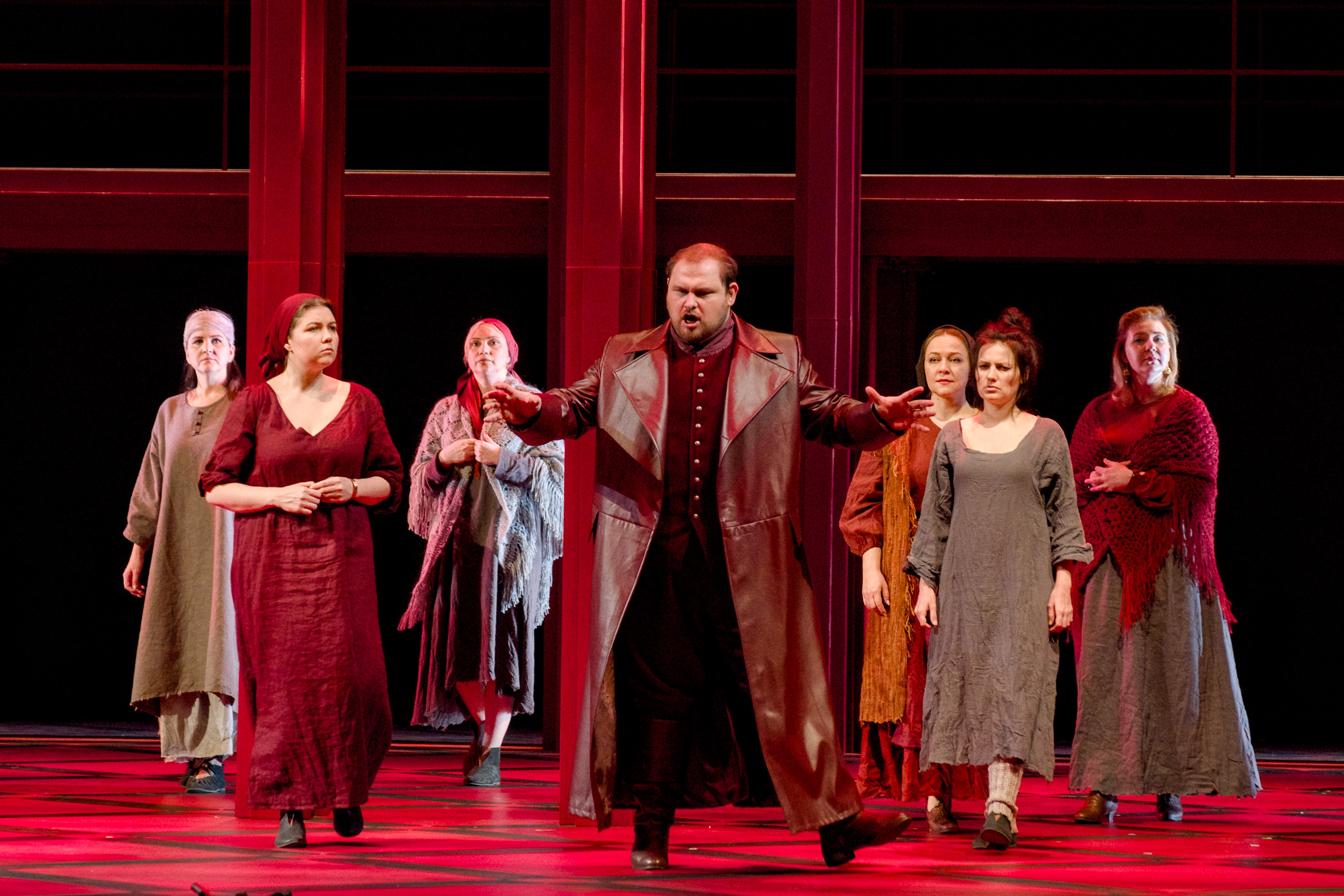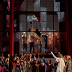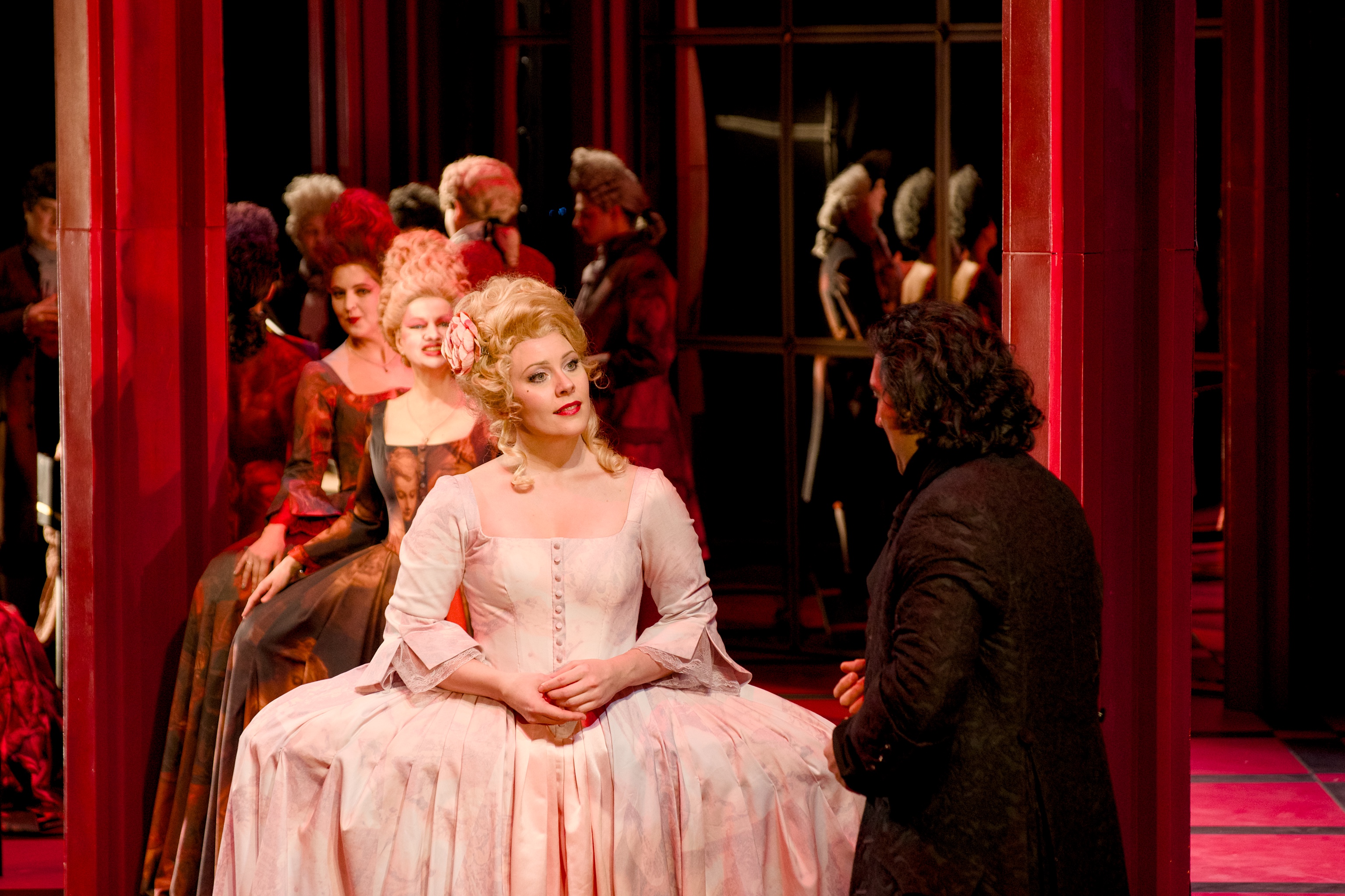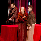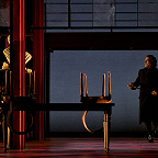 Московская постановочная команда в превращении «Шенье» в сценический шедевр преуспела не слишком, явив перво-наперво известную коллизию под названием «лебедь, рак и щука». Художник Александр Боровский эстетствовал. От него здесь красная стильная конструкция-клетка, в которую определенно просится что-то авангардное или эфемерное. Но нет. «Въедут» сюда исторического вида костюмы (плюс одна комиссарская кожанка), плотный, временами зашкаливающе экзальтированный звук и действо в так называемом традиционном духе. Самых животрепещущих для постановки аспектов коснемся особо.