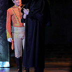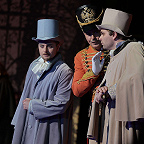 Какой век в их «Пиковой»? Судя по выходу в сцене бала Екатерины Второй при полном параде (платье с кринолином, белый пудреный парик, алая орденская лента через плечо), действие соответствует либретто Модеста Чайковского. Если же посмотреть на прочую публику, на костюмы военных и гражданских, то это явно 1830-е – то есть все так, как задумано у Пушкина. Причем цветовая гамма удивляет своей смелостью – один оранжевый мундир на Томском чего стоит! Костюм же Германа вообще необъясним – герой приходит в современной черной тройке, словно солист, исполняющий его партию, случайно зашел на спектакль после только что состоявшегося концерта в Минской филармонии. Но апофеозом безвкусицы выглядят костюмы хора и миманса в сцене бала – одетая во все золотое (платья, сюртуки, цилиндры и пр.) массовка напоминает какой-то восточный ритуал: возможно, идея состояла в подчеркивании статуса, богатства петербургского высшего света, но на поверку получился жуткий китч.