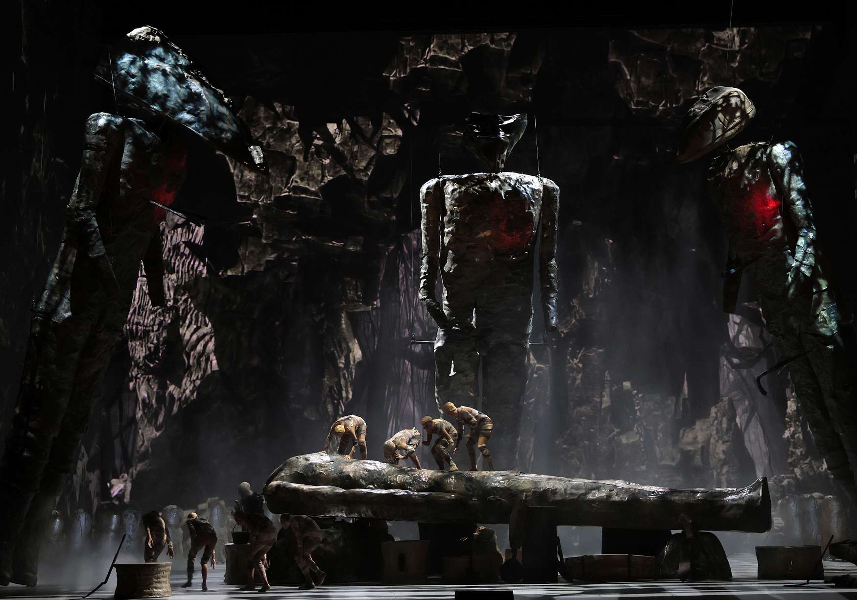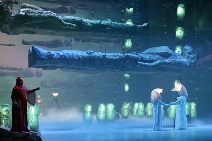 Видеокартины, «расцветающие» на трех пустых стенах вокруг сцены, завораживали. С их помощью нас эффектно спускали в недра земли к гномам и отправляли в заоблачные выси к небожителям. Мы лицезрели бесконечную красоту подводного царства рейнских русалок, небесные катаклизмы с прямо-таки всамделишными молниями и тысячи изгибов ужасающей змеи, в облике которой куражился главный гном оперы Альберих. Волшебство да и только (разумеется, не из сверхестественных туманов явившееся, а сотворенное по воле Гергиева, объявленного автором концепции обновления, и руками умельцев из студии «Шоу консалтинг»). А только эти чудеса дополненной реальности в два счета задвинули на вторые роли тех, кто прежде был на первых, - гигантских истуканов.