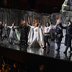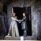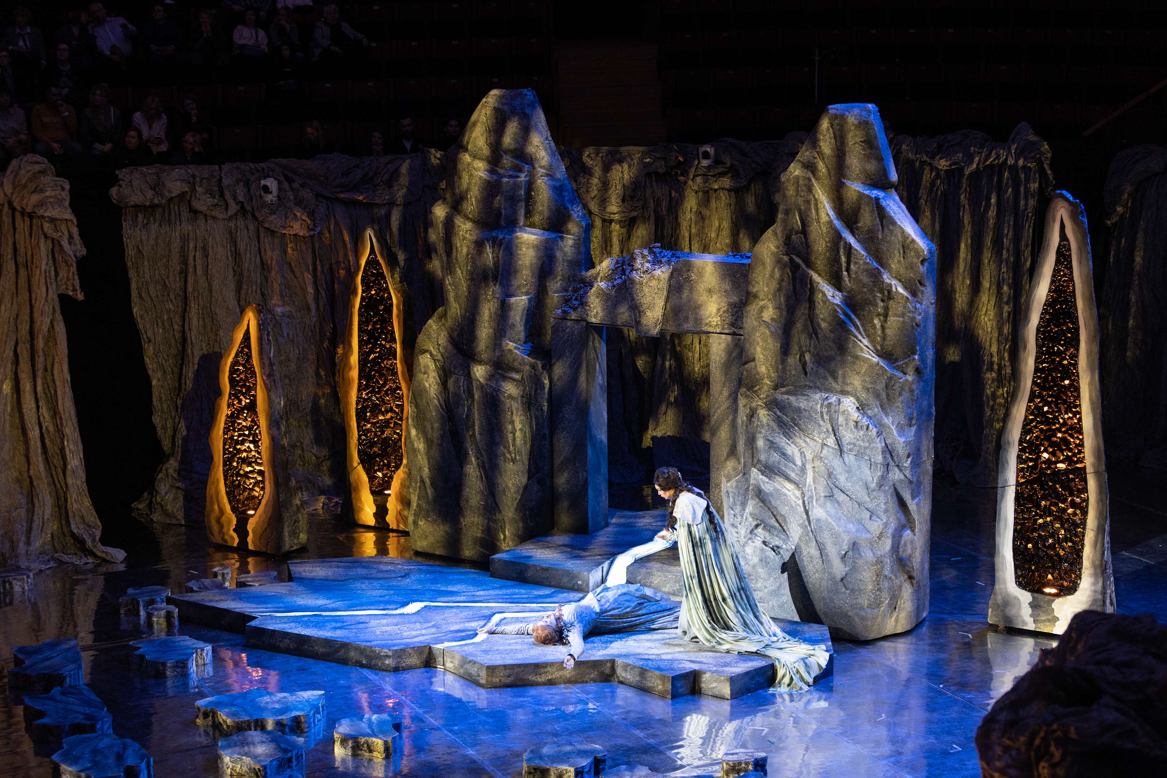 Мучить себя труднейшей задачей по организации открытого со всех сторон пространства постановщики не стали, а возвели полукружьем спасительный задник и уложили в выгороженное пространство огромные глыбы, которые были здесь то за утесы, то за стены древнего замка, а то за «корабль», в финале при нажатии нужной кнопочки увозивший тело Тристана и стоящую рядом Изольду в мир иной. Красоты эта сцена была неописуемой, потому что прикрыла героя его возлюбленная собственным безразмерным, из чего-то пенно-белого плащом, и его край эффектно «растекался» вослед уплывающему кораблю. Ко всему была она не только под стать пронзительно-печальной музыке, звучащей в эти минуты, но и единственной, по интонации хоть как-то родственной Бёклину.